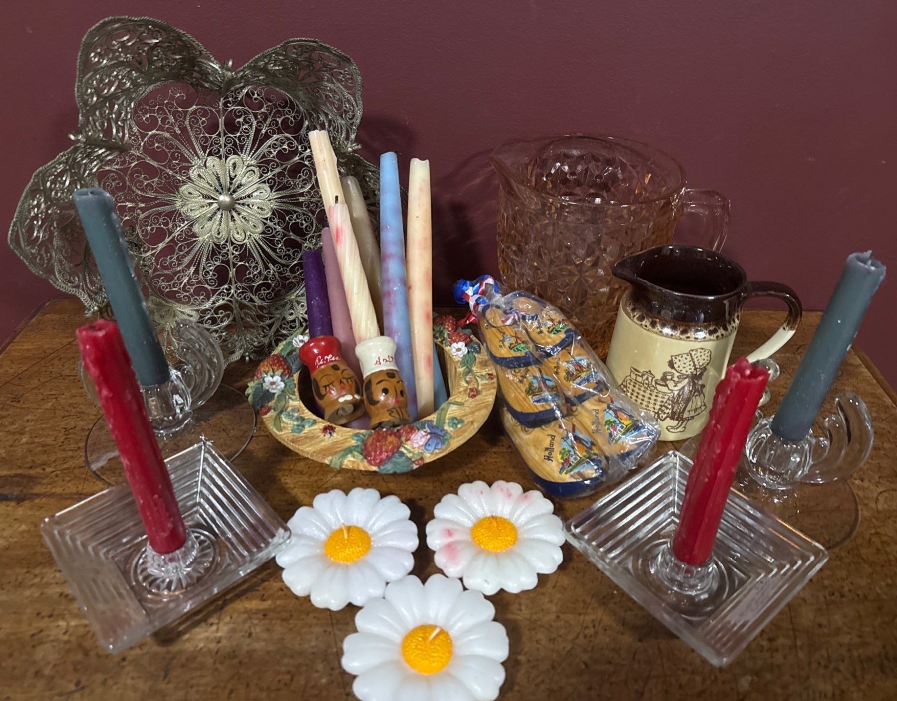 Lot 87 Antique Star Shaped Decorative Bowl Glass Taper Candle Holders Pink Glass Pitcher & more