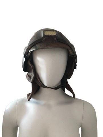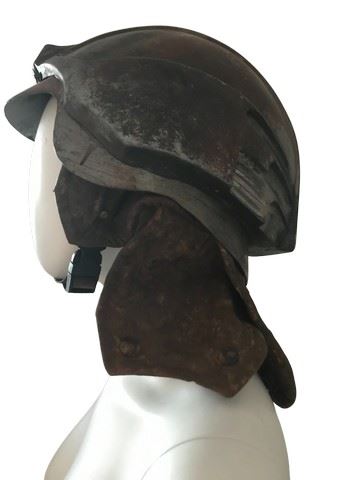 Ghost of Mars (2001)- Custom made light up helmet worn by the possessed miners on Mars. In this film, the costumer and armorer settled on a strategy to give as many of the warriors as they could distinct visual styles. It was made from a plain helmet underneath and the production team designed a viking style over it. Constructed of a plastic/resin combination painted to look like rusted armor with a modern twist, with leather neck flaps snapped in place. There is typically a battery pack to power the light rested between the inner and outer shell of the helmet but this is not included in this helmet. Direct from the set of the film. Excellent condition. Light is not functional and a small crack exists on the left side by the light and on the right side of the helmet. (12"x9"x7").
