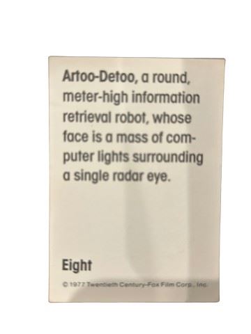 1977 Twentieth Century Fox Film Corp Star Wars R2-D2 Wonder Bread promotion rookie trading card. Excellent condition. Rare. #8 in the series.