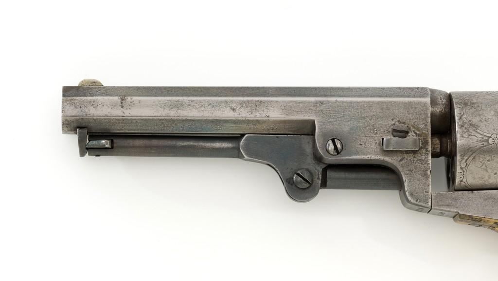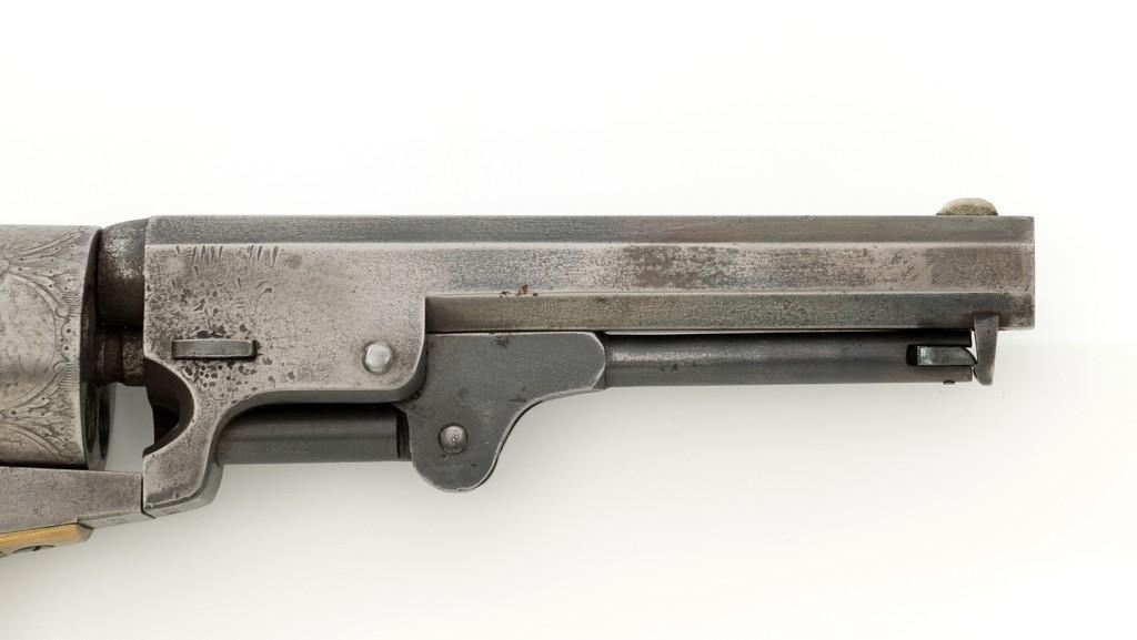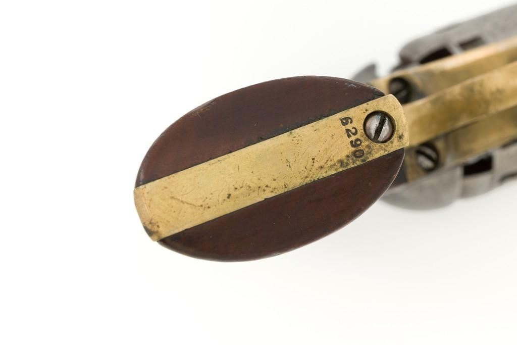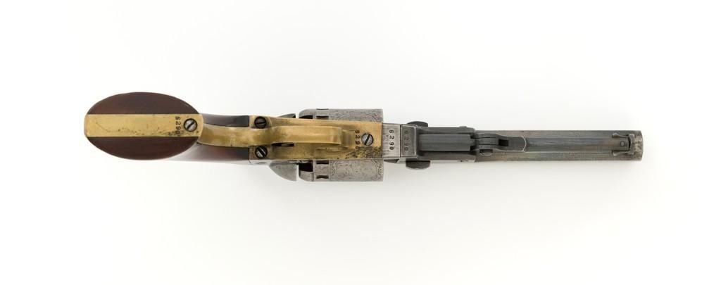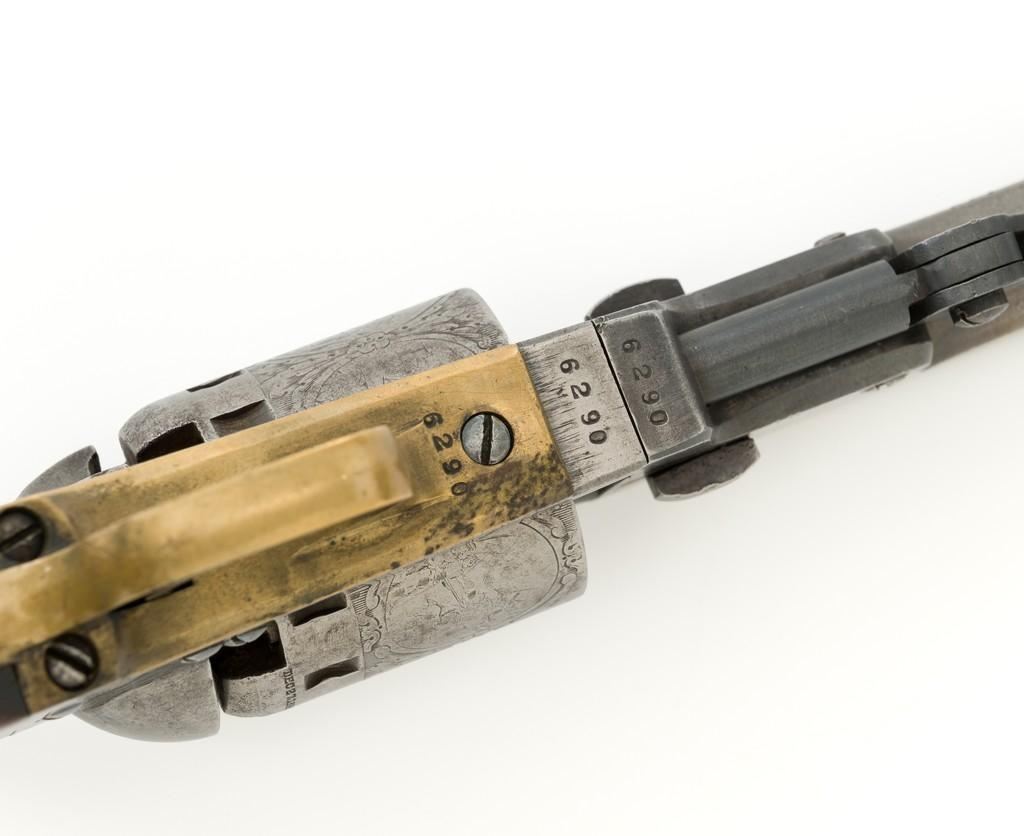 Manhattan Firearms Mfg. Co. Series II Navy Percussion Revolver, #6290, .36 cal., 5'' octagon barrel, blued finish with brass trigger guard and backstrap, hardwood grips, brass blade front sight, and ''V''-notch rear sight. Cylinder with standard roll engraving for this model. Barrel address is marked in one-line ''MANHATTAN FIRE ARMS MFG. CO. NEW YORK''. Matching visible numbers on the main components, including the cylinder; wedge is numbered but does not match. Mfg'd circa 1860-1861. Overall condition is good. Loading lever retains majority of its blue finish; balance is mostly gray, with areas of mild patina, pinprick pitting, and small surface blemishes. Brass shows moderate toning from age. Barrel address is clear. Cylinder scene remains approx. 70% visible. Grips are fine, with beautiful grain patterns, and scattered moderate handling marks, showing minor shrinkage. Action is crisp and cycles smoothly. Bore is fair with visible rifling and scattered erosion. Est.: $700-$900. (Antique)