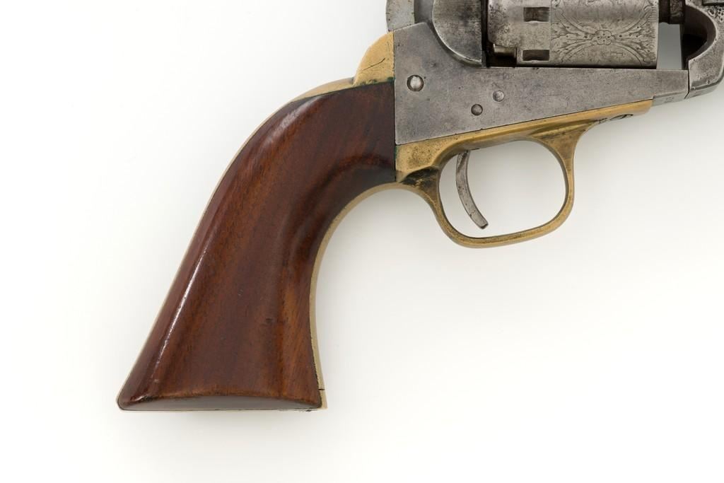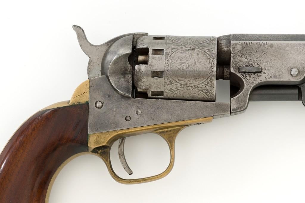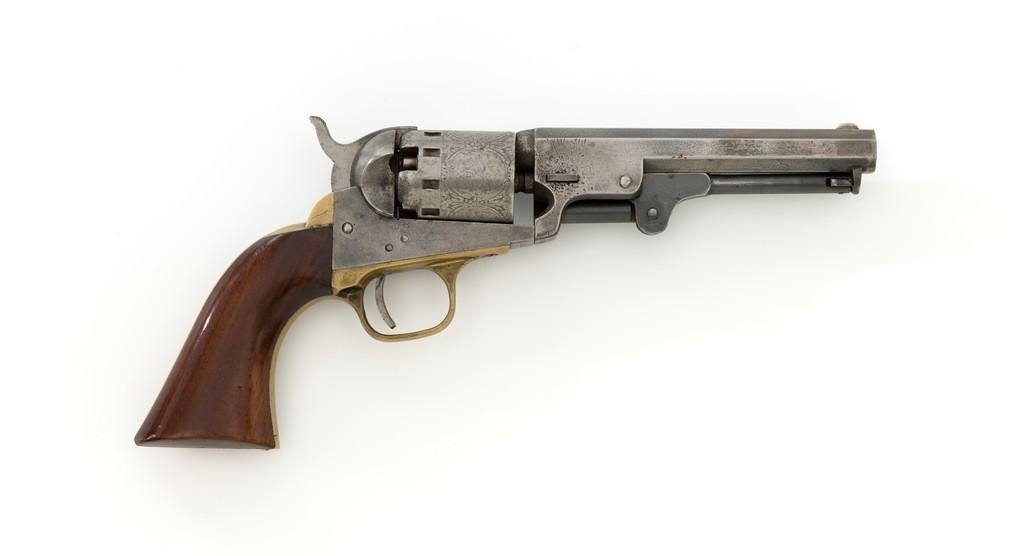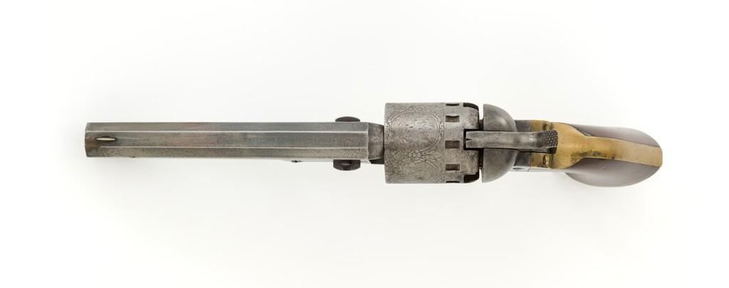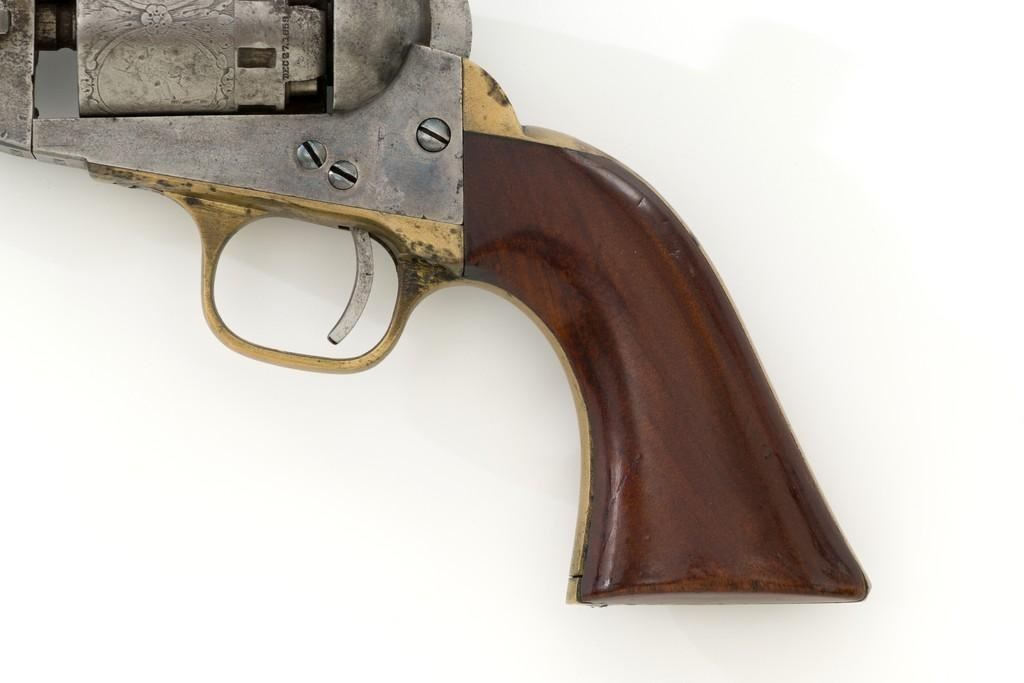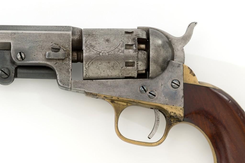 Manhattan Firearms Mfg. Co. Series II Navy Percussion Revolver, #6290, .36 cal., 5'' octagon barrel, blued finish with brass trigger guard and backstrap, hardwood grips, brass blade front sight, and ''V''-notch rear sight. Cylinder with standard roll engraving for this model. Barrel address is marked in one-line ''MANHATTAN FIRE ARMS MFG. CO. NEW YORK''. Matching visible numbers on the main components, including the cylinder; wedge is numbered but does not match. Mfg'd circa 1860-1861. Overall condition is good. Loading lever retains majority of its blue finish; balance is mostly gray, with areas of mild patina, pinprick pitting, and small surface blemishes. Brass shows moderate toning from age. Barrel address is clear. Cylinder scene remains approx. 70% visible. Grips are fine, with beautiful grain patterns, and scattered moderate handling marks, showing minor shrinkage. Action is crisp and cycles smoothly. Bore is fair with visible rifling and scattered erosion. Est.: $700-$900. (Antique)