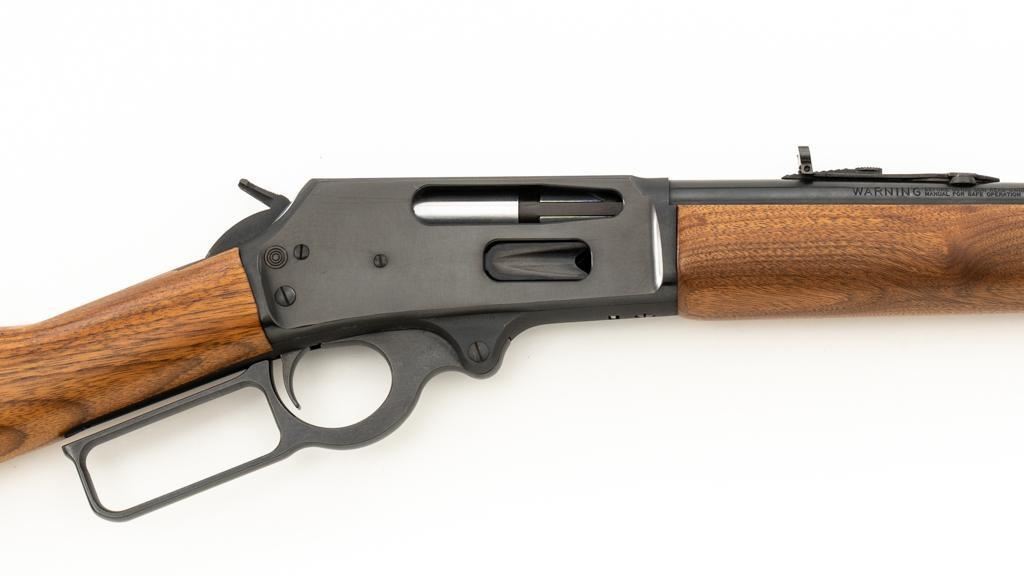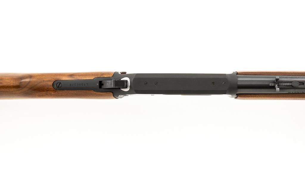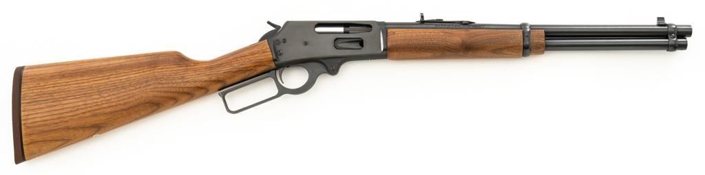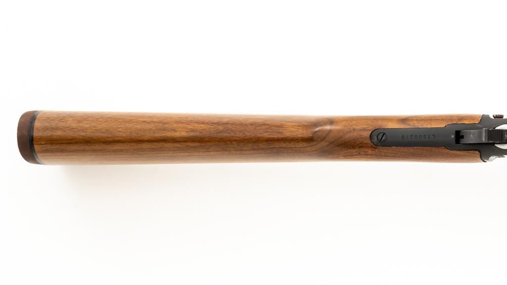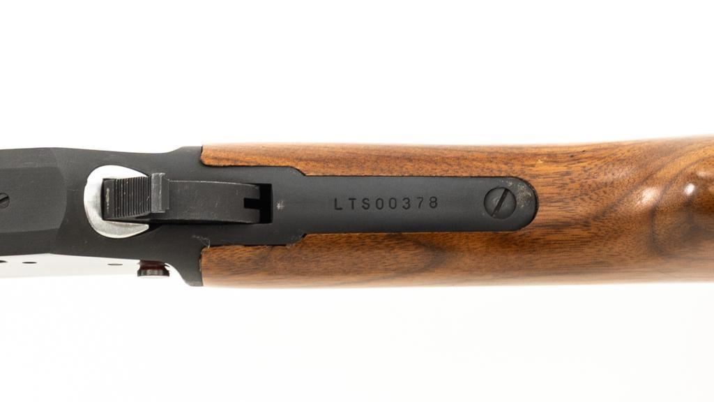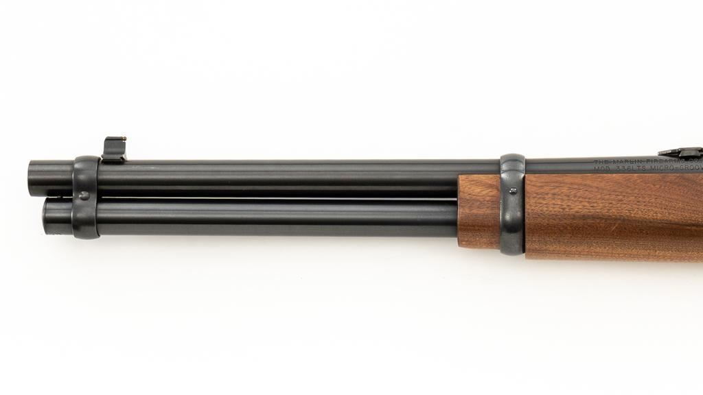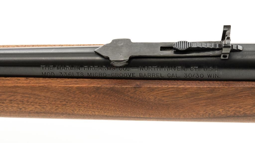 Scarce Marlin Model 336LTS Lever Action Carbine, #LTS00378, .30-30 Win. cal., 16.25'' ''JM'' marked round barrel, blue finish, straight grip walnut stock and forend, solid brown rubber Marlin buttplate, brass beaded blade front sight, semi-buckhorn rear sight with elevator, and cross-bolt safety. Top of the receiver is factory drilled and tapped for a scope mount. Considered scarce as only 2,671 were manufactured from 1988-1989. Condition is excellent, retaining approx. 98% factory blue, with a few light scratches and handling marks to the sides of the receiver. Factory lettering is crisp. Wood displays only a few light handling marks. Action is crisp and operates smoothly. Bore rates excellent and is bright with strong rifling. Est.: $500-$700. (Modern/PPT)