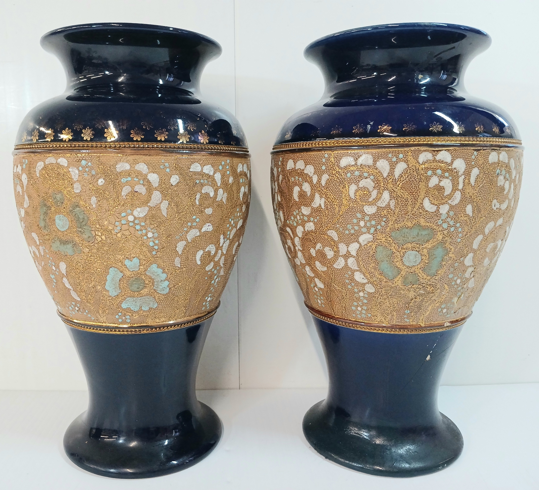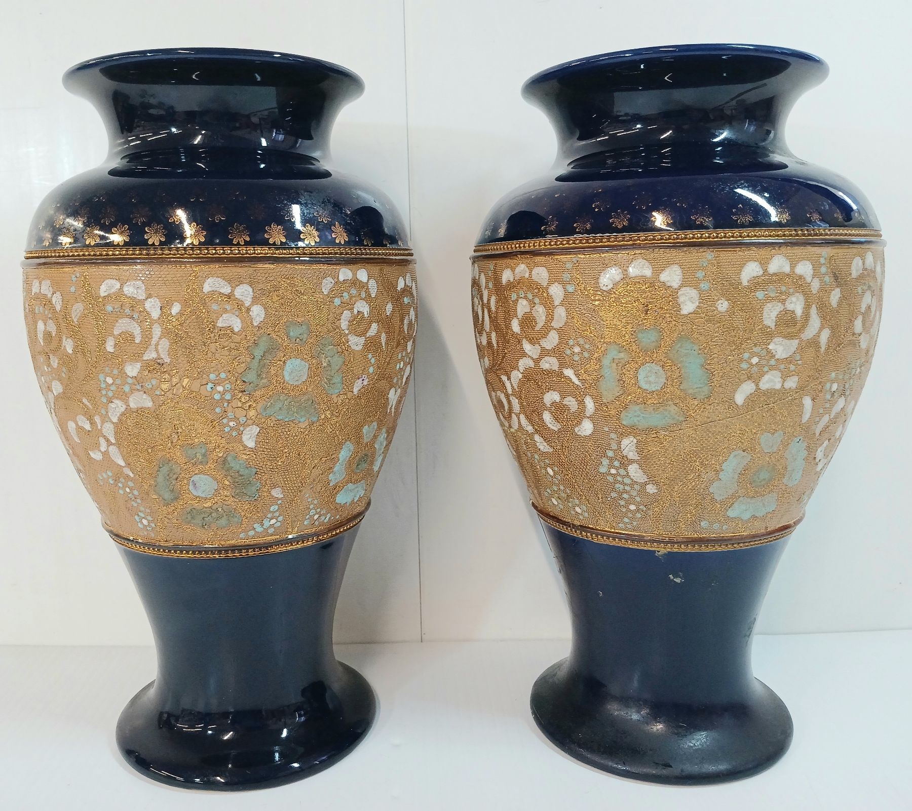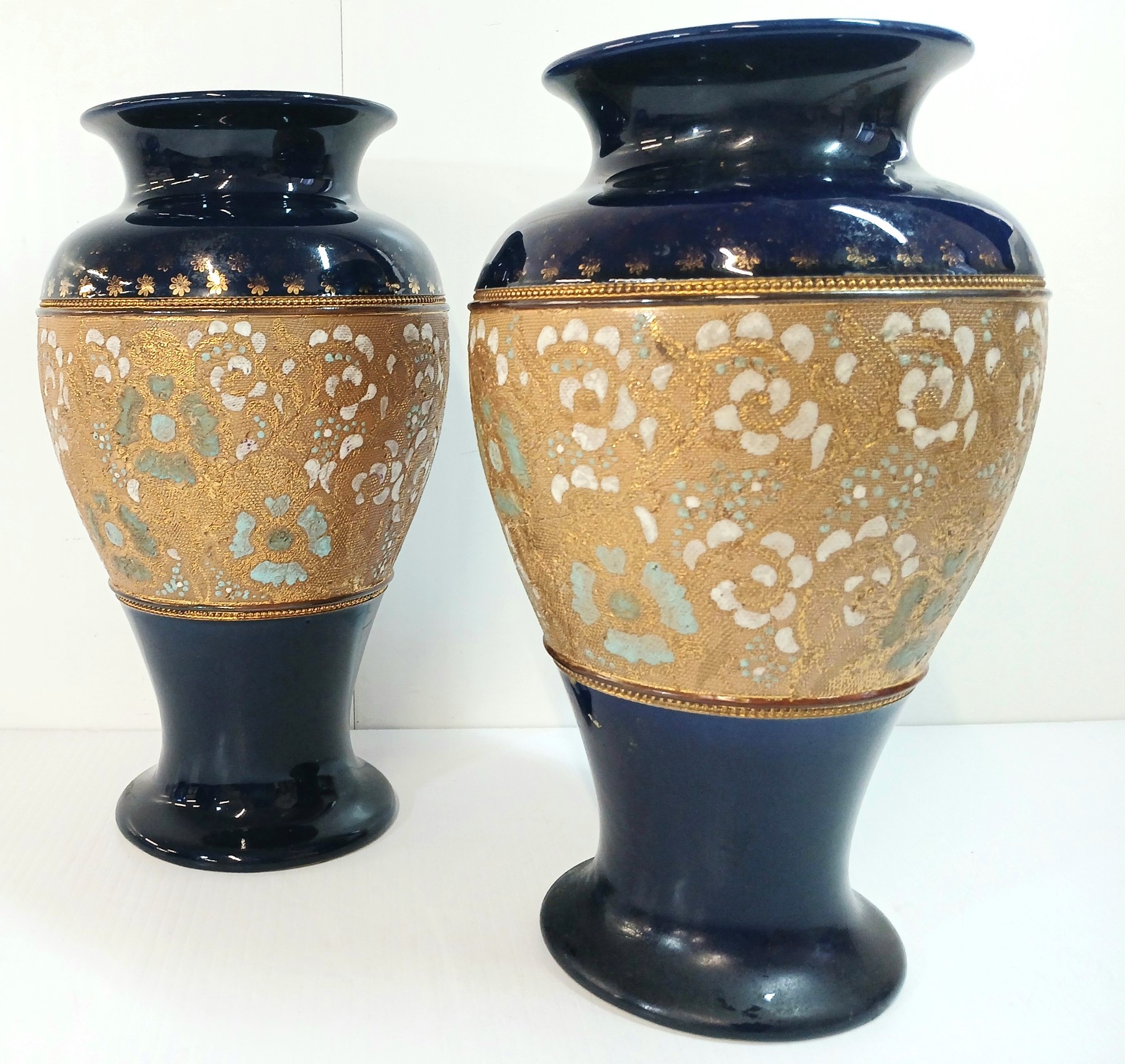 Lot 378 LOT OF 2 - DOULTON & SLATERS PATENT BLUE & WHITE ENAMEL FLORAL COBALT VASES - CIRCA 1890s - 1920s
