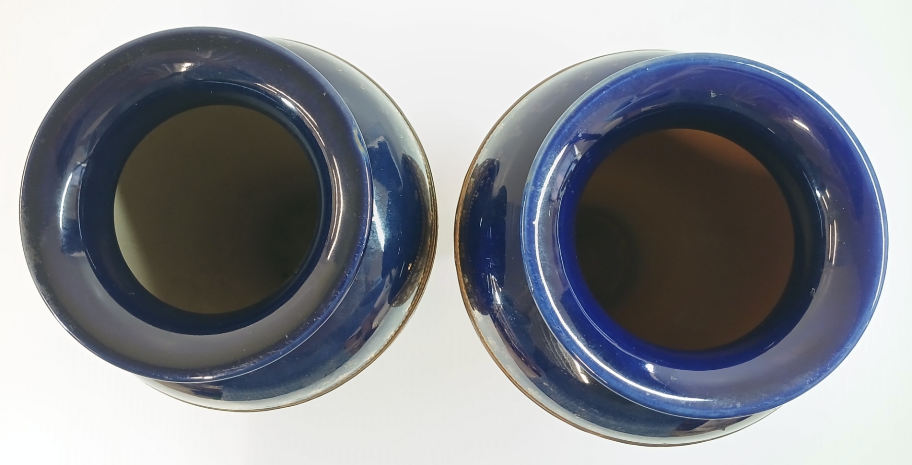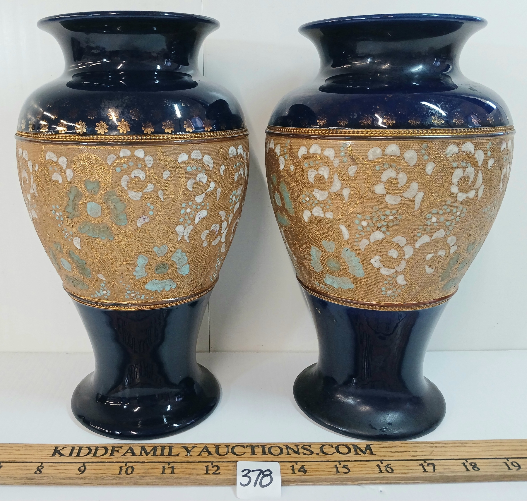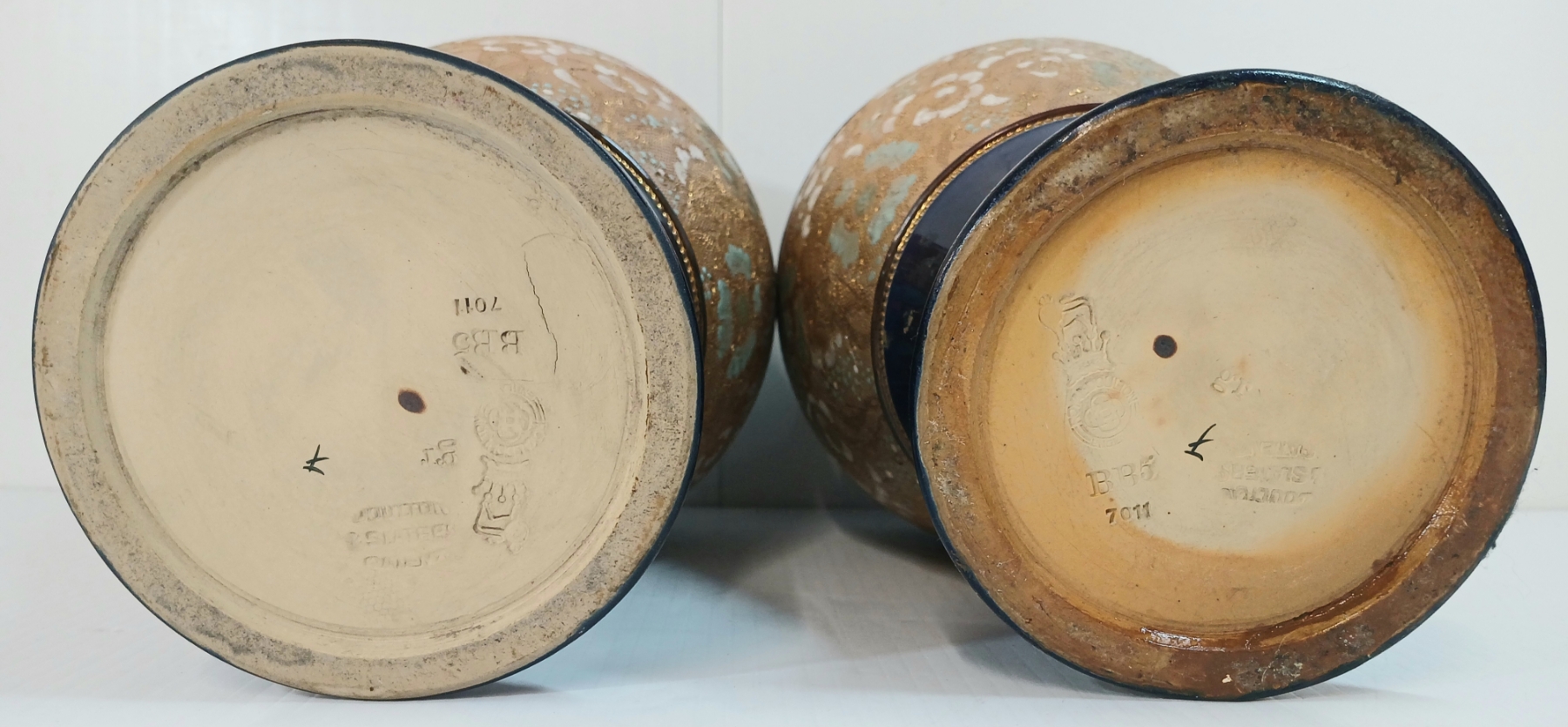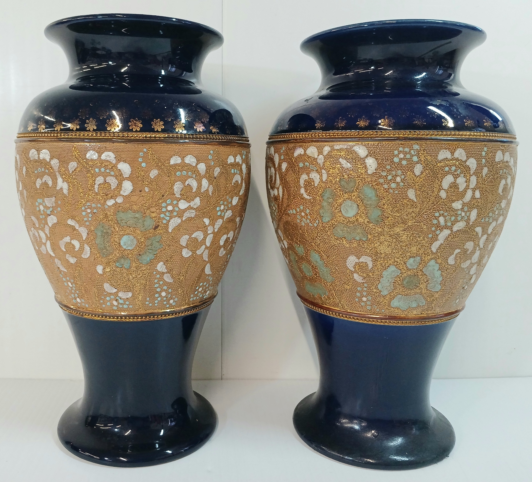 Lot 378 LOT OF 2 - DOULTON & SLATERS PATENT BLUE & WHITE ENAMEL FLORAL COBALT VASES - CIRCA 1890s - 1920s