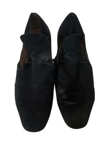 Unidentified screen worn, custom made, black suede period shoes with a slight heel. Well worn during the production.