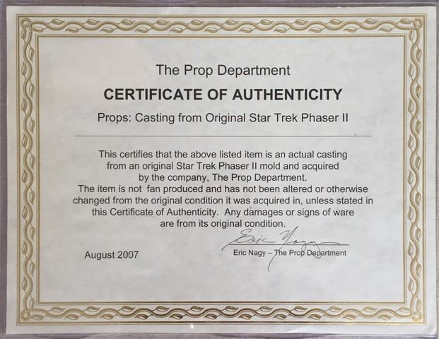 Star Trek Phaser II prop with Certificate of Authenticity. This is an actual casting from the original mold. Also comes with a mounting plaque. (12"x9" plaque). (8"x6" phaser).
