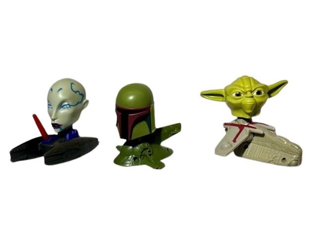 Star Wars McDonalds Happy Meal Figurines - includes Asajj Ventress-Vulture Droid (2008) (non functional), Bobba Fett (on wheels) (2008), and Yoda (2008). (3" high)