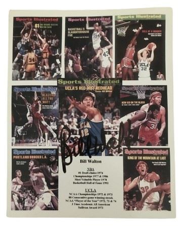 A collage of Sports Illustrated covers featuring #32 from UCLA and the Clippers, Bill Walton. Signed by Bill Walton. Also has a short biography of his highlights from the NBA and UCLA. Diagonal bend in the top of the photo but otherwise good condition. 8”x10”.