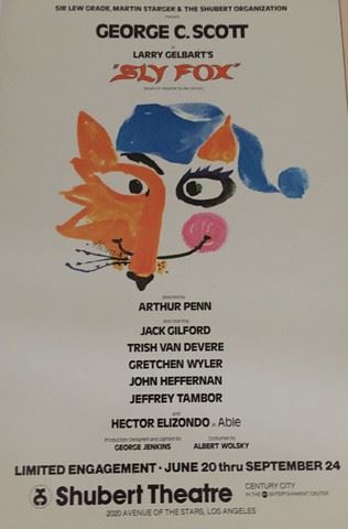 Sly Fox poster on cardboard (original) – comes with playbook includes signatures of everyone in the play and cast photos (x2) . 1976 THEATRE PROGRAM SLY FOX, SINGED BY GEORGE C SCOTT & MOST OF THE CAST. Purchased at an estate sale. From the Shubert Theataer in Los Angeles. This is an original and not a reproduction. The Larry Gelbart play (based on Volpone by Ben Johnson) opened in NYC on 12/14/76 and ran for 495 performances. The Program is from the SHUBERT THEATER and features artwork by Chava, cast and production credits, dates and theatre credit.