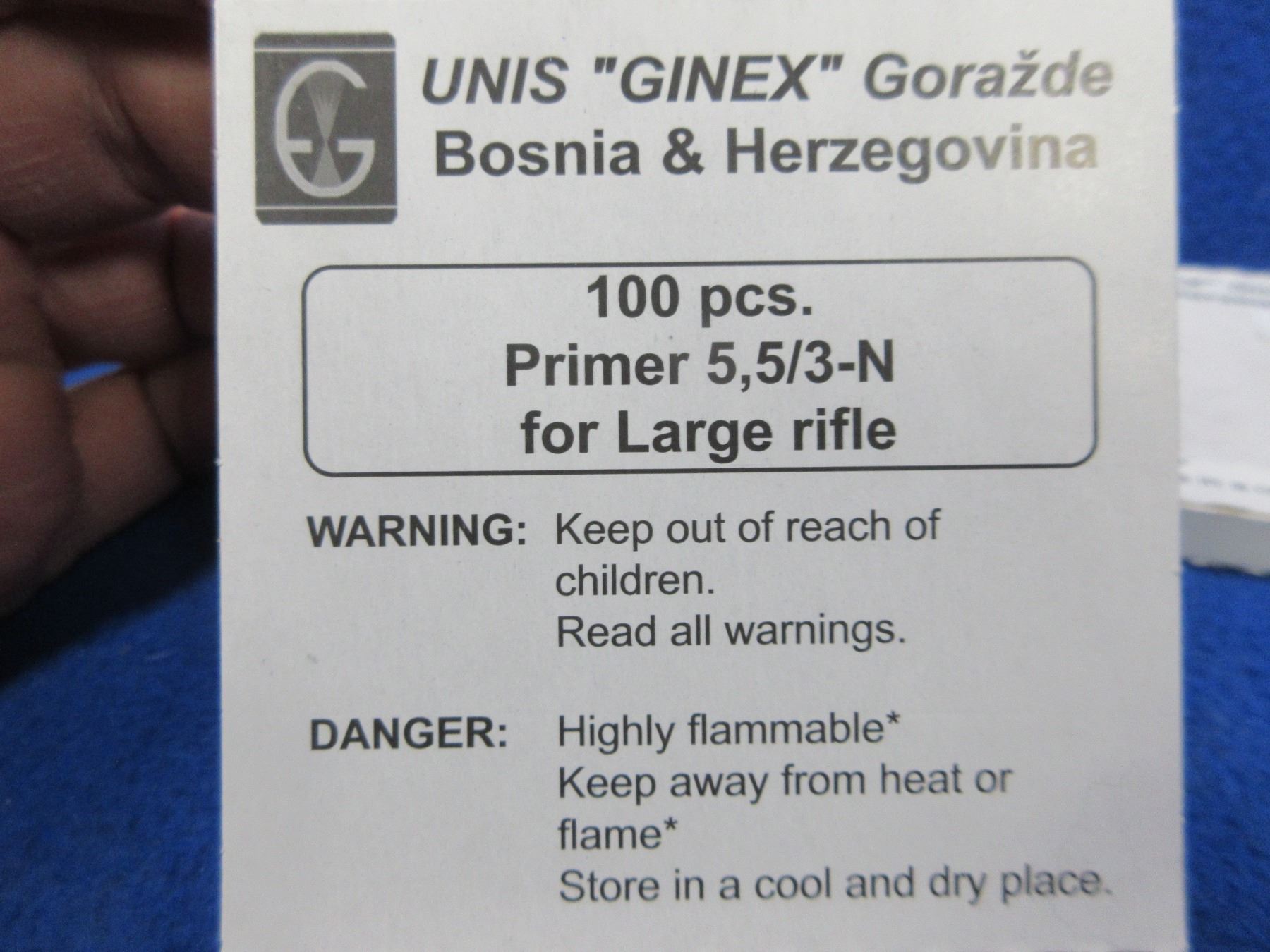 Unis "Ginex" Large Rifle Primer 5,5/3-N (Pick Up or Ship by UPS Only) - 9 Boxes of 100