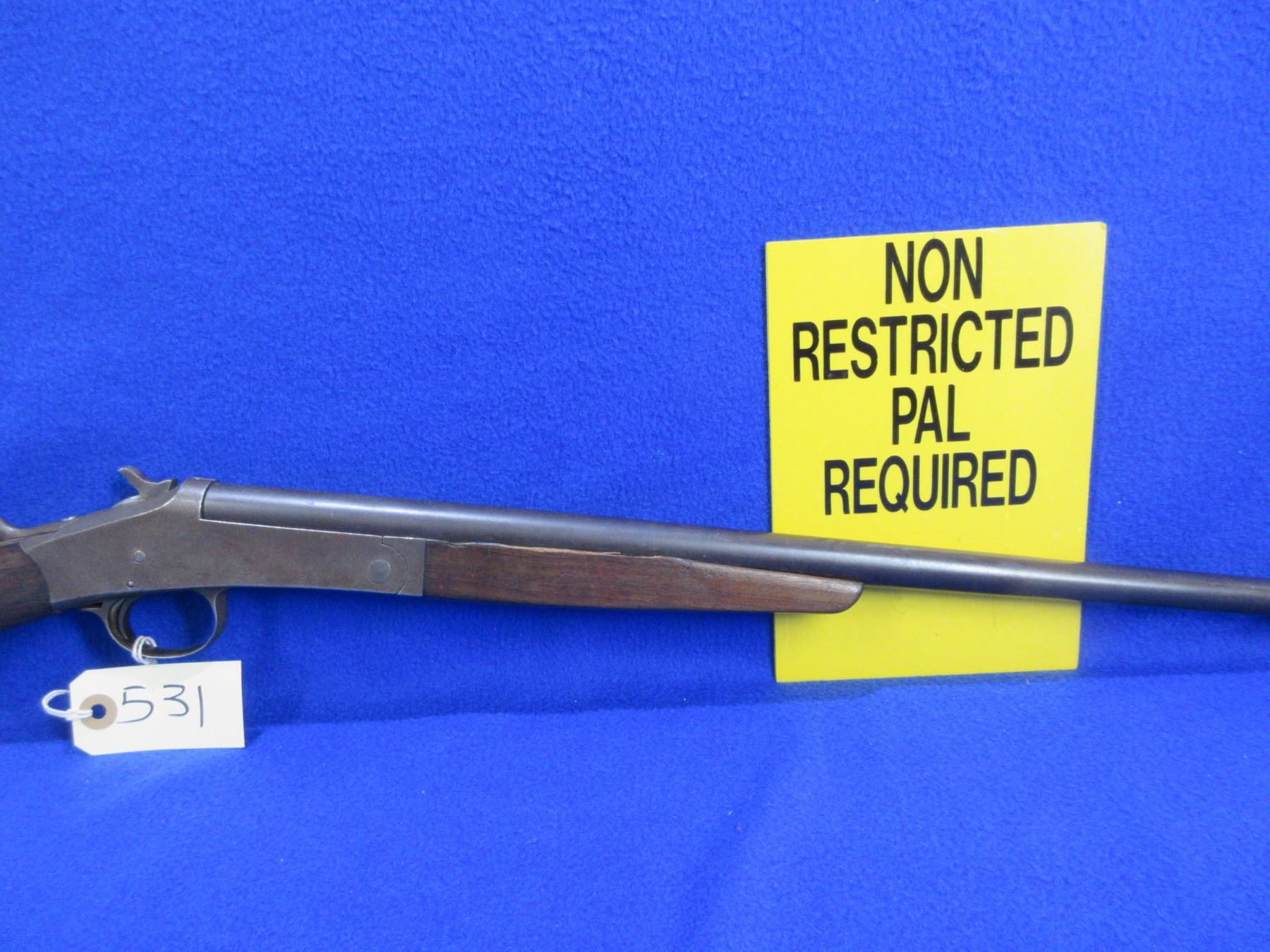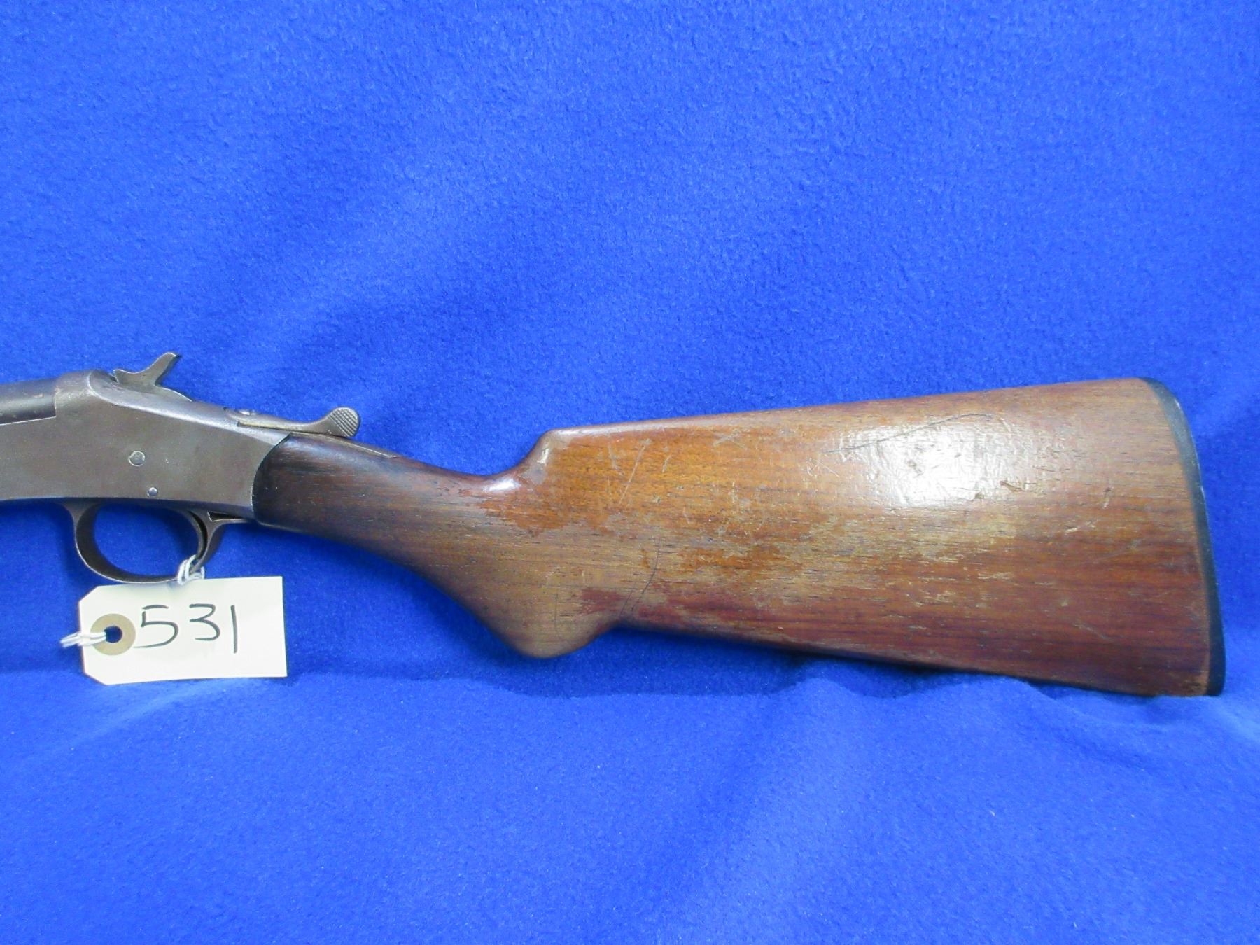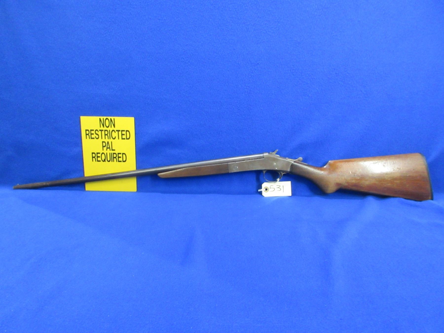 Non-Restricted - Harrington & Richardson in 410 Ga. 2 1/2"- Marked "410-44 Cal", this is a tip up single shot shotgun, action is tight and is in non working order but the firing pin is missing. Barrel is 24 3/4", bore is fair to good, bluing is good with some light pitting, has bead front sight, stock has cracks behind the top and bottom tangs, forearm has a chip on the right side, length of pull is 13 3/4", butt plate has a chip on the toe. Ser # A14044