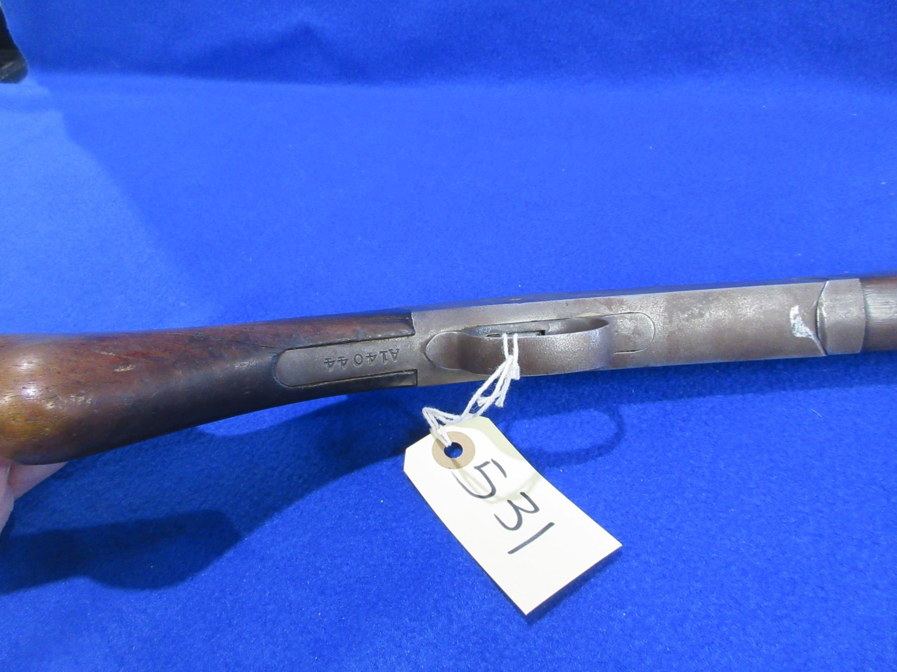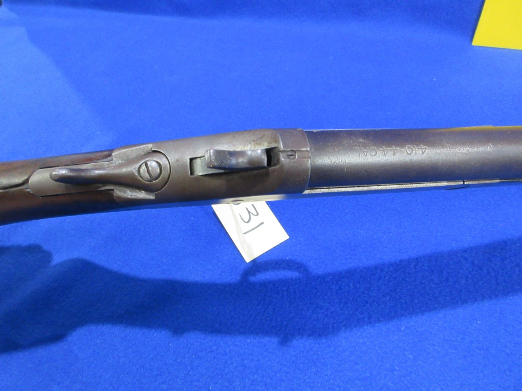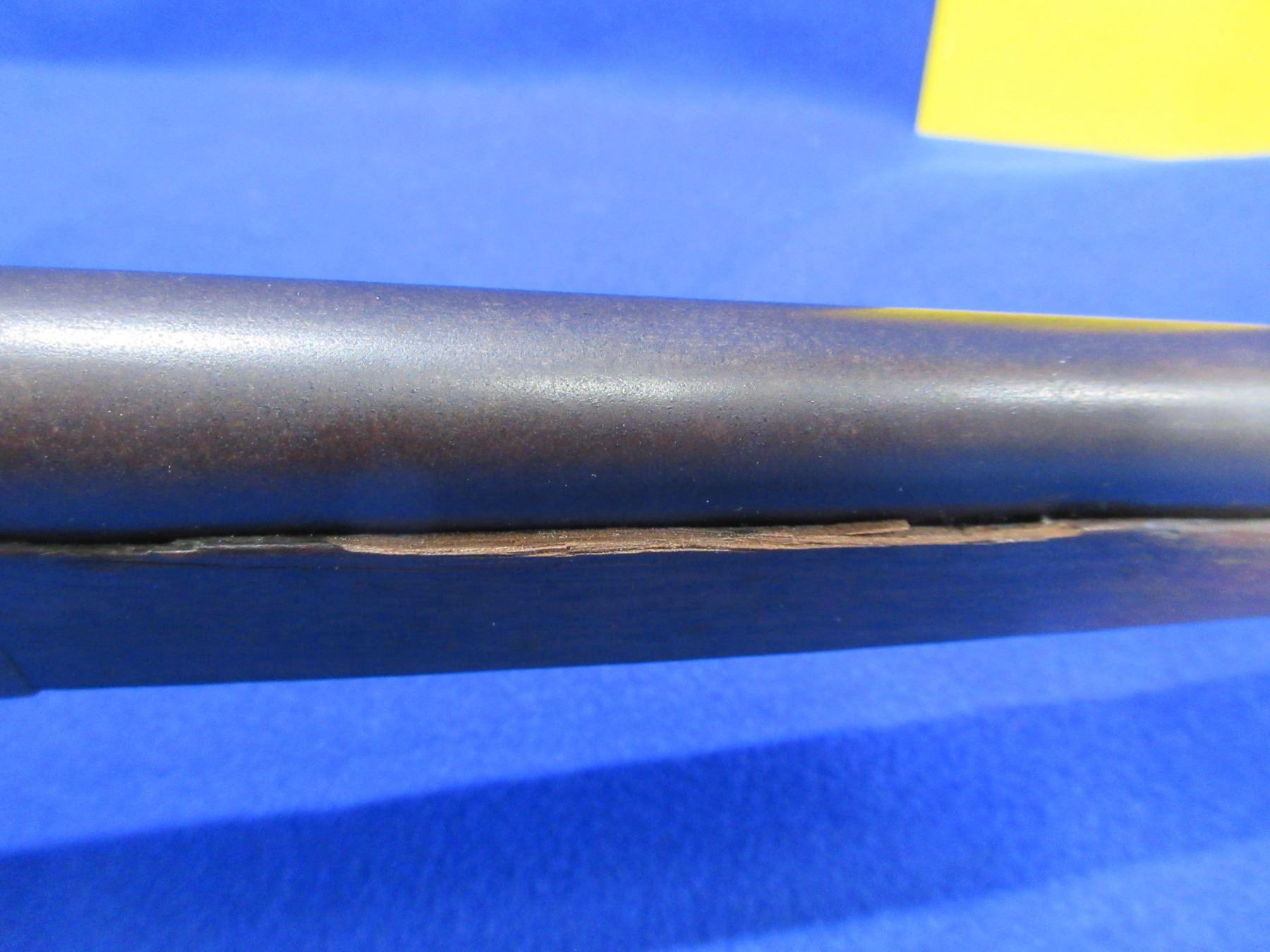 Non-Restricted - Harrington & Richardson in 410 Ga. 2 1/2"- Marked "410-44 Cal", this is a tip up single shot shotgun, action is tight and is in non working order but the firing pin is missing. Barrel is 24 3/4", bore is fair to good, bluing is good with some light pitting, has bead front sight, stock has cracks behind the top and bottom tangs, forearm has a chip on the right side, length of pull is 13 3/4", butt plate has a chip on the toe. Ser # A14044