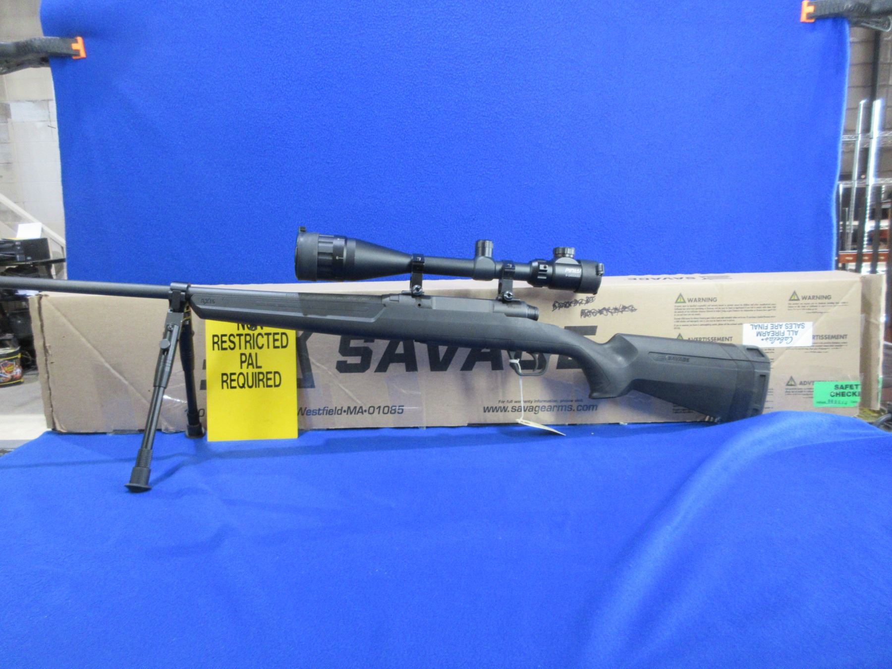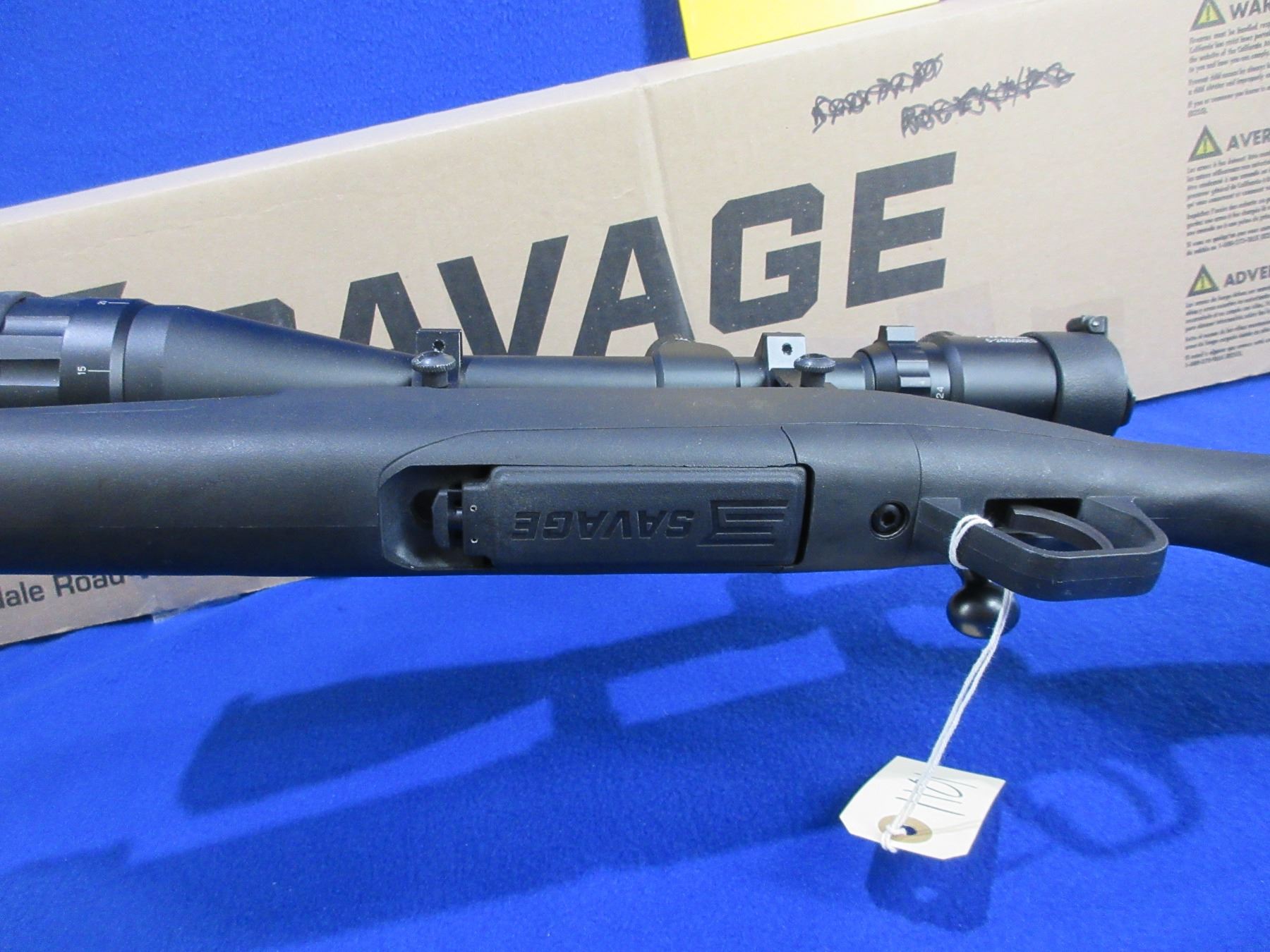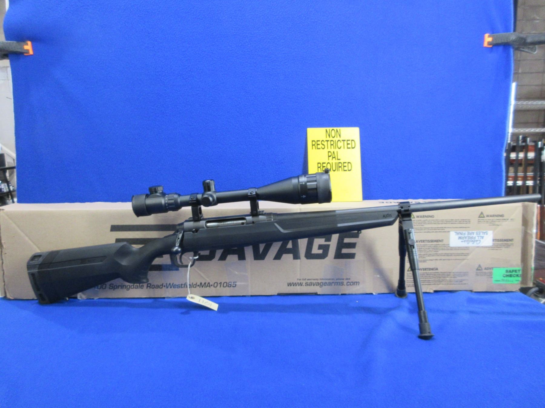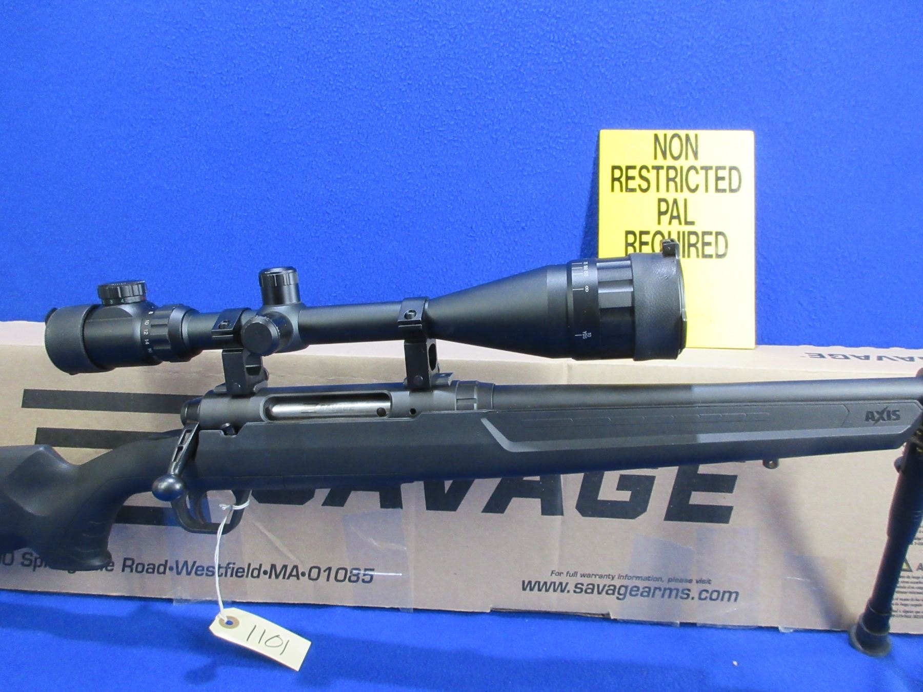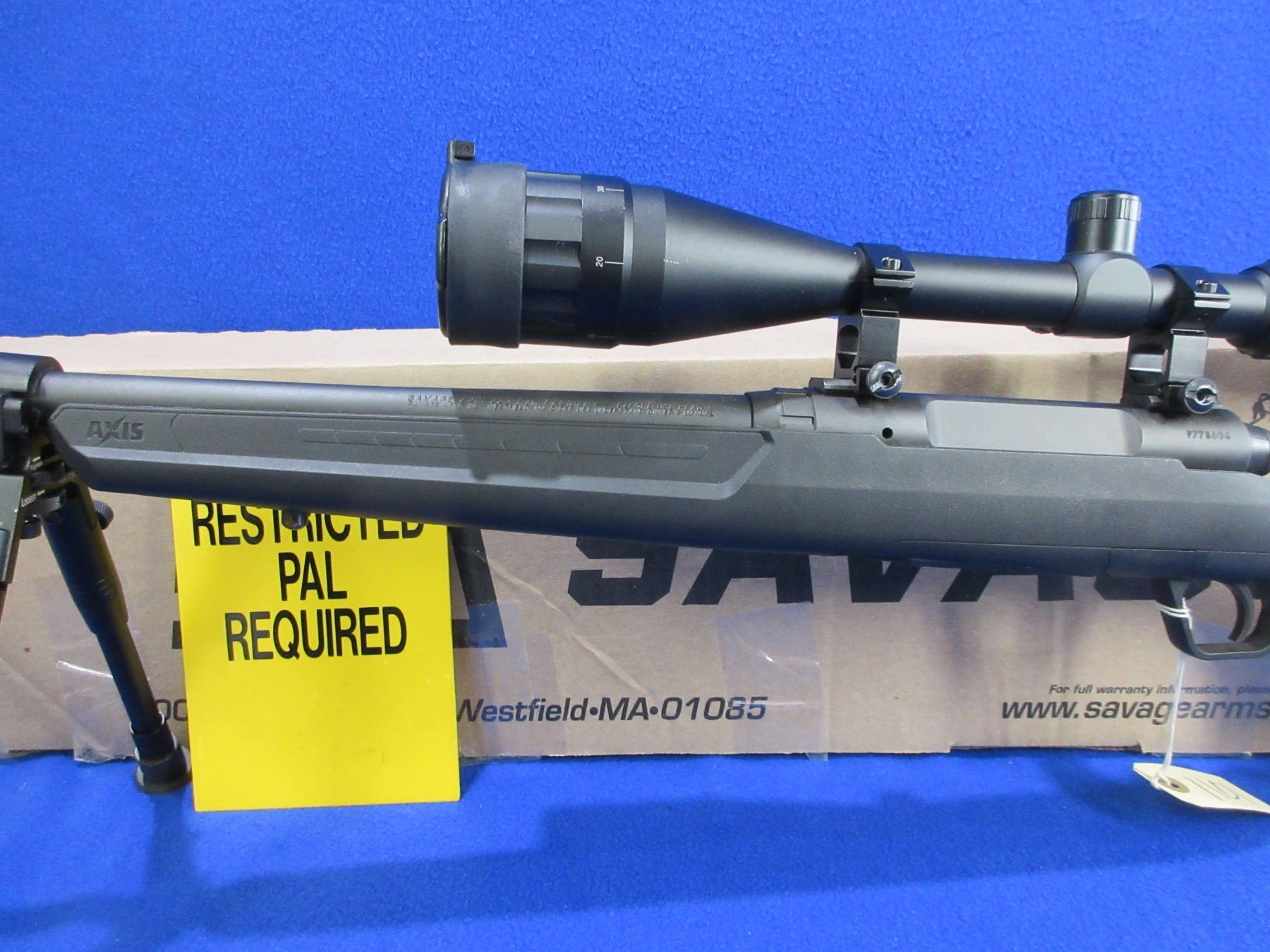 Non-Restricted - Savage Model Axis in 223 Rem - This is a bolt action rifle with removable magazine, action appears to be in very good working order. Barrel is 22", rifling is very good, black finish is good to very good, has no sights but has Pinty 6-24x50 AOEG Red/Green Dot Illuminating scope with flip-up lens covers - appears clear - range finding reticle, synthetic stock is good to very good with usage marks, length of pull is 13 1/2", rubber recoil pad good, comes with swivel studs, bipod and original box. Ser # P778604