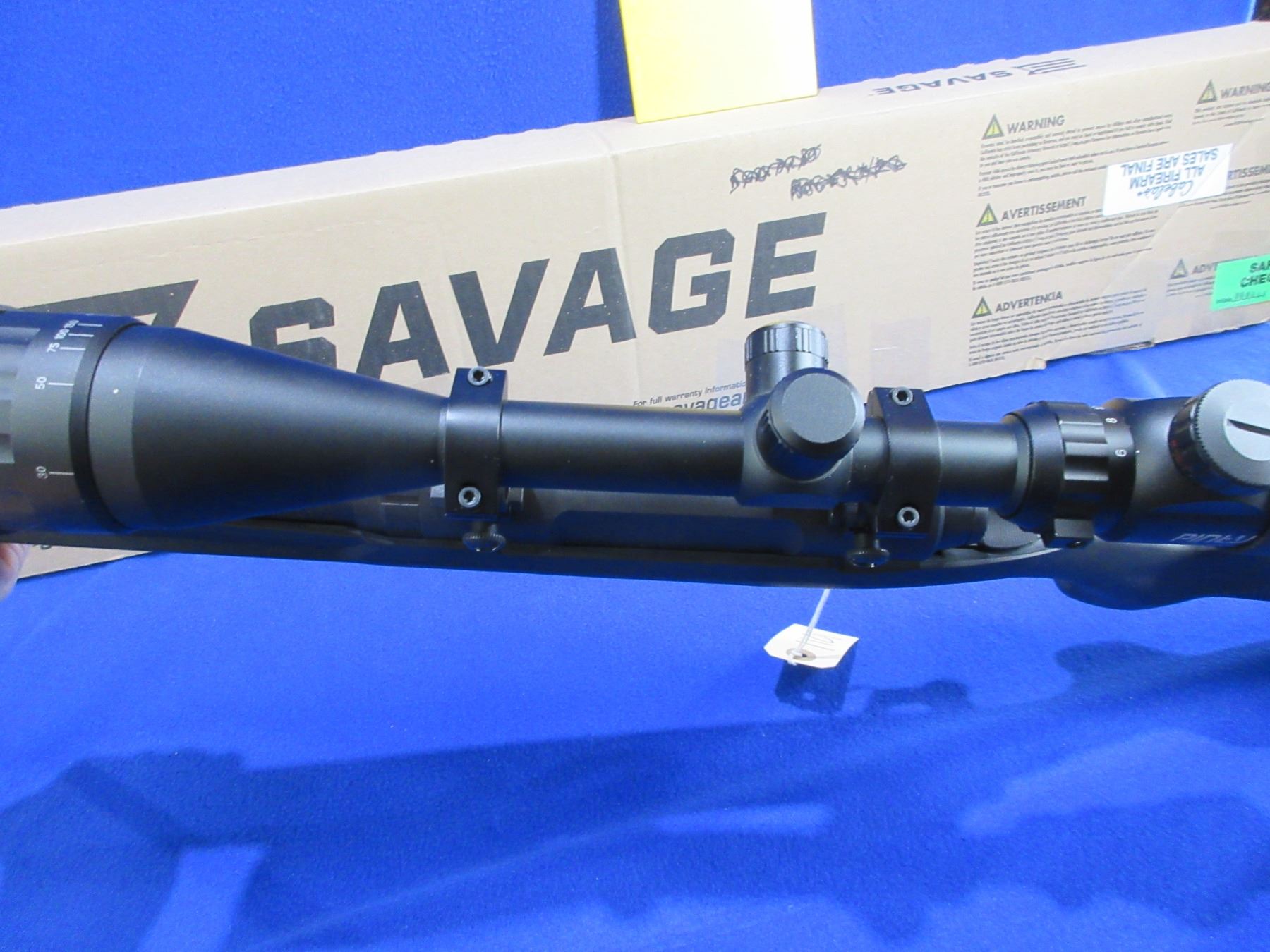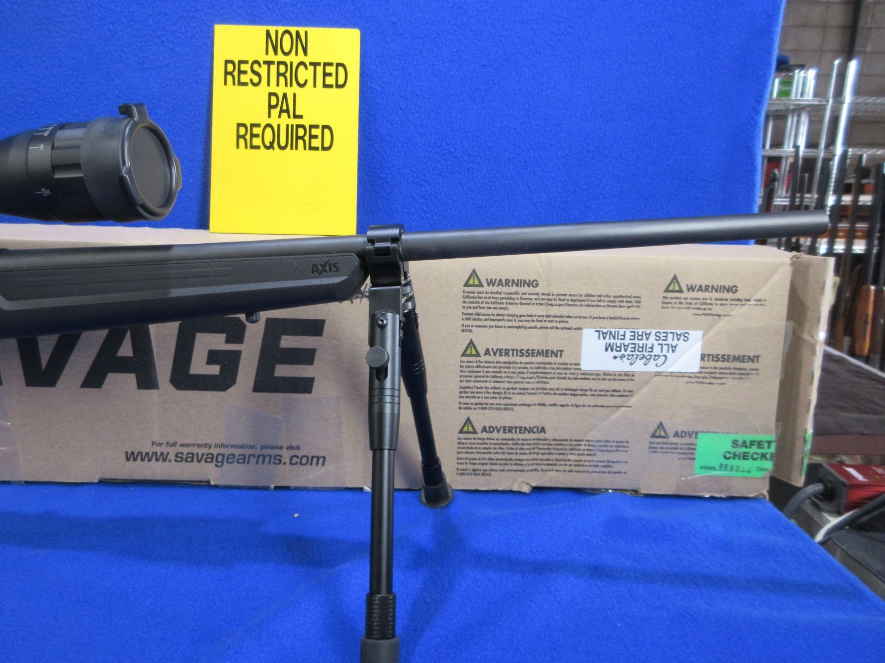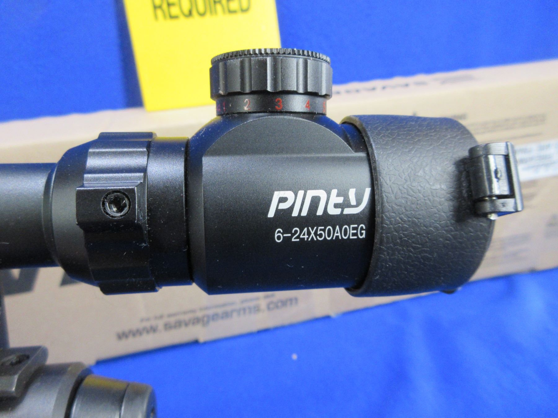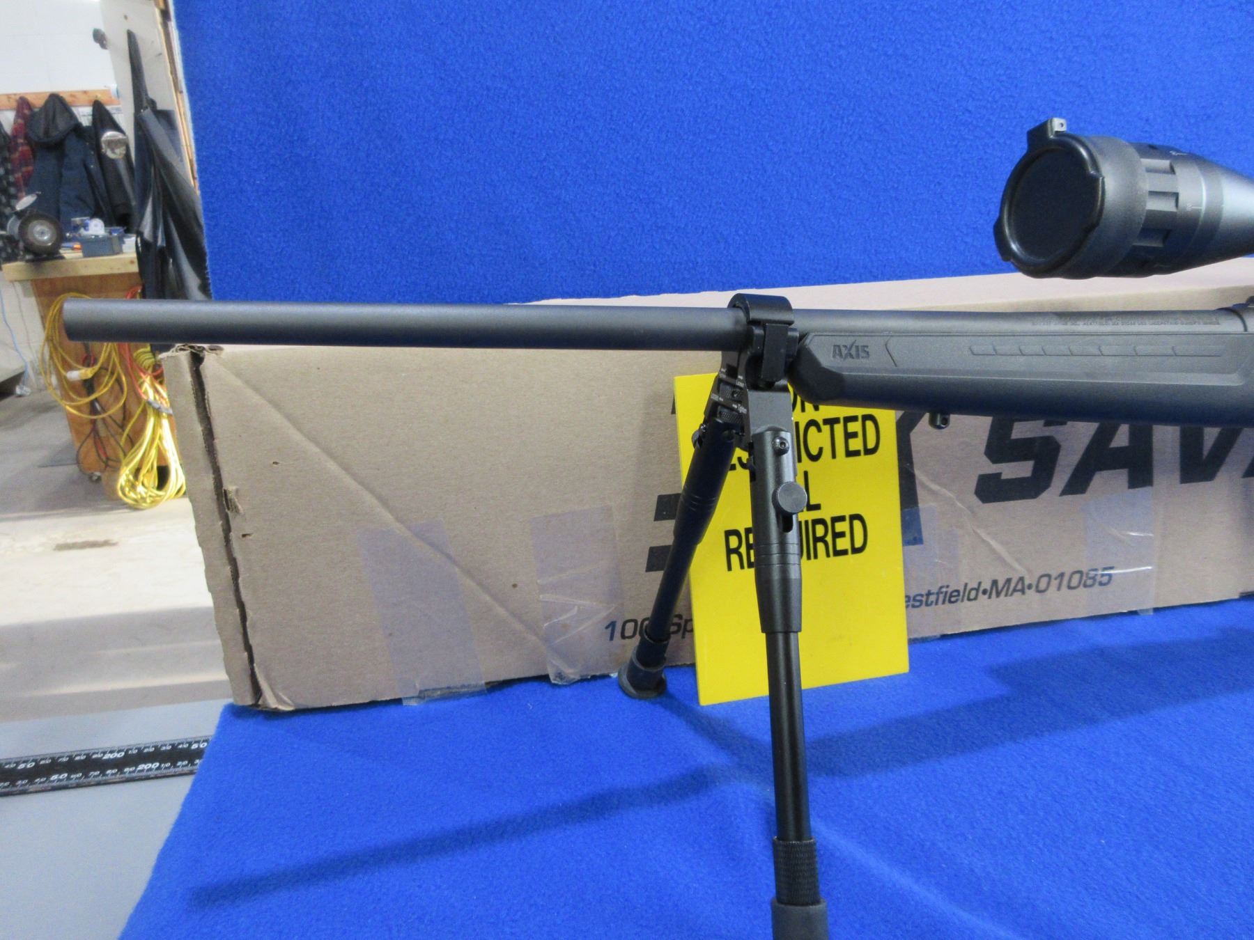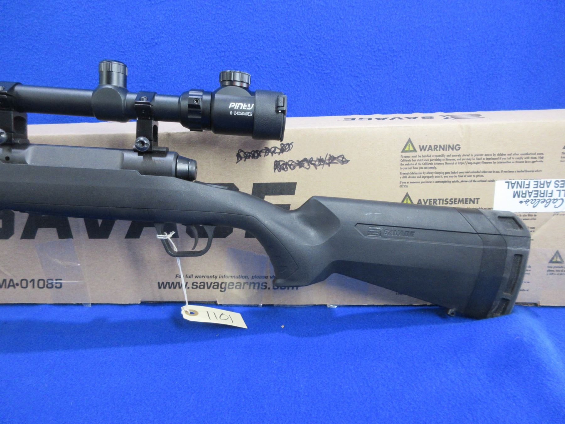 Non-Restricted - Savage Model Axis in 223 Rem - This is a bolt action rifle with removable magazine, action appears to be in very good working order. Barrel is 22", rifling is very good, black finish is good to very good, has no sights but has Pinty 6-24x50 AOEG Red/Green Dot Illuminating scope with flip-up lens covers - appears clear - range finding reticle, synthetic stock is good to very good with usage marks, length of pull is 13 1/2", rubber recoil pad good, comes with swivel studs, bipod and original box. Ser # P778604