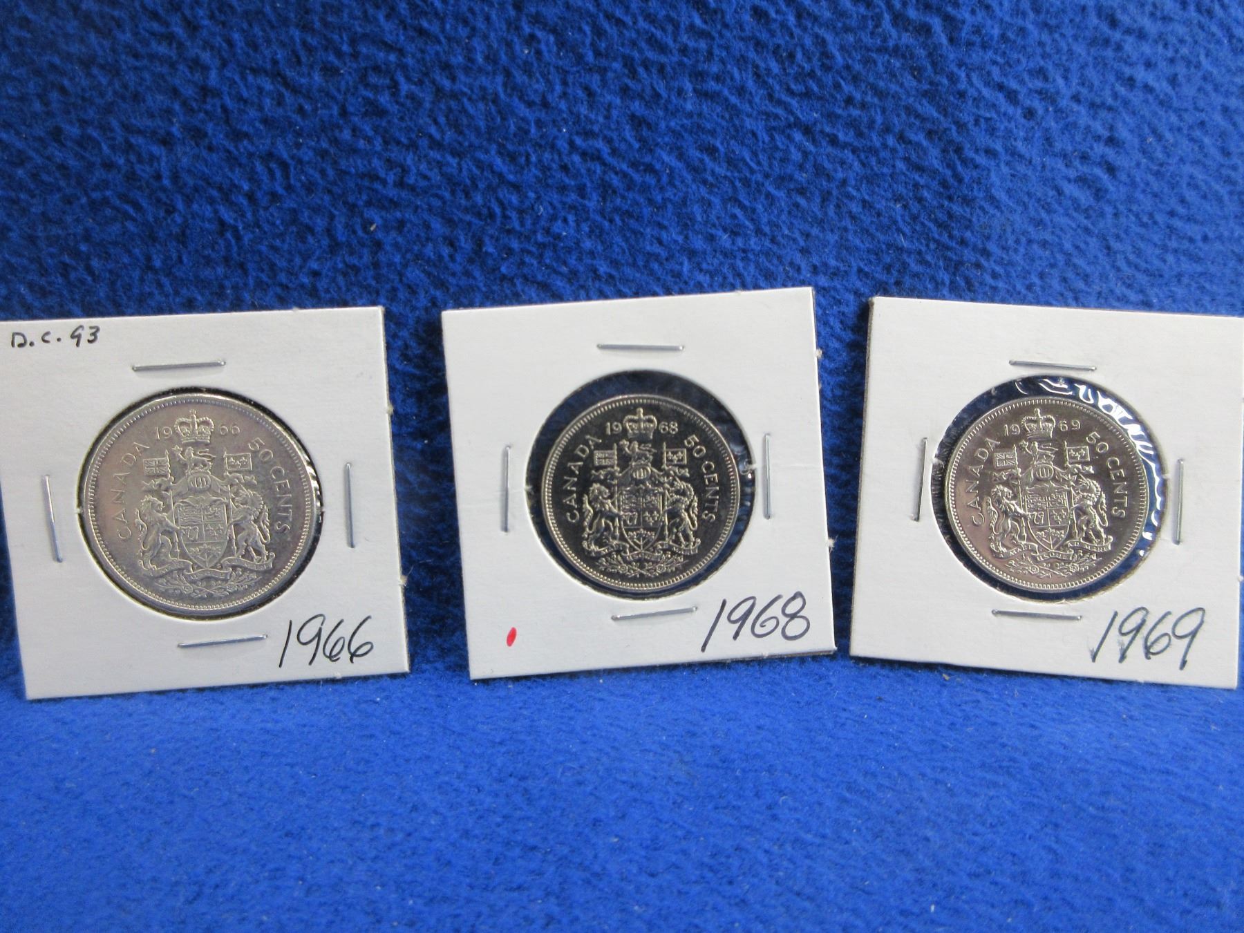 3 Canadian 50 Cent Coins - 1966, 1968, 1969 - 1966 is .800 Silver