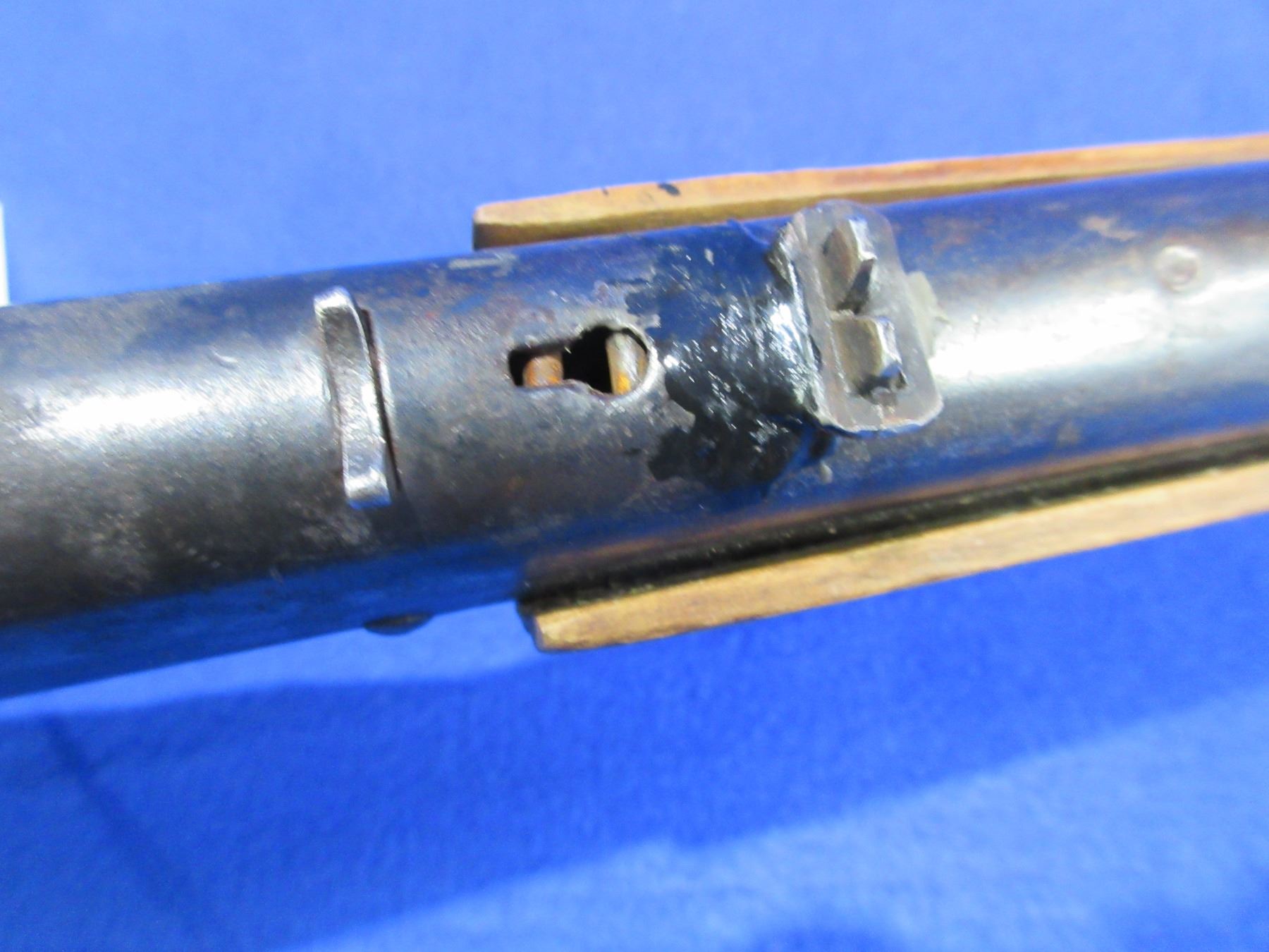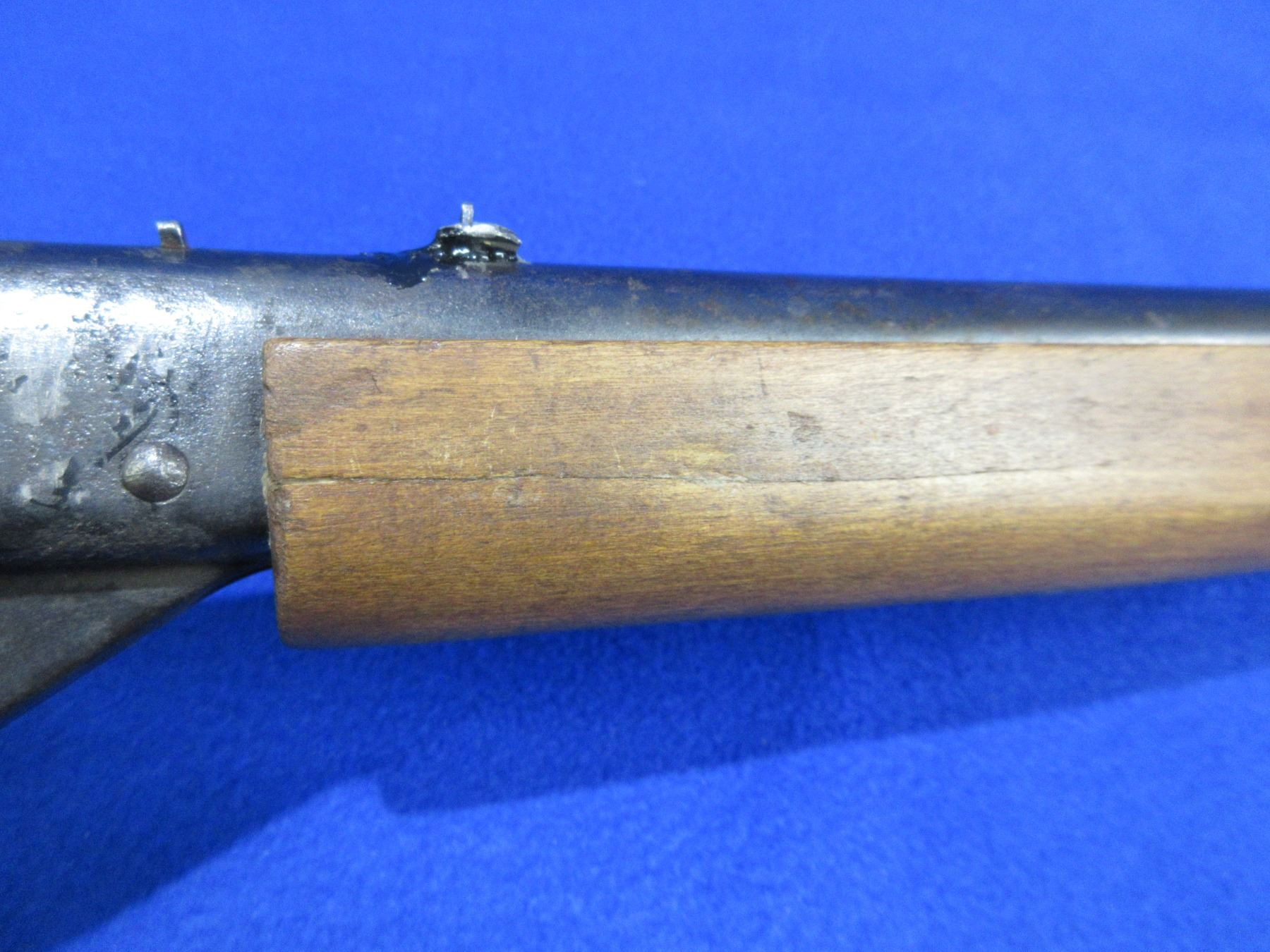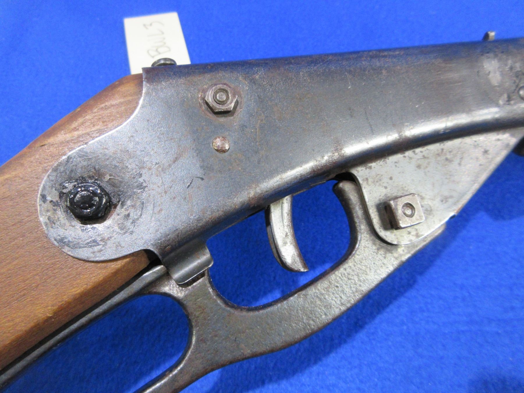 No PAL Required - Daisy Red Ryder 111 Model 40 Carbine Air Rifle in .177 BB. - Made in 1947-1949, this is a break barrel action BB rifle, action appears to be in working order but has incorrect nut and a screw that has JB Weld on it. Barrel is 18", bluing has rust and pitting, has both sights but rear sight is "JB Welded" on, stock is good with usage marks, forearm has crack repair on right side, length of pull is 13 1/2". Ser # None