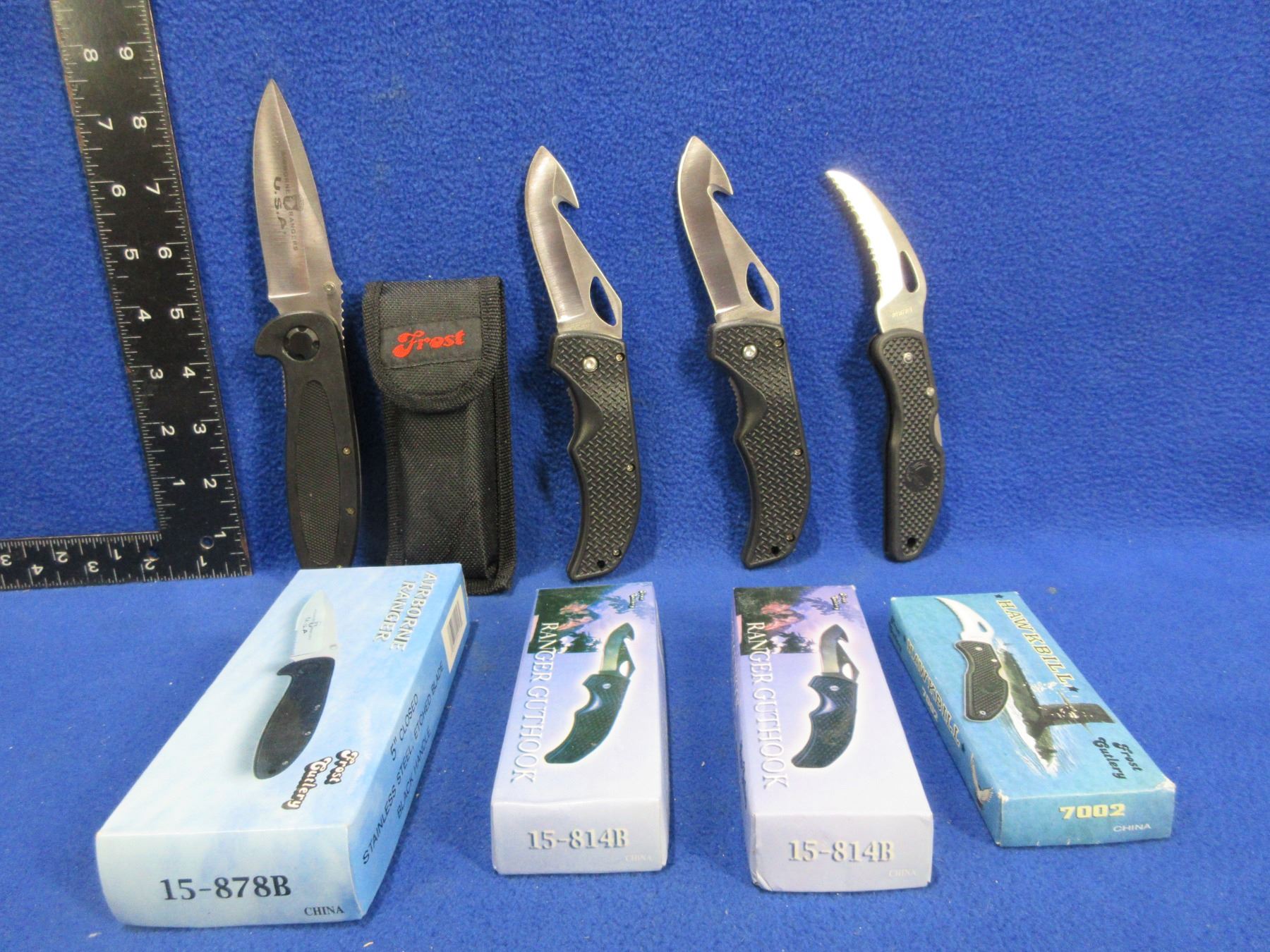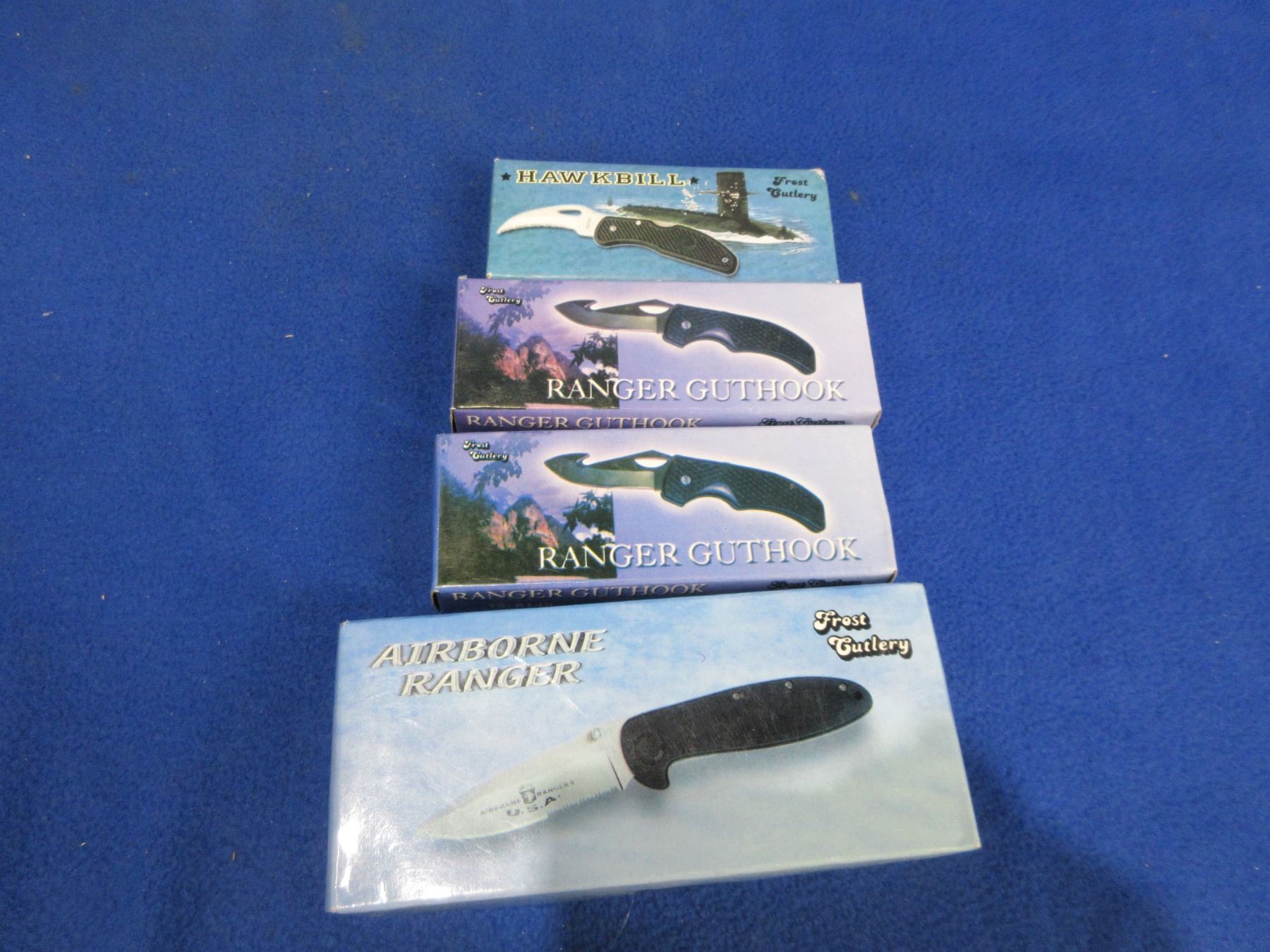 4 Folding Lock Blade Knives - Frost Cutlery - Appear Unused - 2 Ranger Guthook, Hawkbill, Airborne Ranger