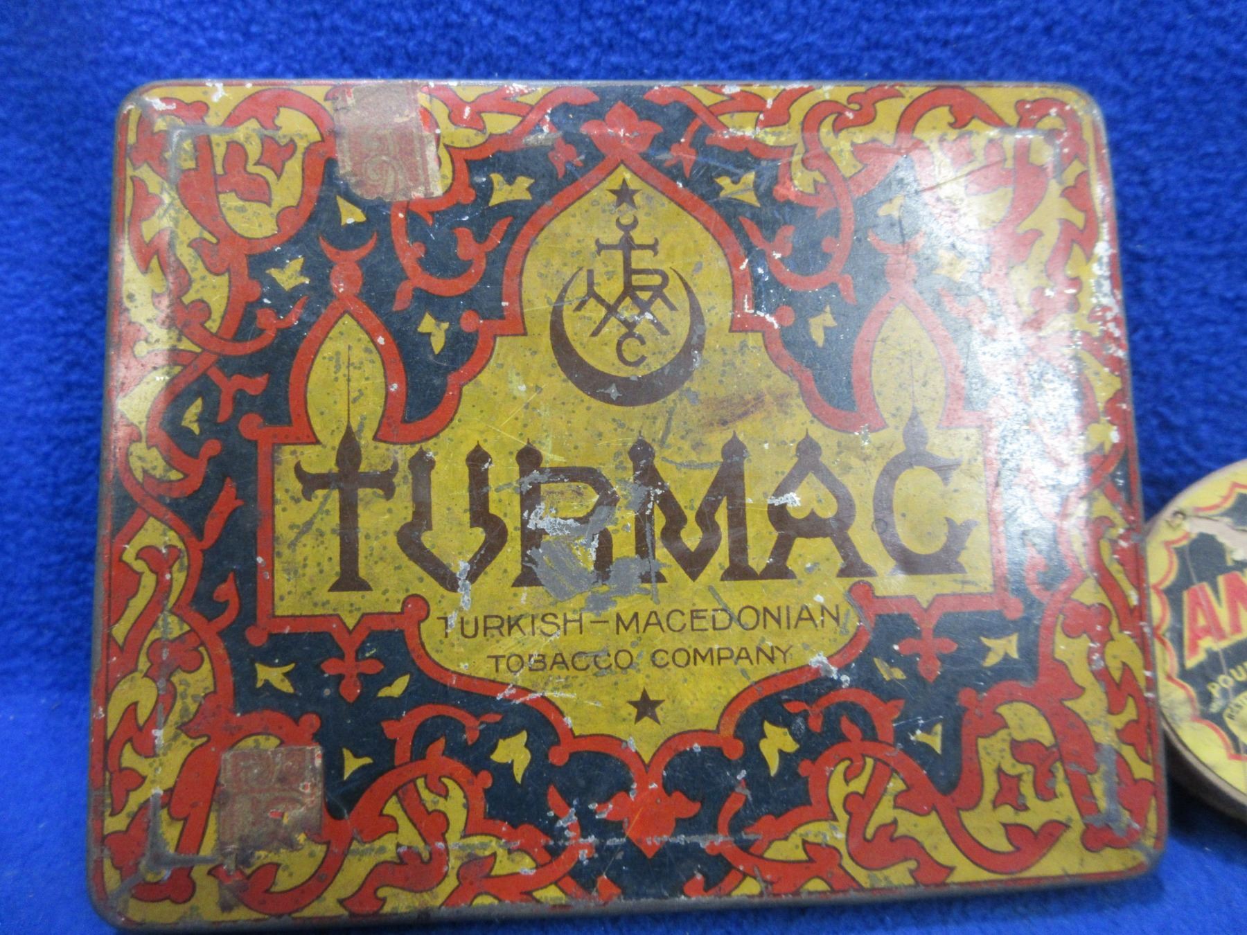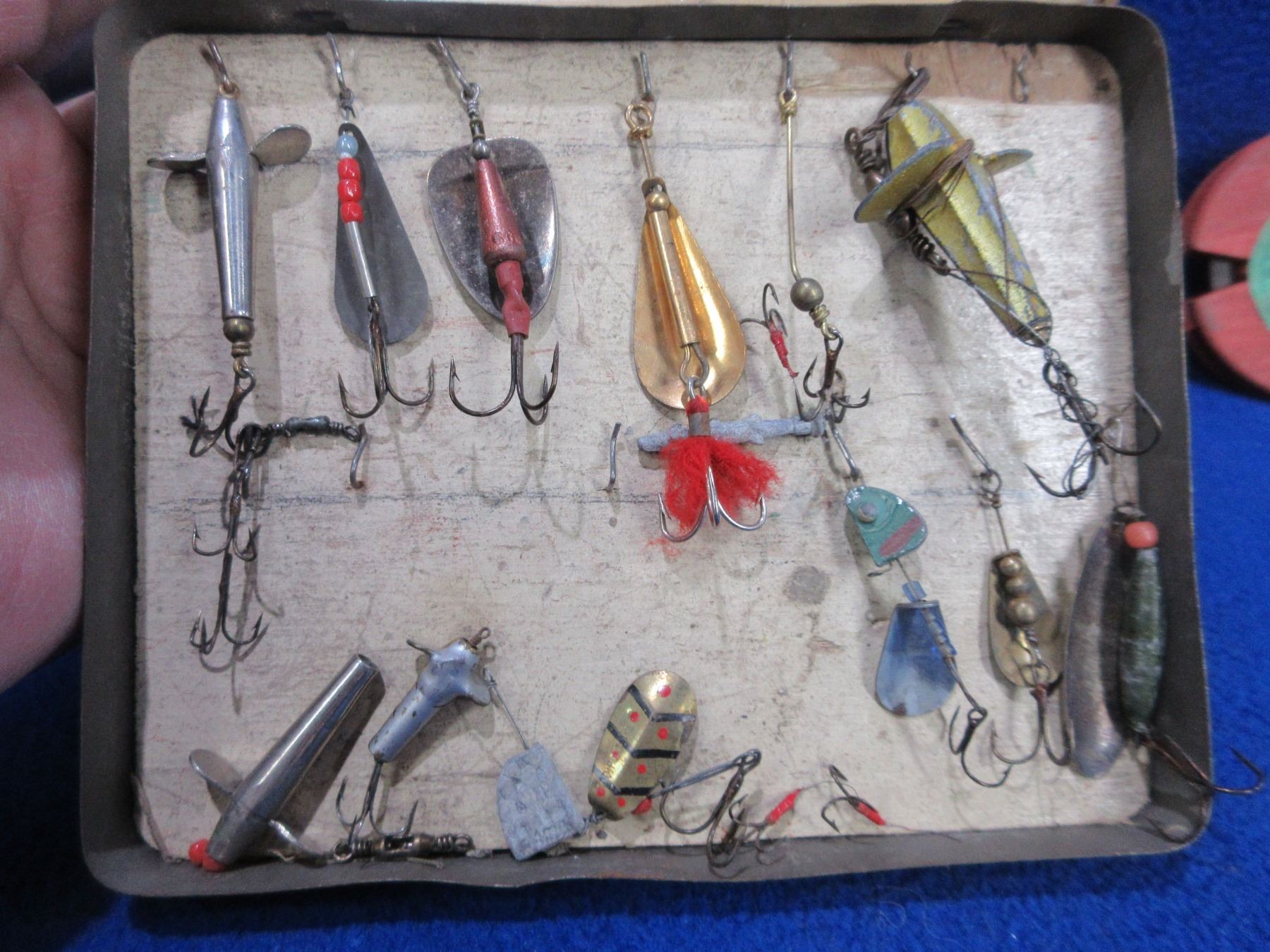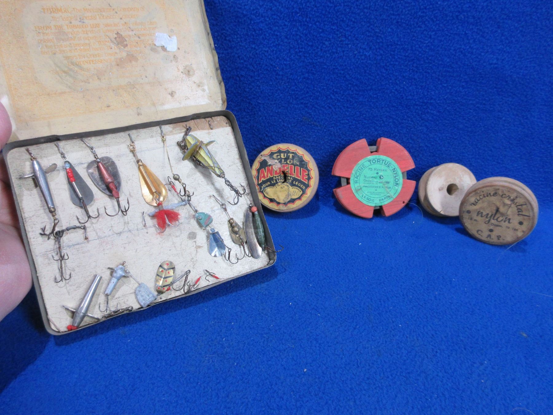 4 Vintage French Wood Fishing Line Spools and French Fishing Lures in Tobacco Tin