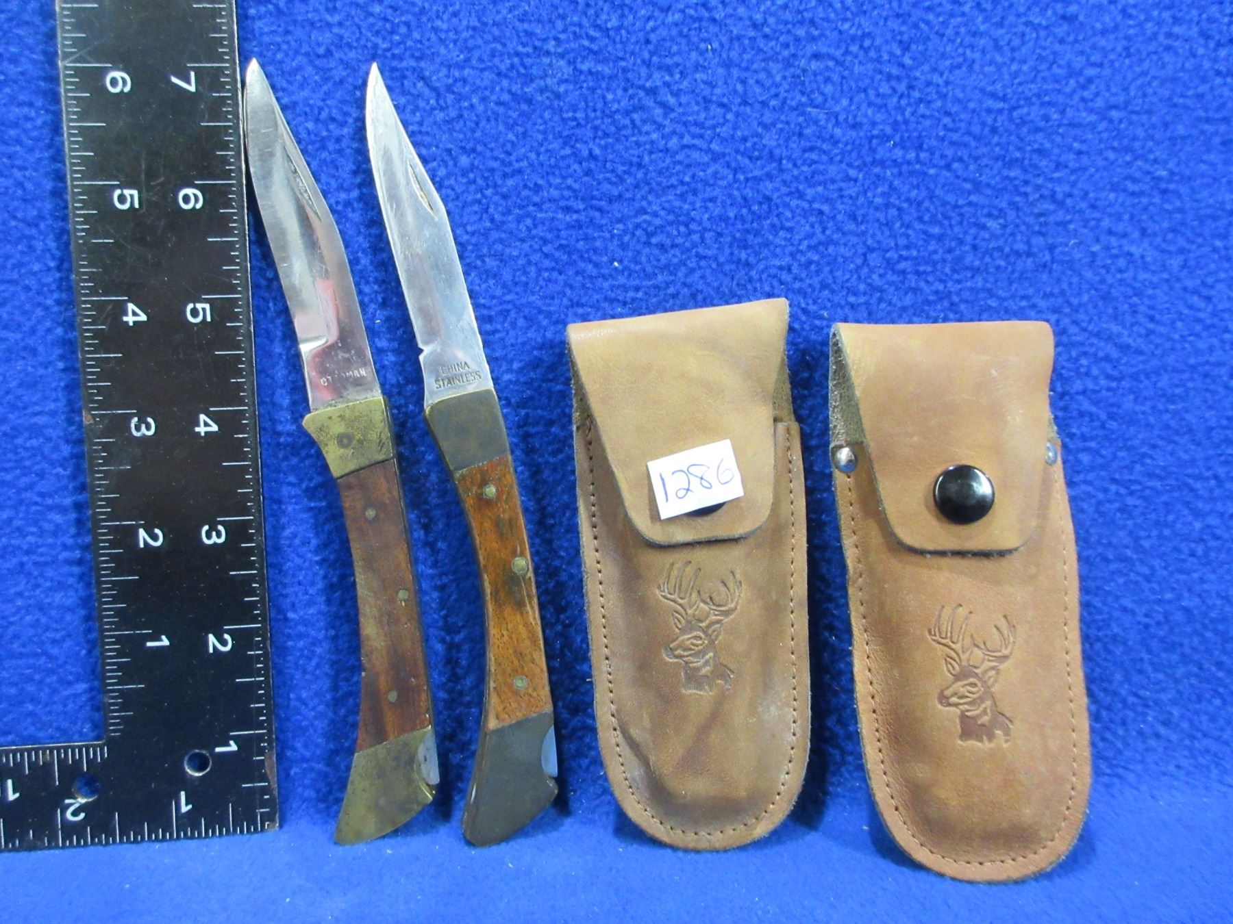 Lot 1286 2 Folding Lock Blade Knives with Leather Sheaths - 3" Blades