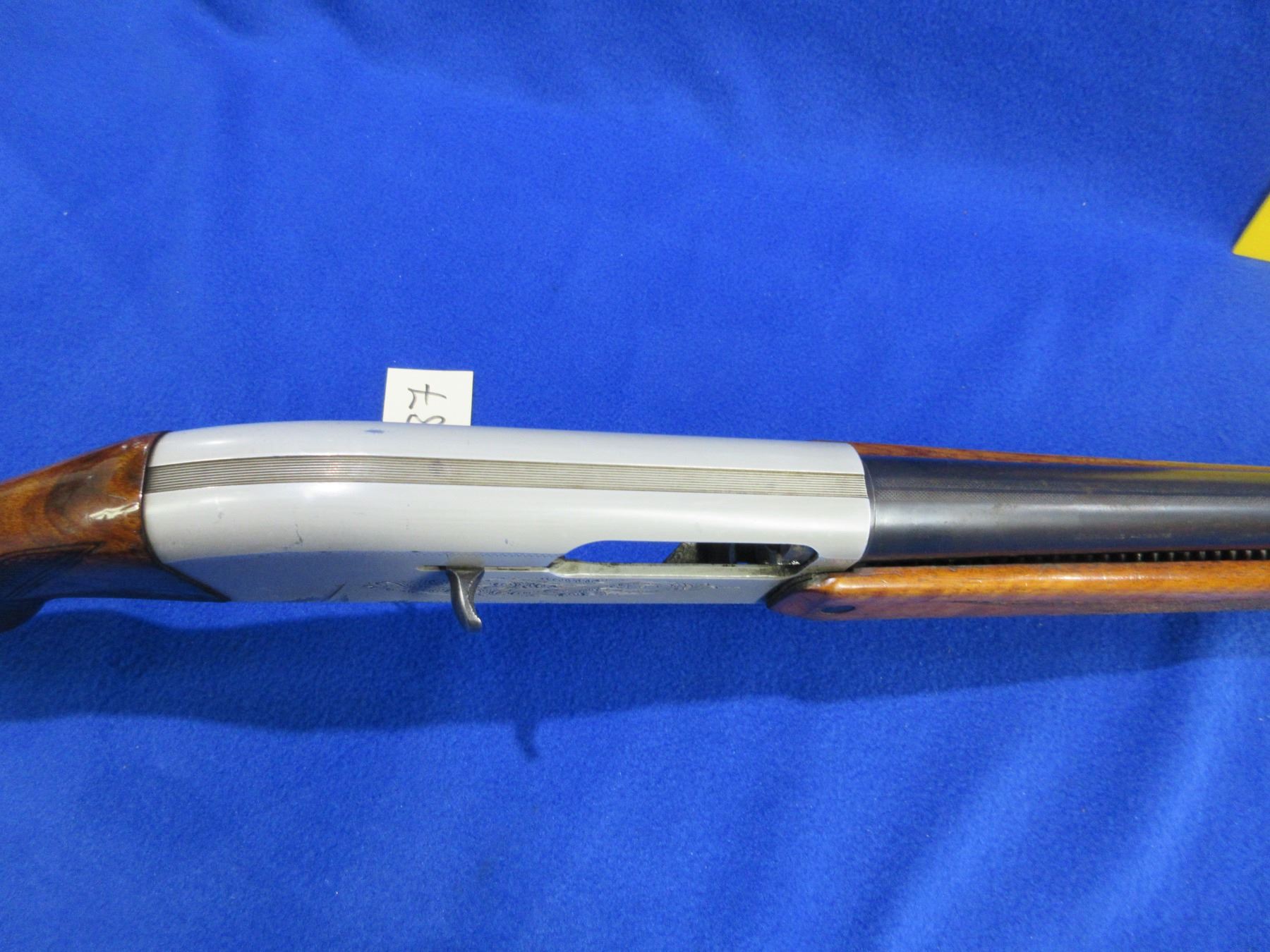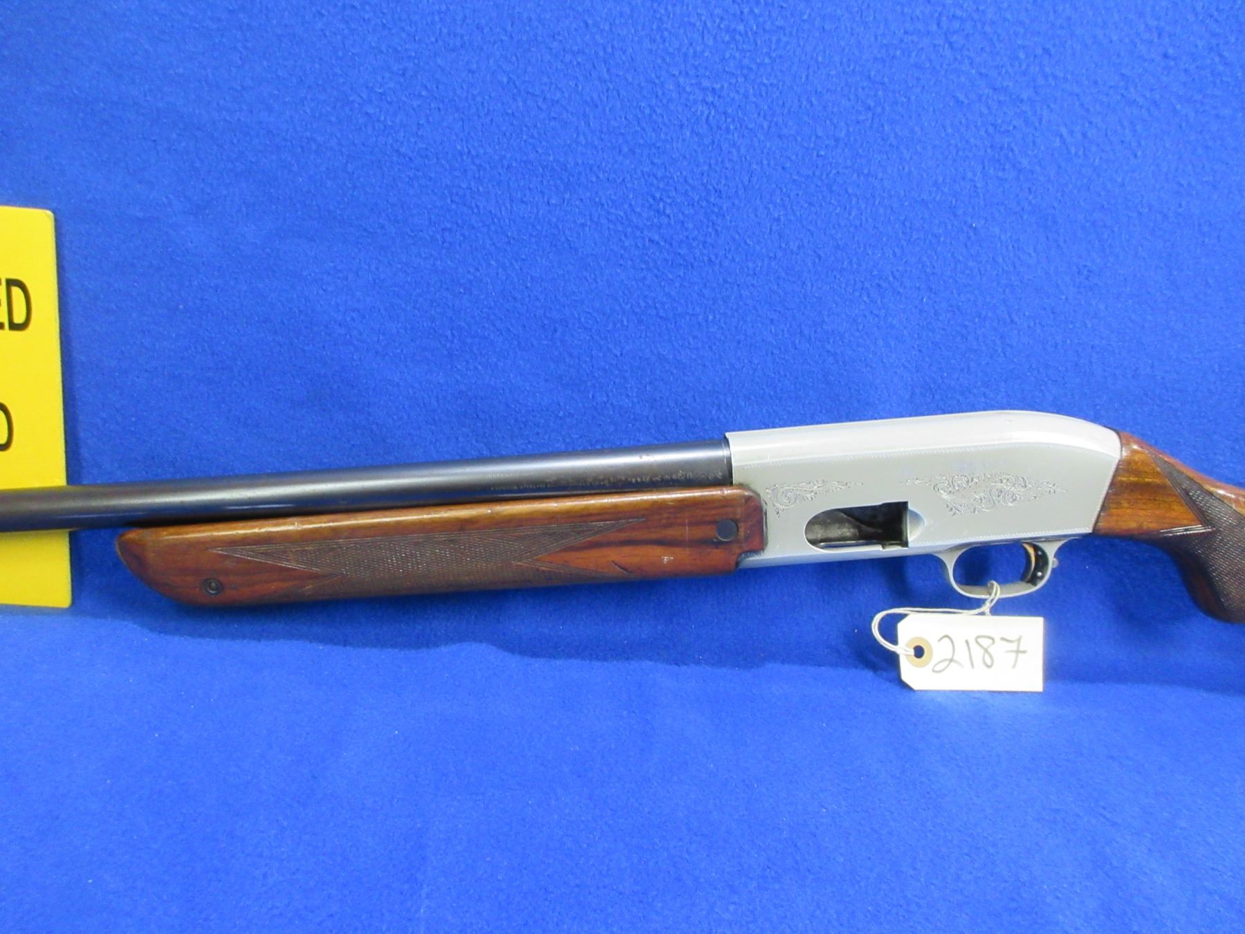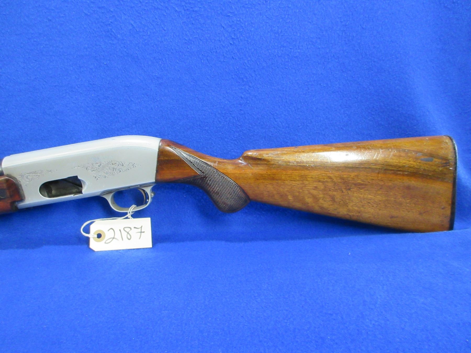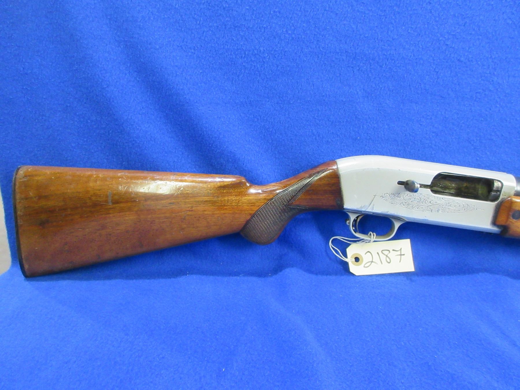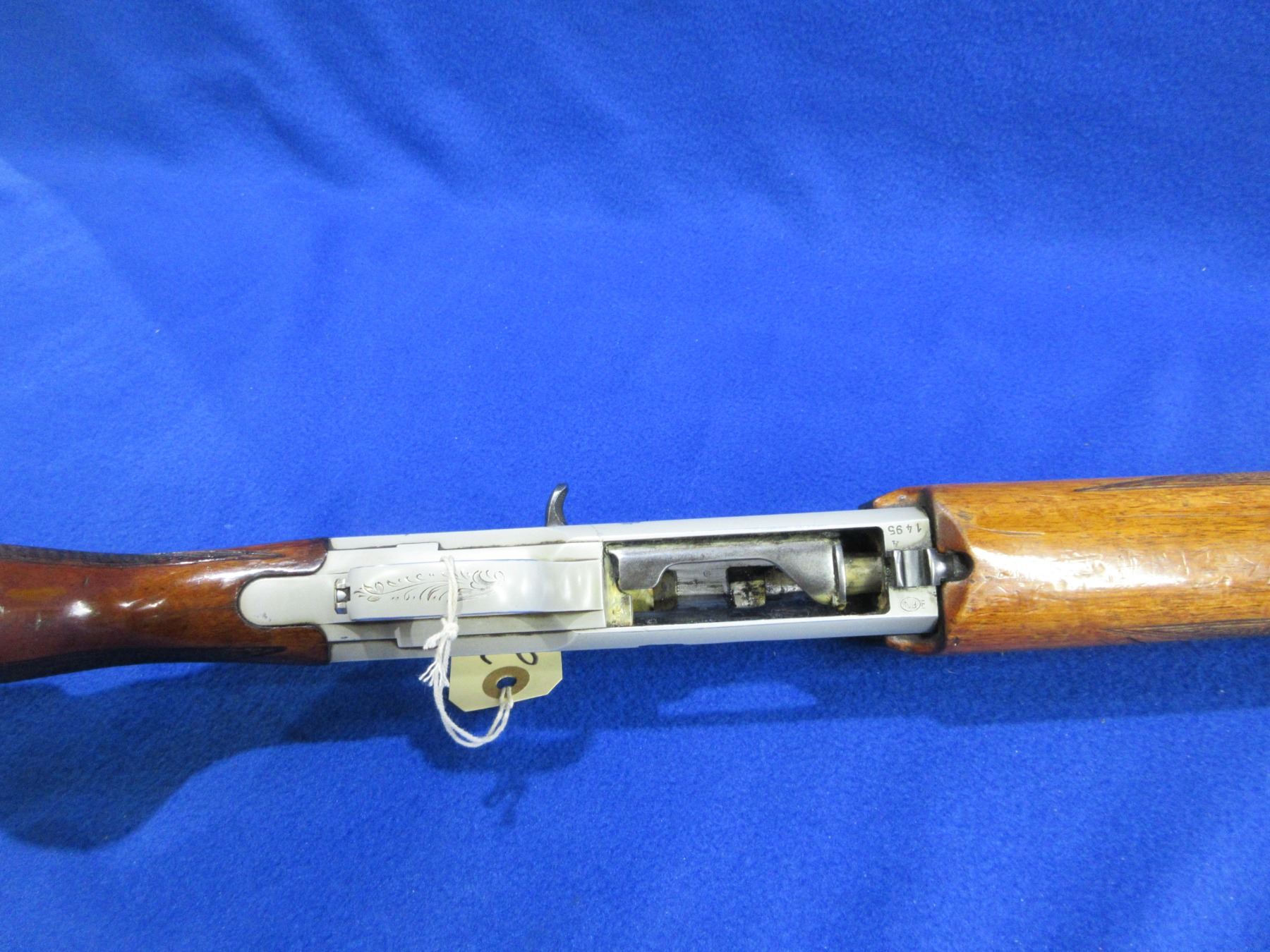 Non-Restricted - Browning Double Auto in 12 Ga. 2 3/4" - This is a pump action Two-Shot shotgun, engraved action is in non working order as action will not close. Barrel is 27 1/2", bore is good, bluing is good, has bead front sight, stock has a crack behind bottom tang in the wrist area, forearm is good with many usage marks, length of pull is 14 1/2", butt plate. Ser # 1495