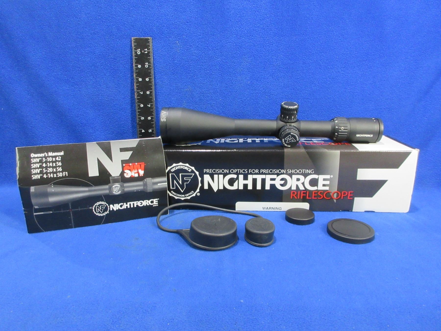Nightforce SHV 5-20x56 SFP Illuminated Scope - 30MM Tube - Appears Clear, MOAR 30 MOA Forceplex Center Illuminated Reticle - 2 pairs of lens covers, manual and original box included