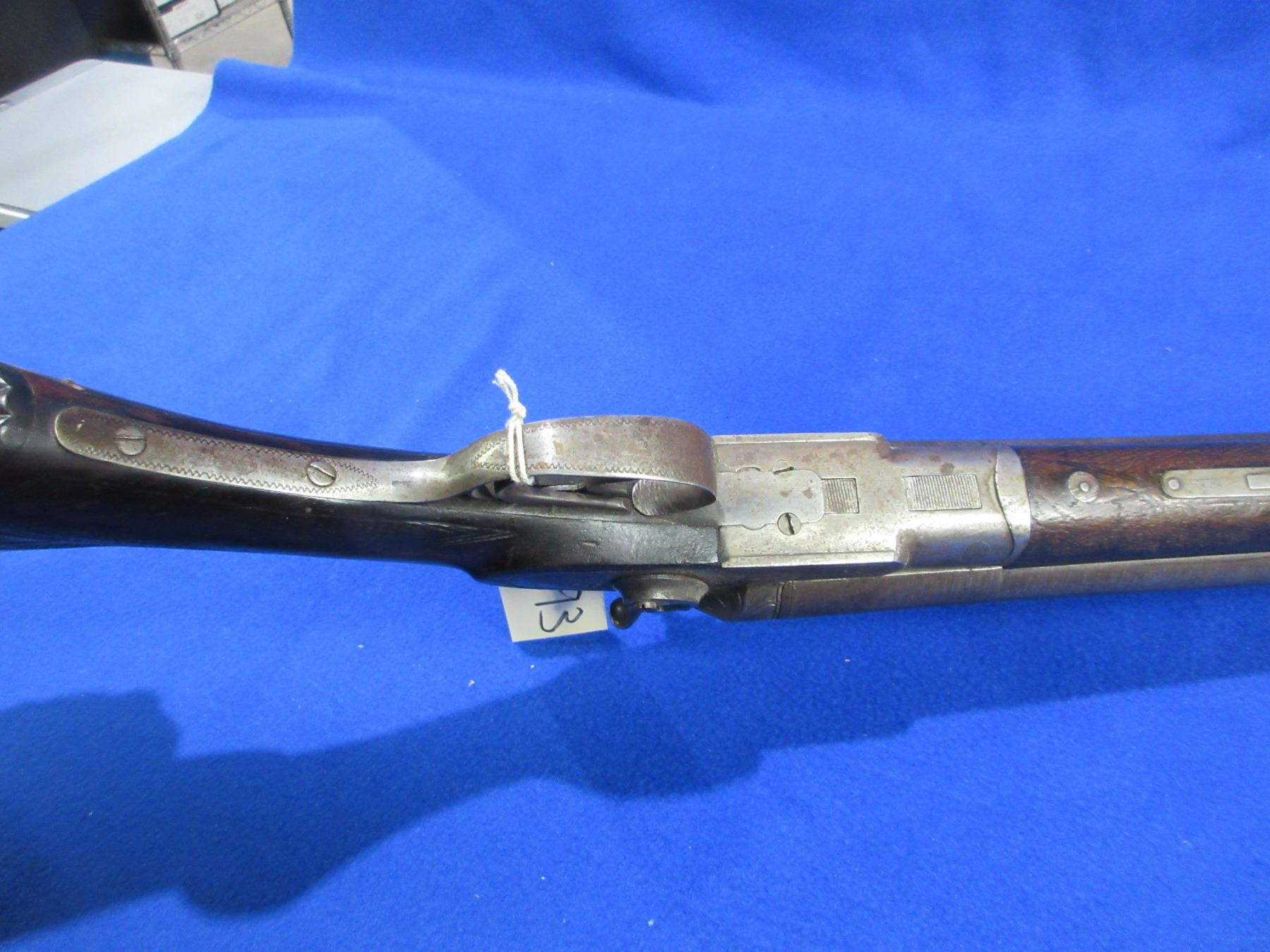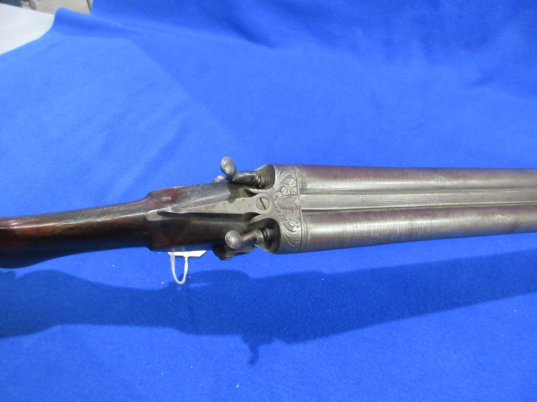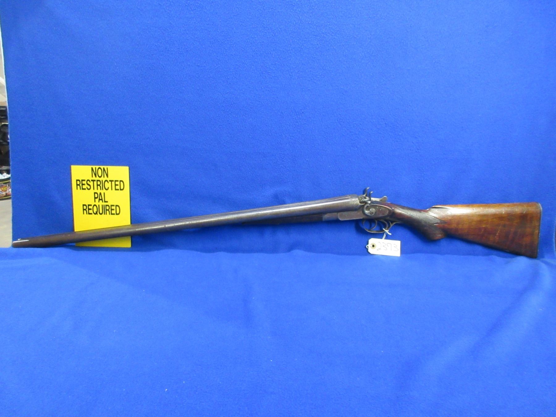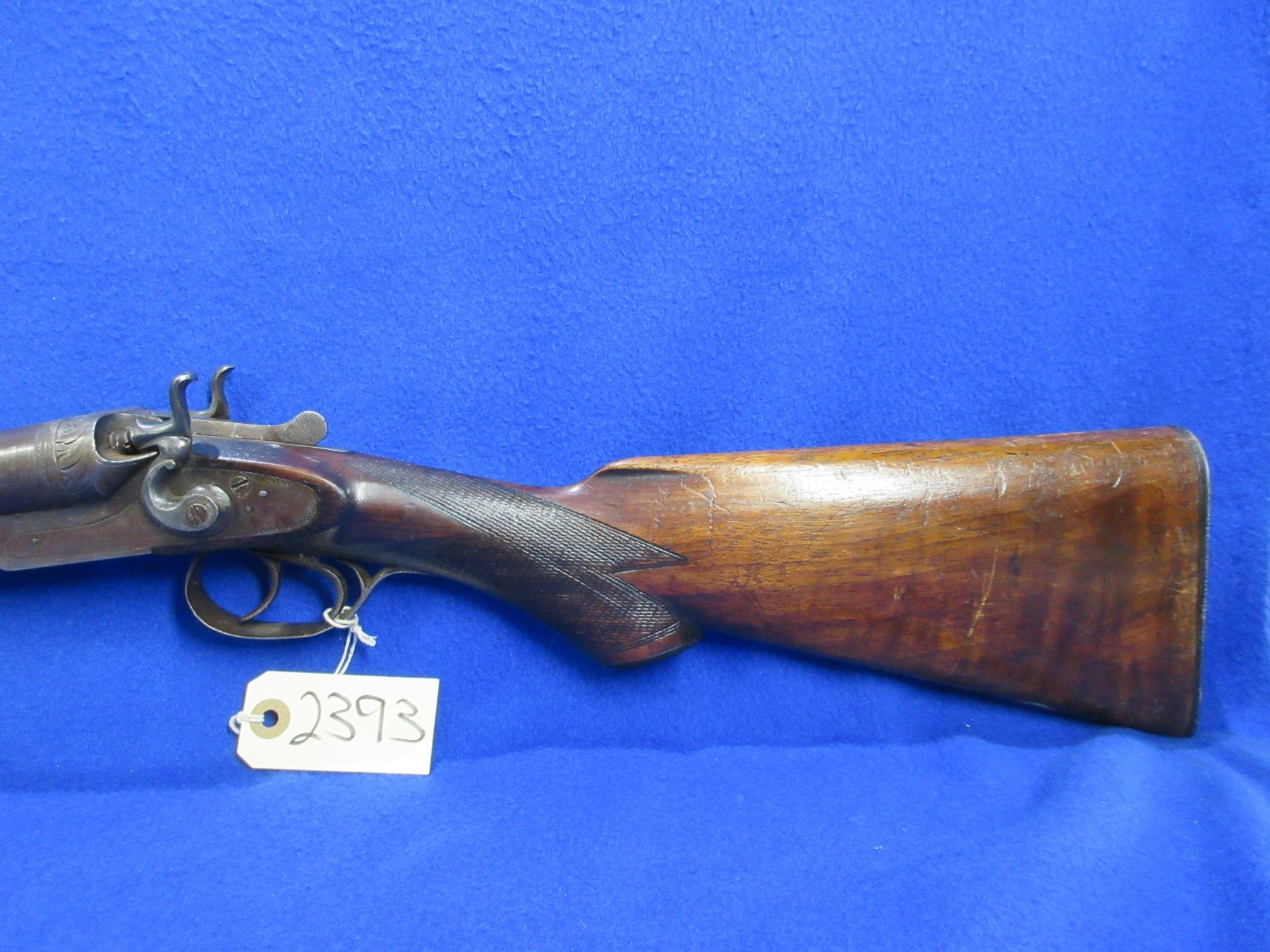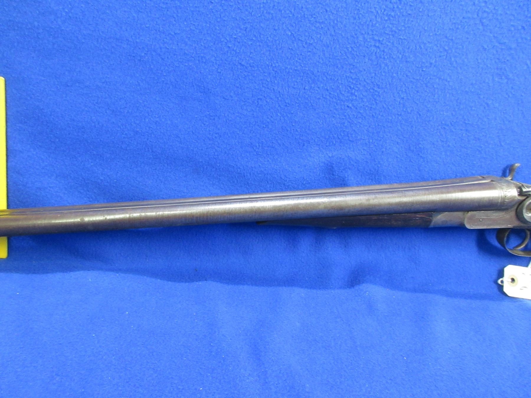 Non-Restricted -Janssen Sons & Co. The Interchangeable in 12 Ga. 2 1/2" - This is a tip up SXS hammer shotgun, action has a small amount of play but appears to be in working order. Damascus barrels are 30", bores are fair to good but left barrel has a small dent approx 5" from muzzle, bluing is turning brown with some light pitting, has bead front sight, stock is good with many usage marks, forearm is good with many usage marks, length of pull is 14", butt plate. Ser # 1740