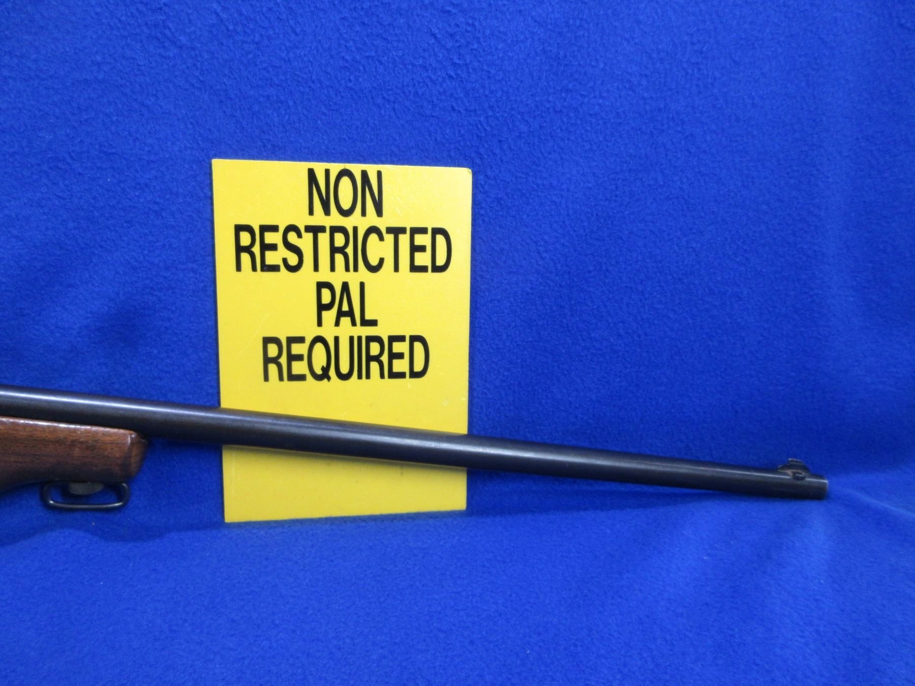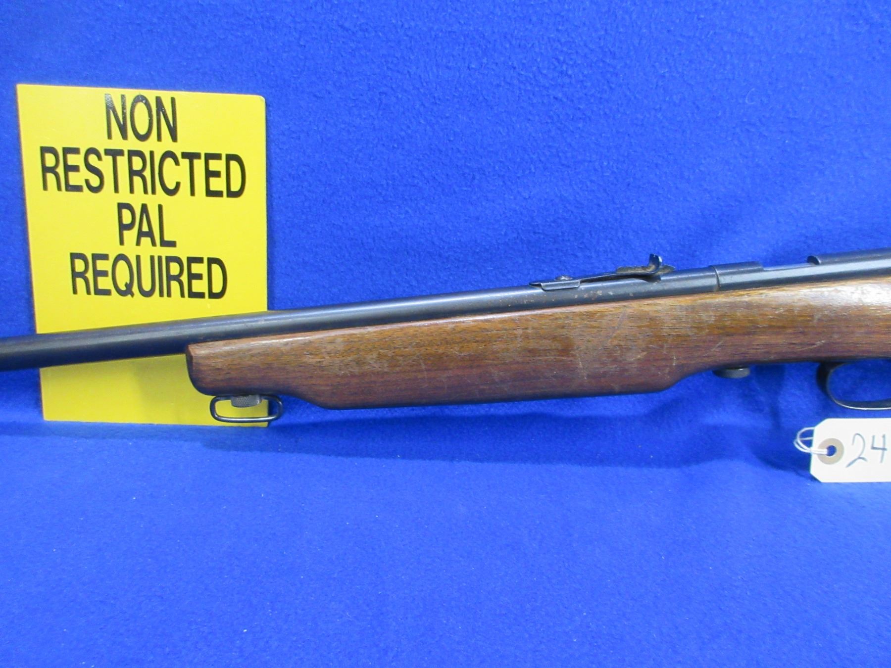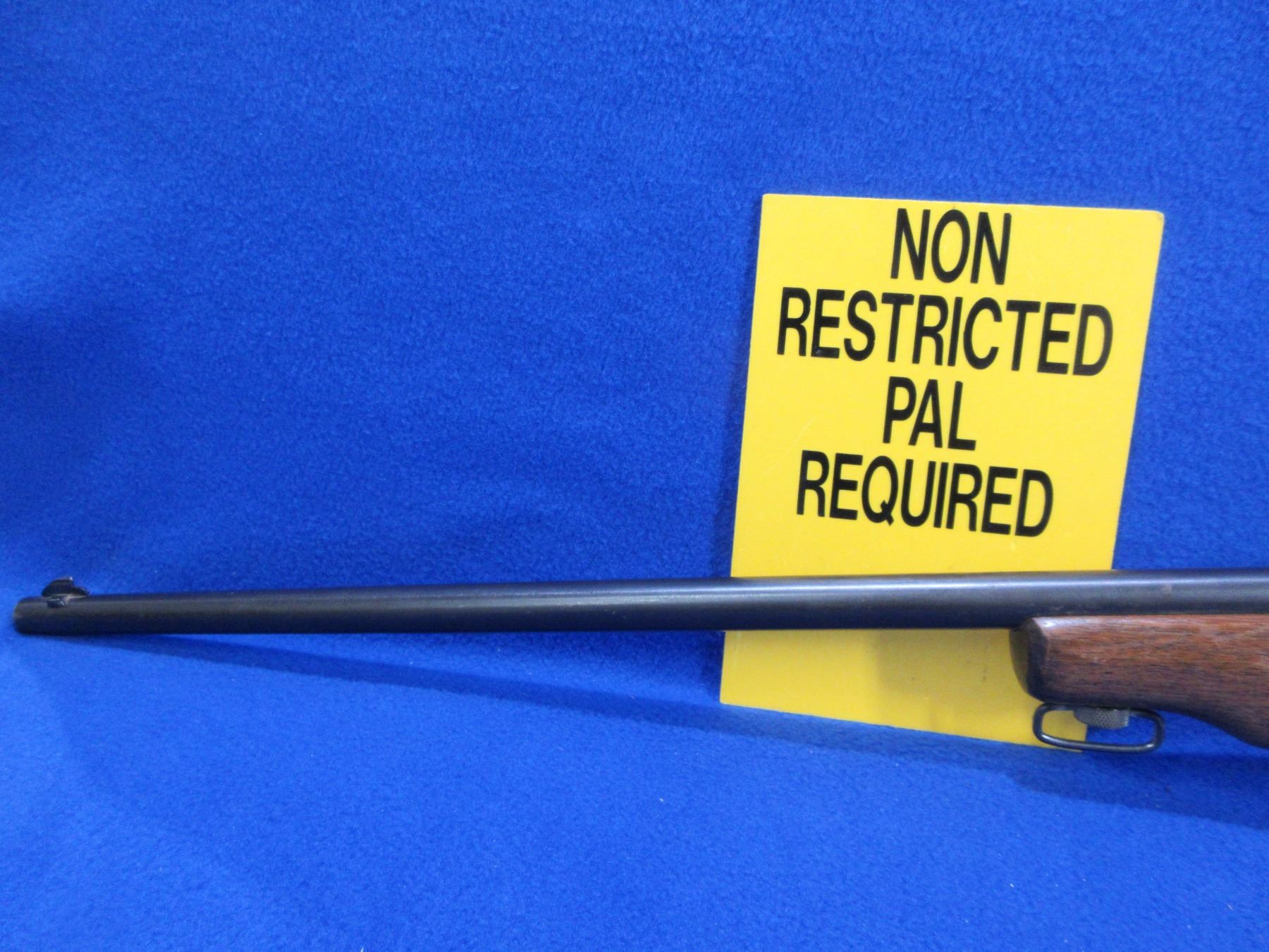 Non-Restricted - Ranger by Cooey in 22 Cal. - This is a single shot bolt action rifle, action appears to be in good working order. Barrel is 27", rifling is good to very good, bluing is good with some light pitting on right side, has both sights, stock is good with usage marks, length of pull is 13", metal butt plate good, comes with swivels. Ser # None