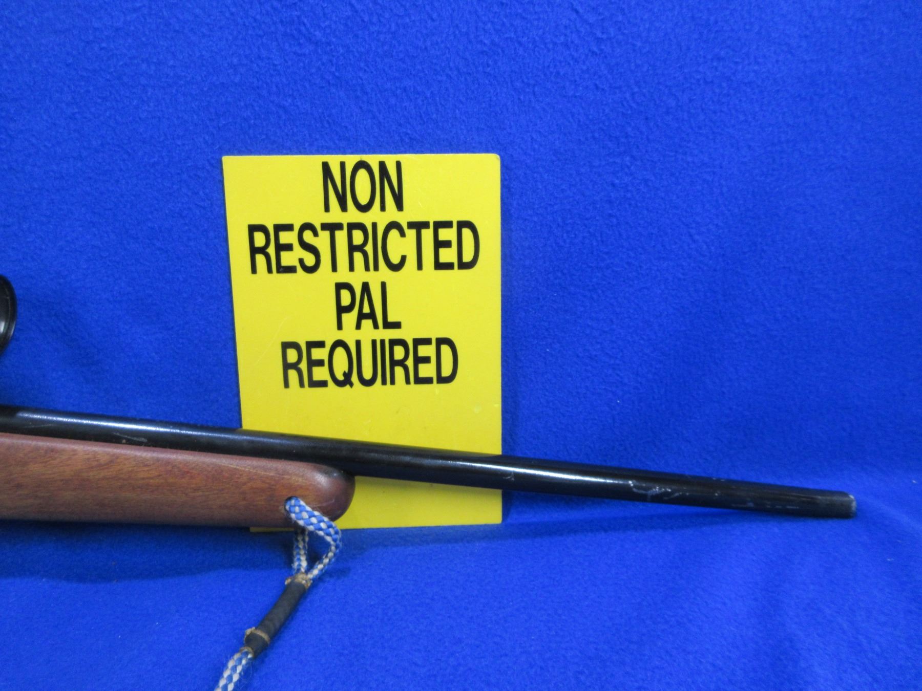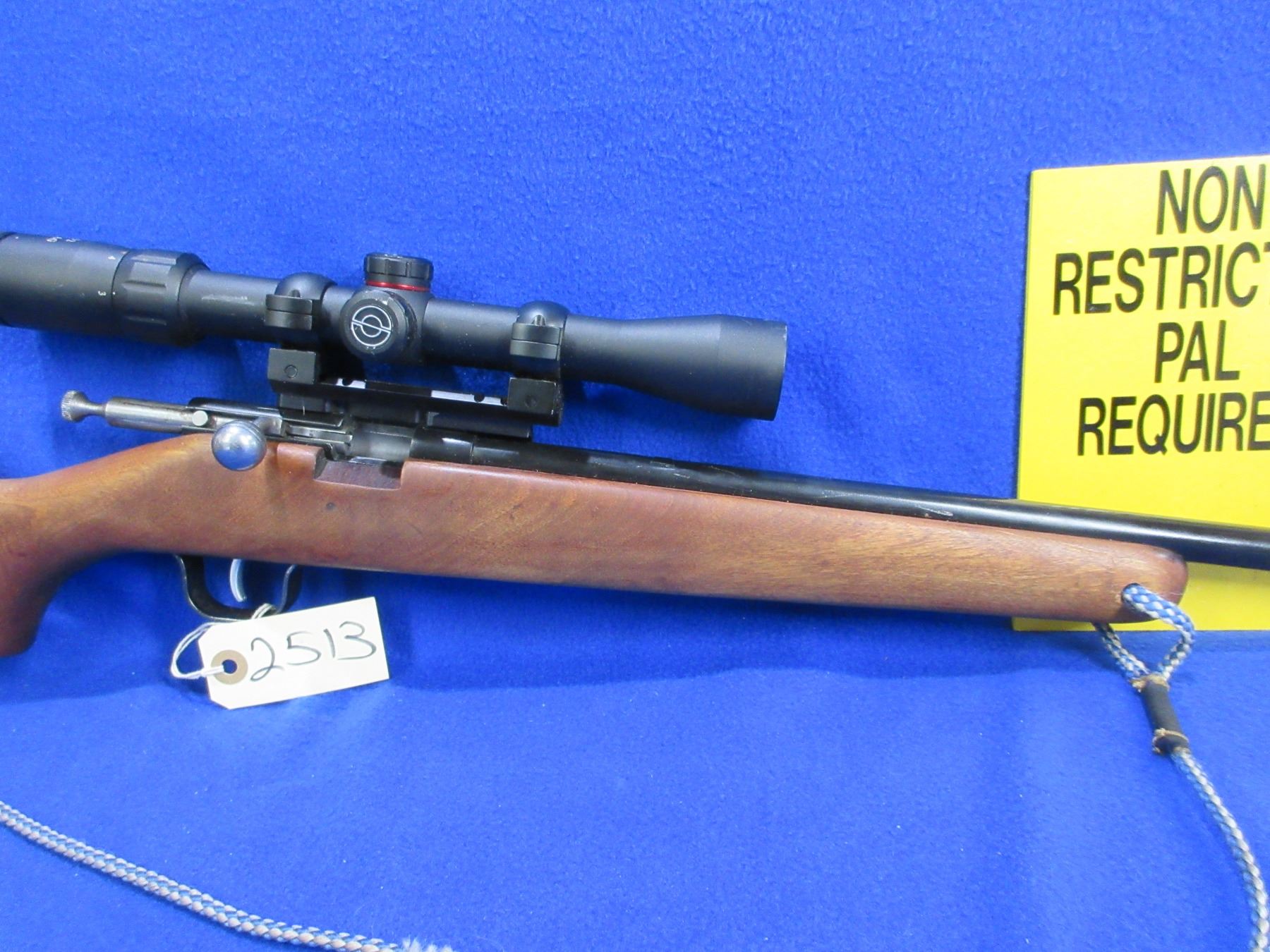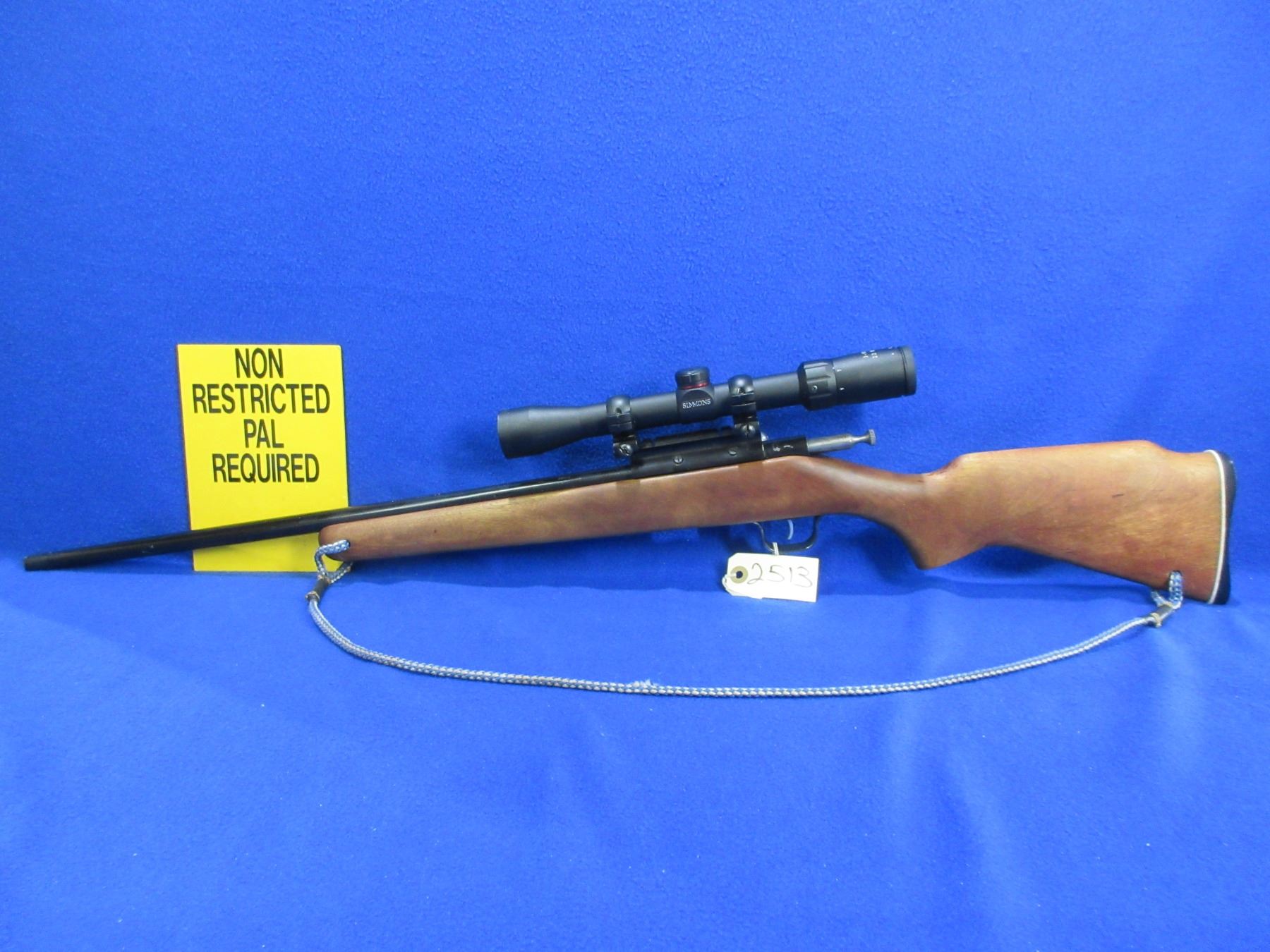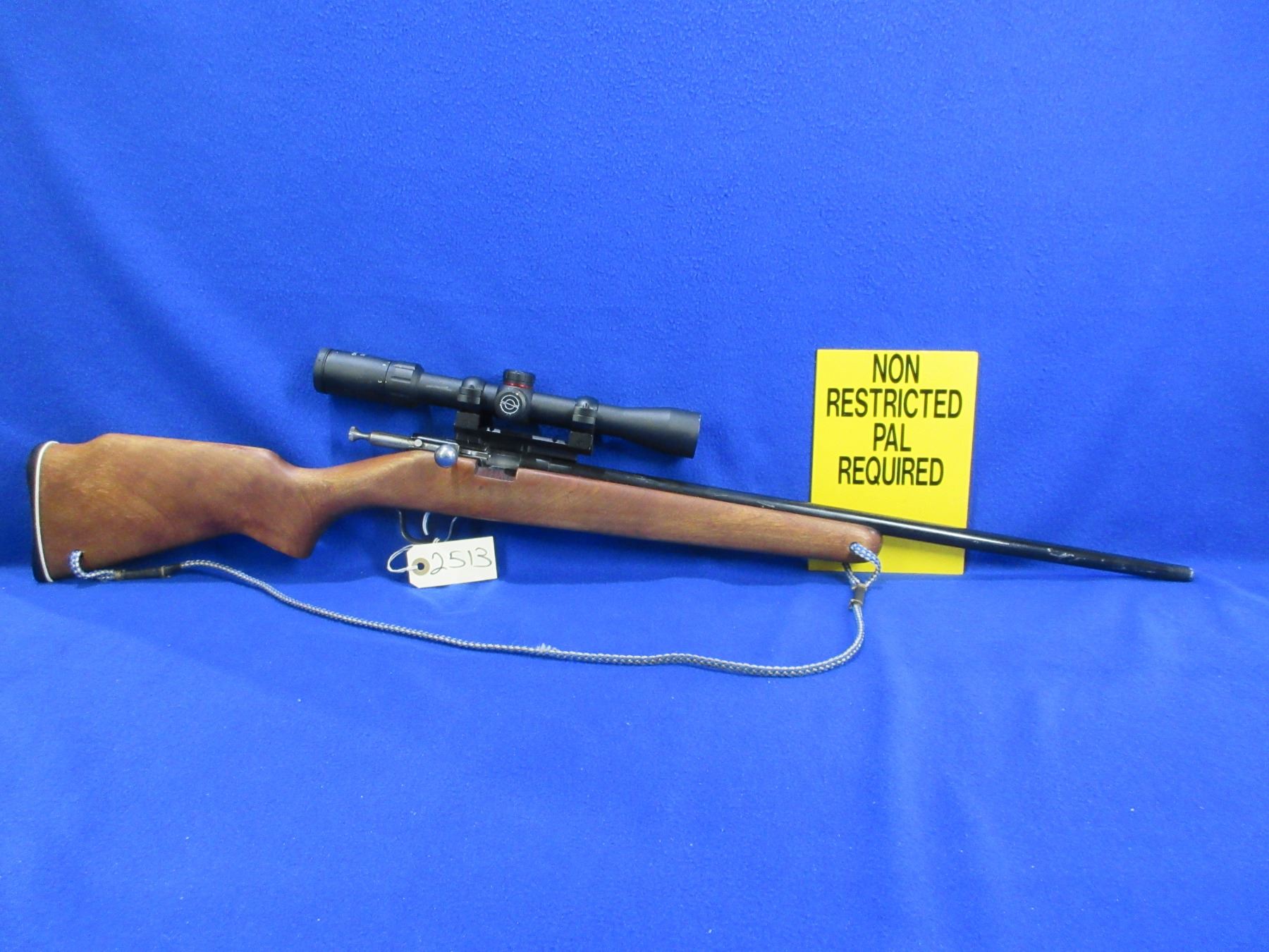 Non-Restricted - Cooey Model 39 in 22 S/L/LR - This is a single shot bolt action rifle, action appears to be in good working order. Barrel is 22", rifling is good to very good, black finish is good, sights are missing but has Simmons 3-9x32 22 Mag scope - appears clear - duplex reticle, stock appears replaced, length of pull is 12 1/2", butt plate incorrectly sized, comes with rope sling attached by holes drilled through the stock. Ser # None