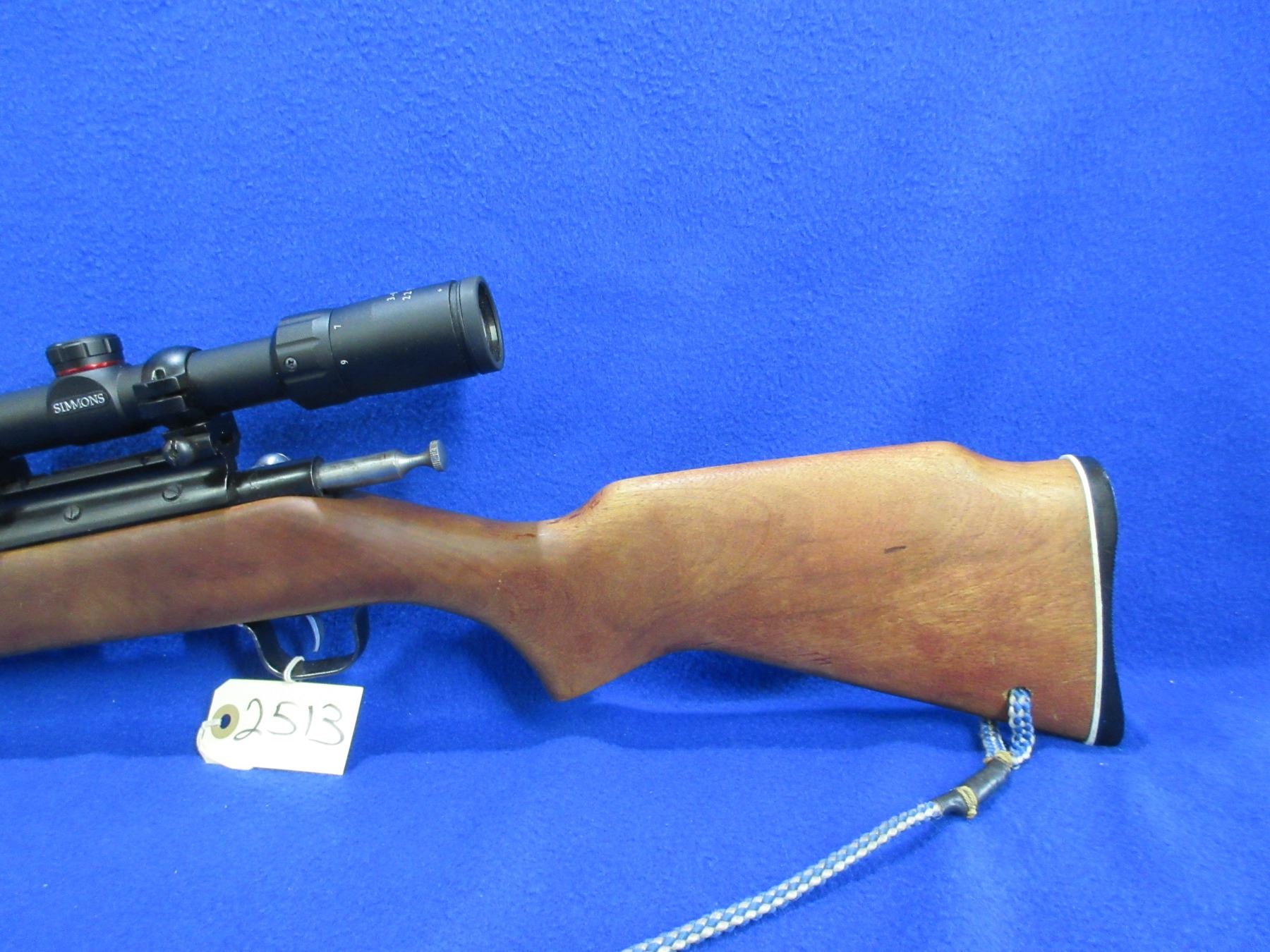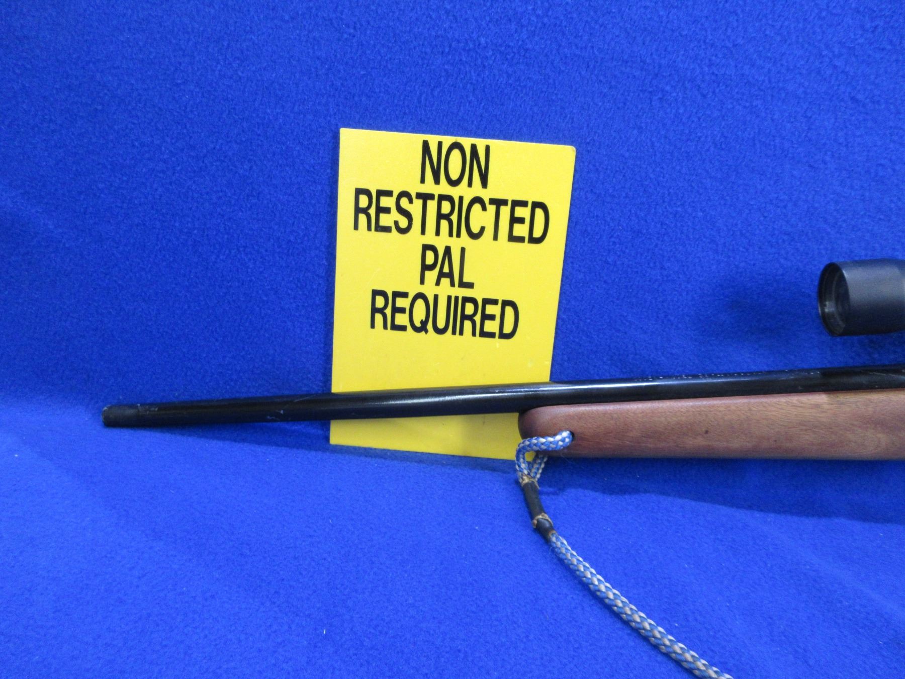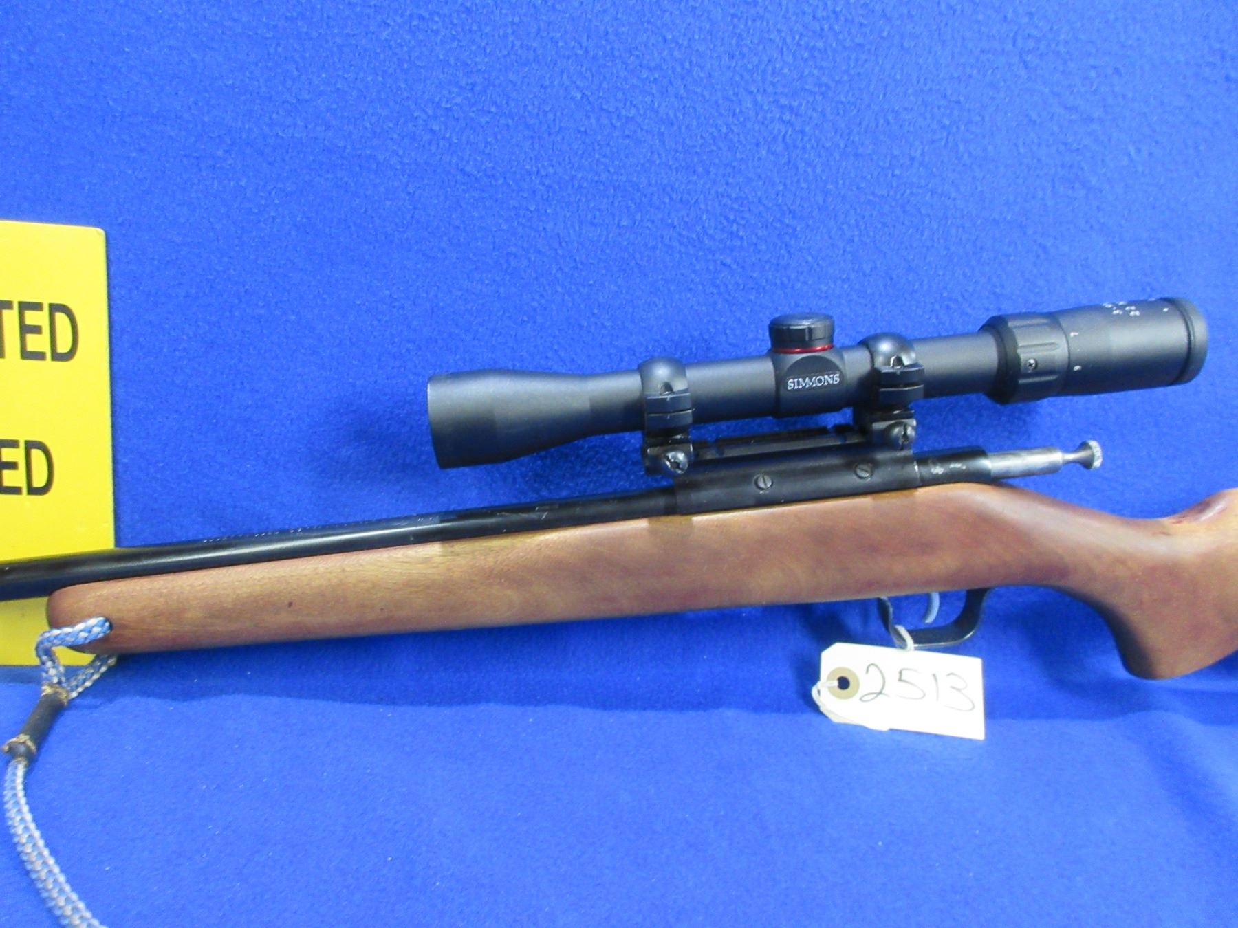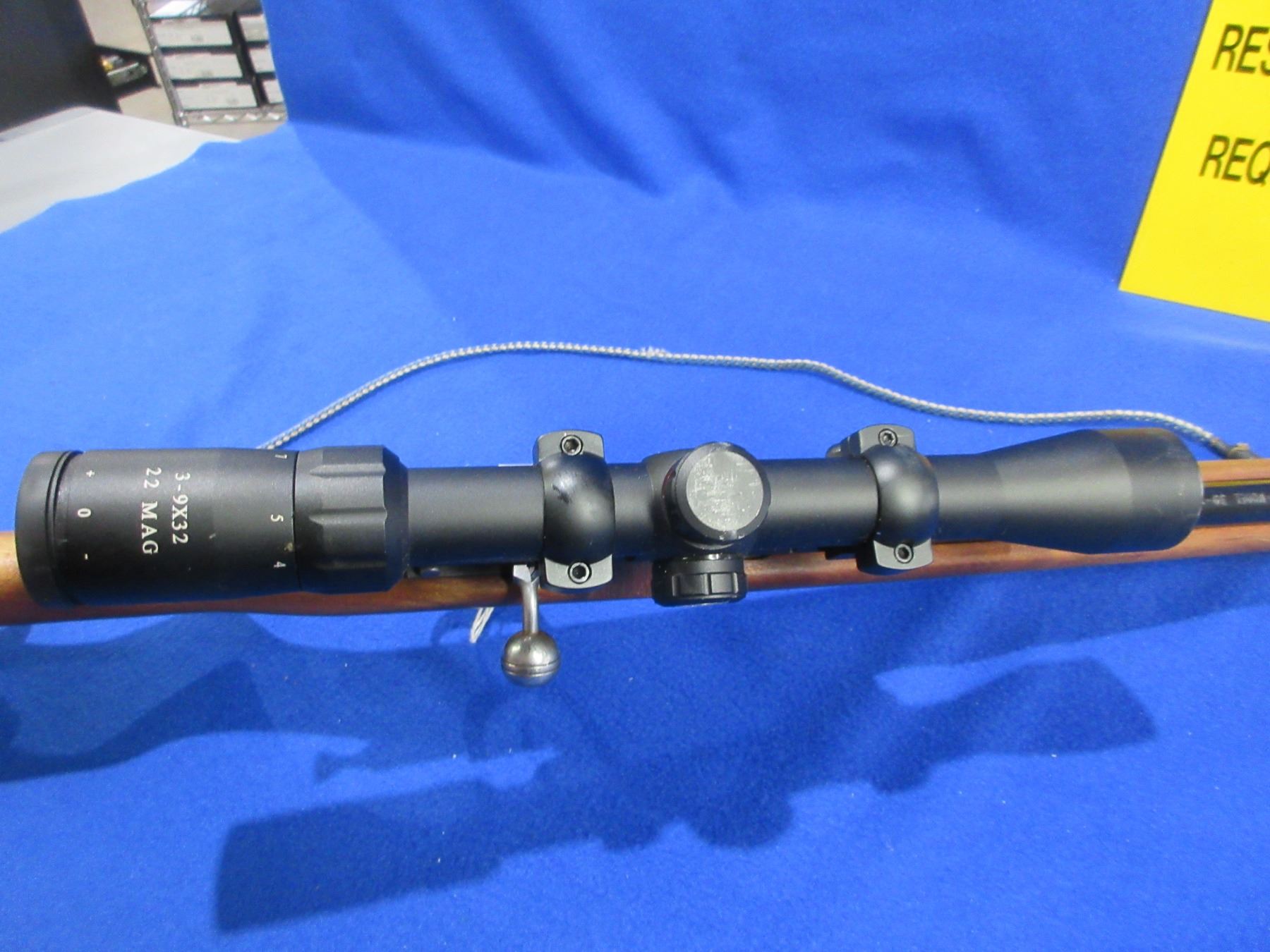 Non-Restricted - Cooey Model 39 in 22 S/L/LR - This is a single shot bolt action rifle, action appears to be in good working order. Barrel is 22", rifling is good to very good, black finish is good, sights are missing but has Simmons 3-9x32 22 Mag scope - appears clear - duplex reticle, stock appears replaced, length of pull is 12 1/2", butt plate incorrectly sized, comes with rope sling attached by holes drilled through the stock. Ser # None