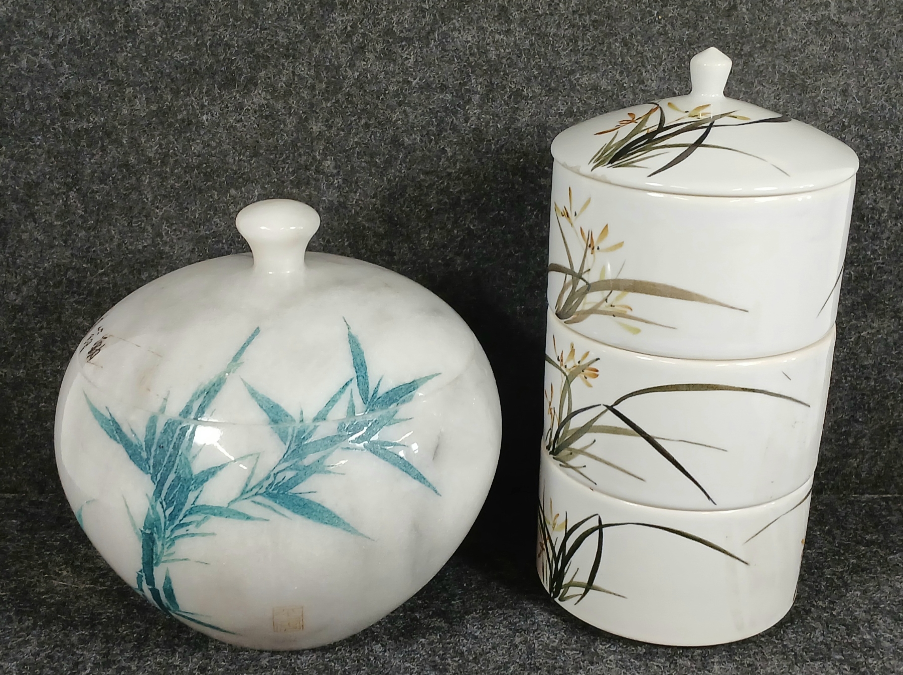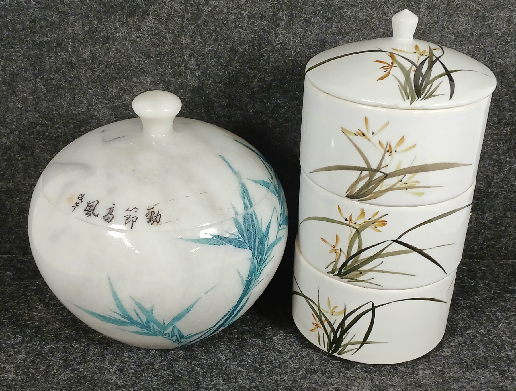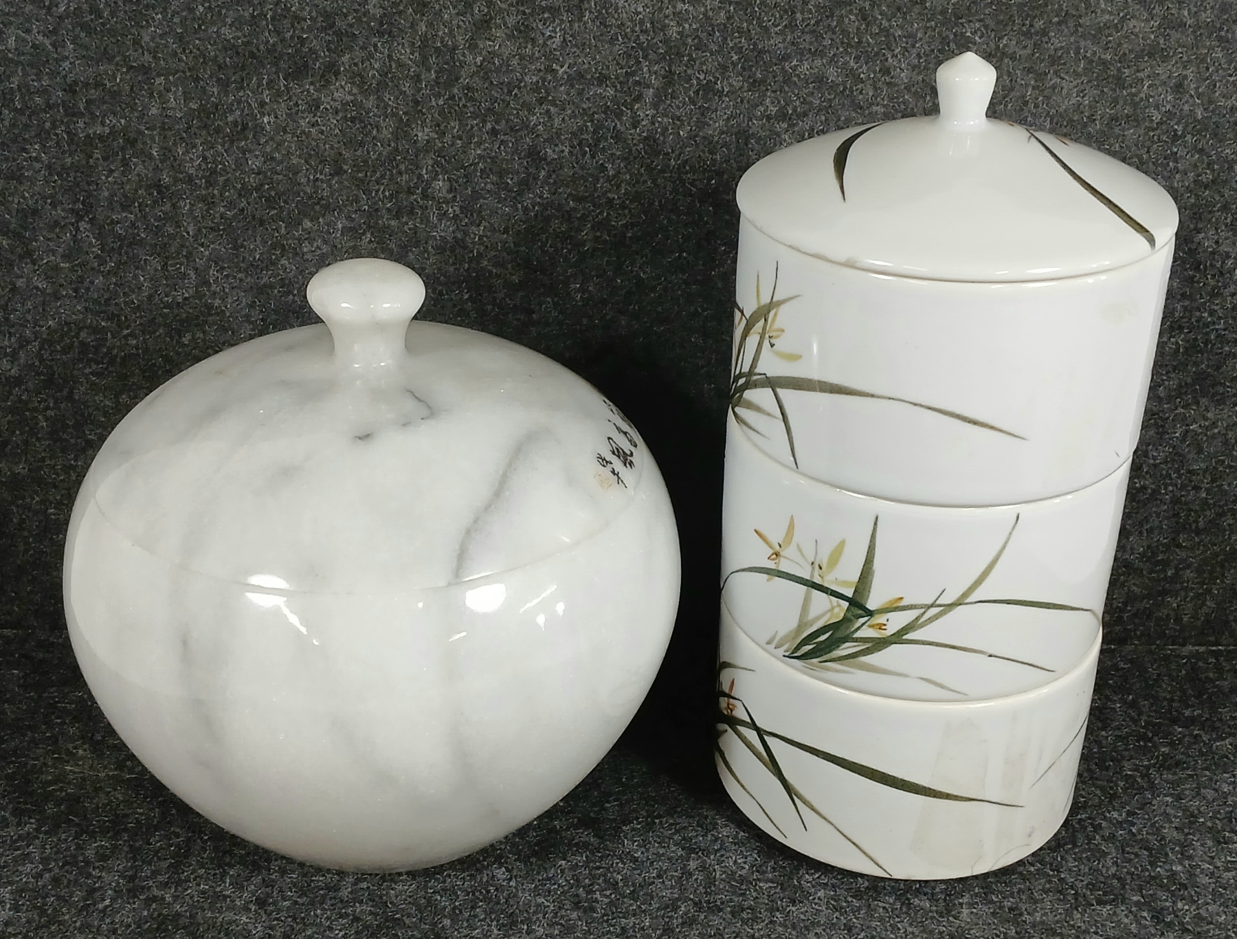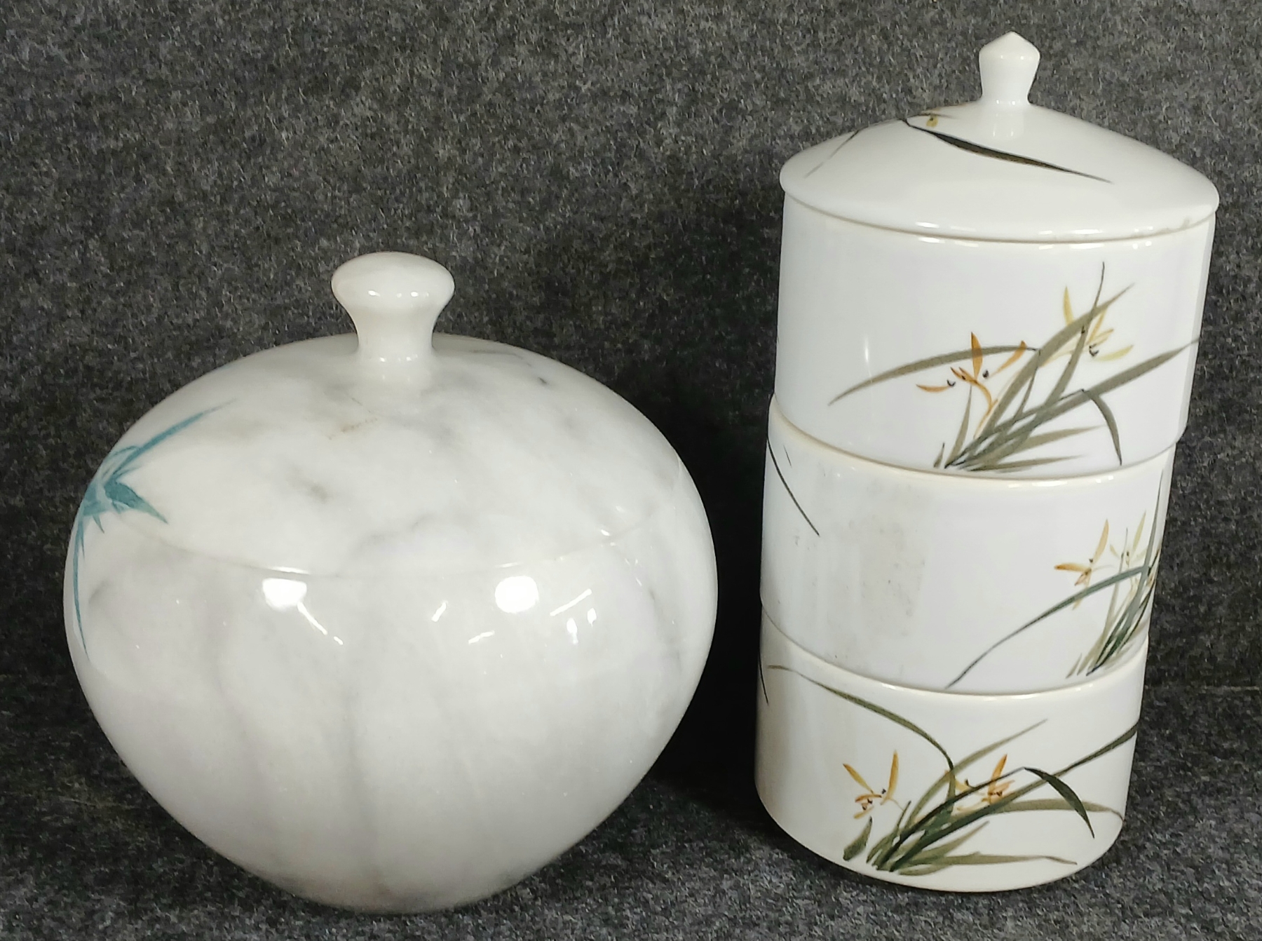 Lot 399 LOT OF 2 - MARBLE LIDDED JAR & 3-TIER PORCELAIN LIDDED CANNISTER SET
