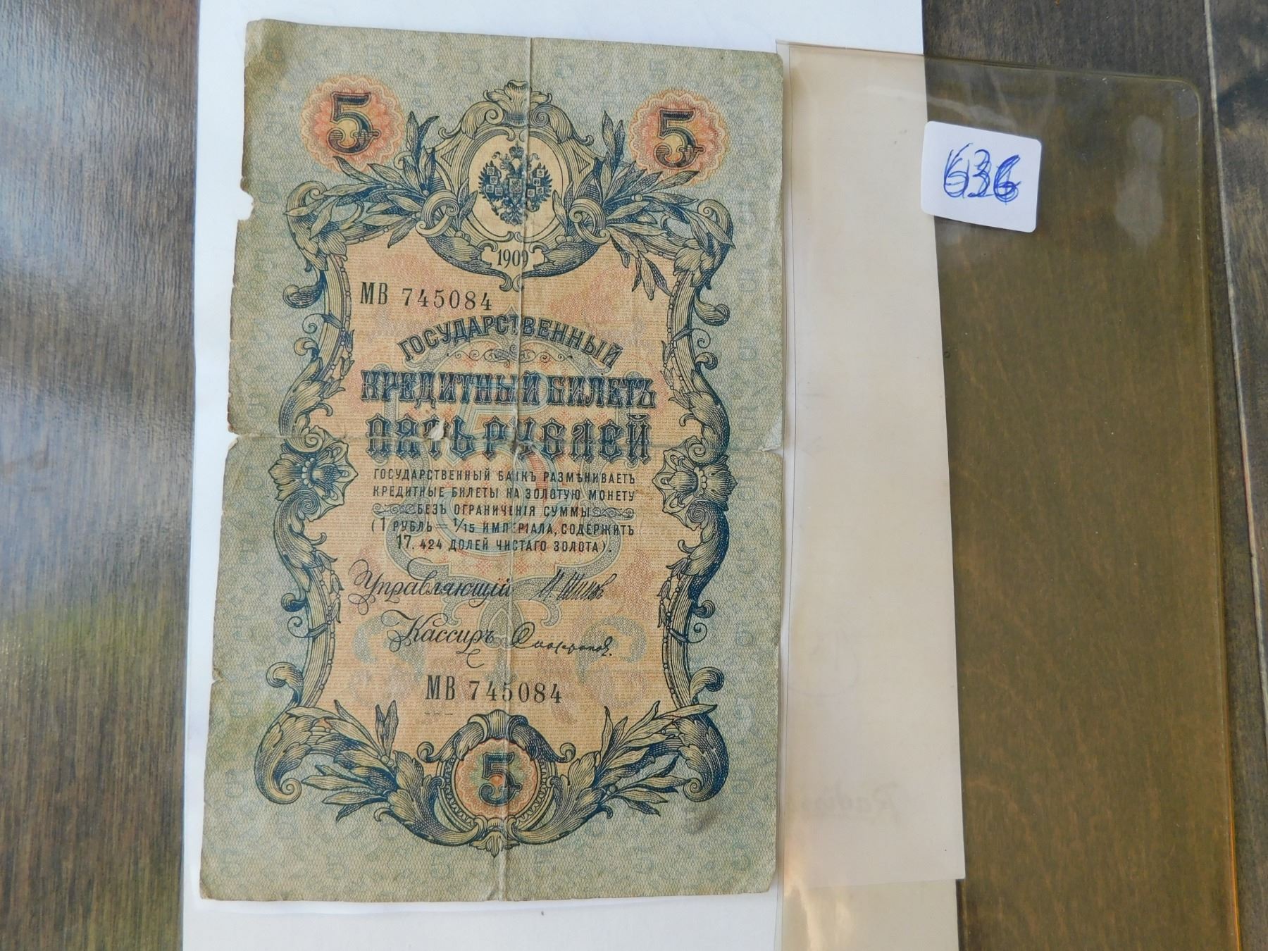 Lot 636 1909 RUSSIAN 5 RUBLES BILL
