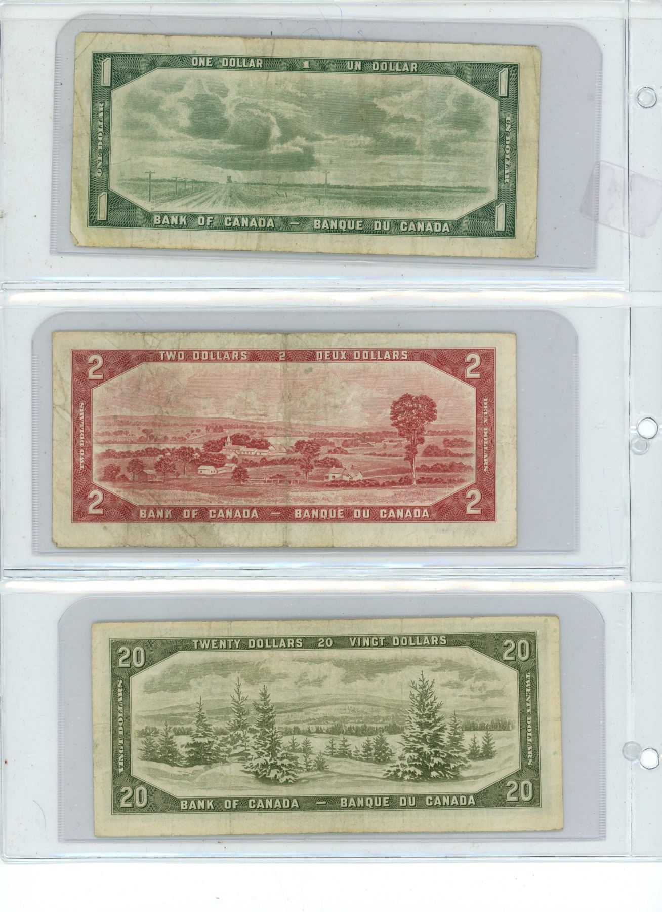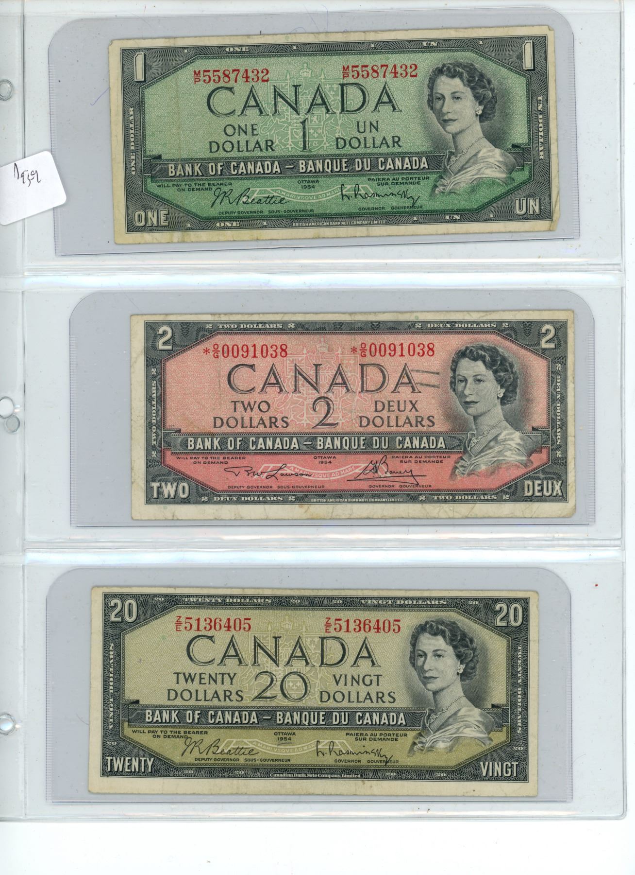 (3) Canadian 1954 Bills (1, 2, and 20 Dollar Bills)