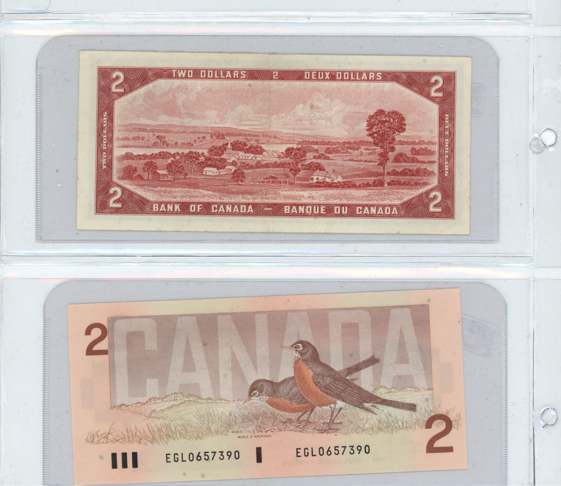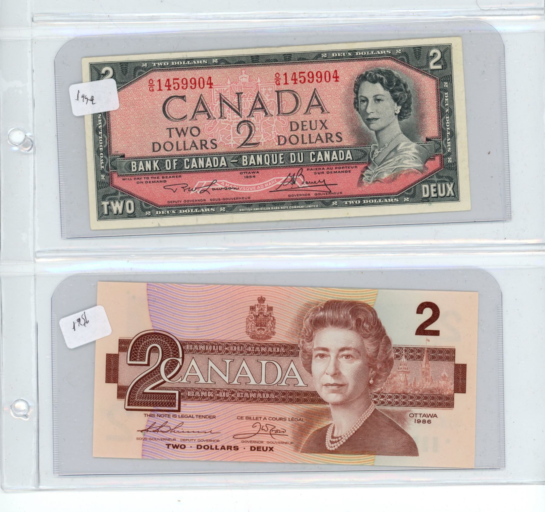 (2) Canadian 2 Dollar Bills (1) 1954 1459904 (1) 1986 EGL0657390