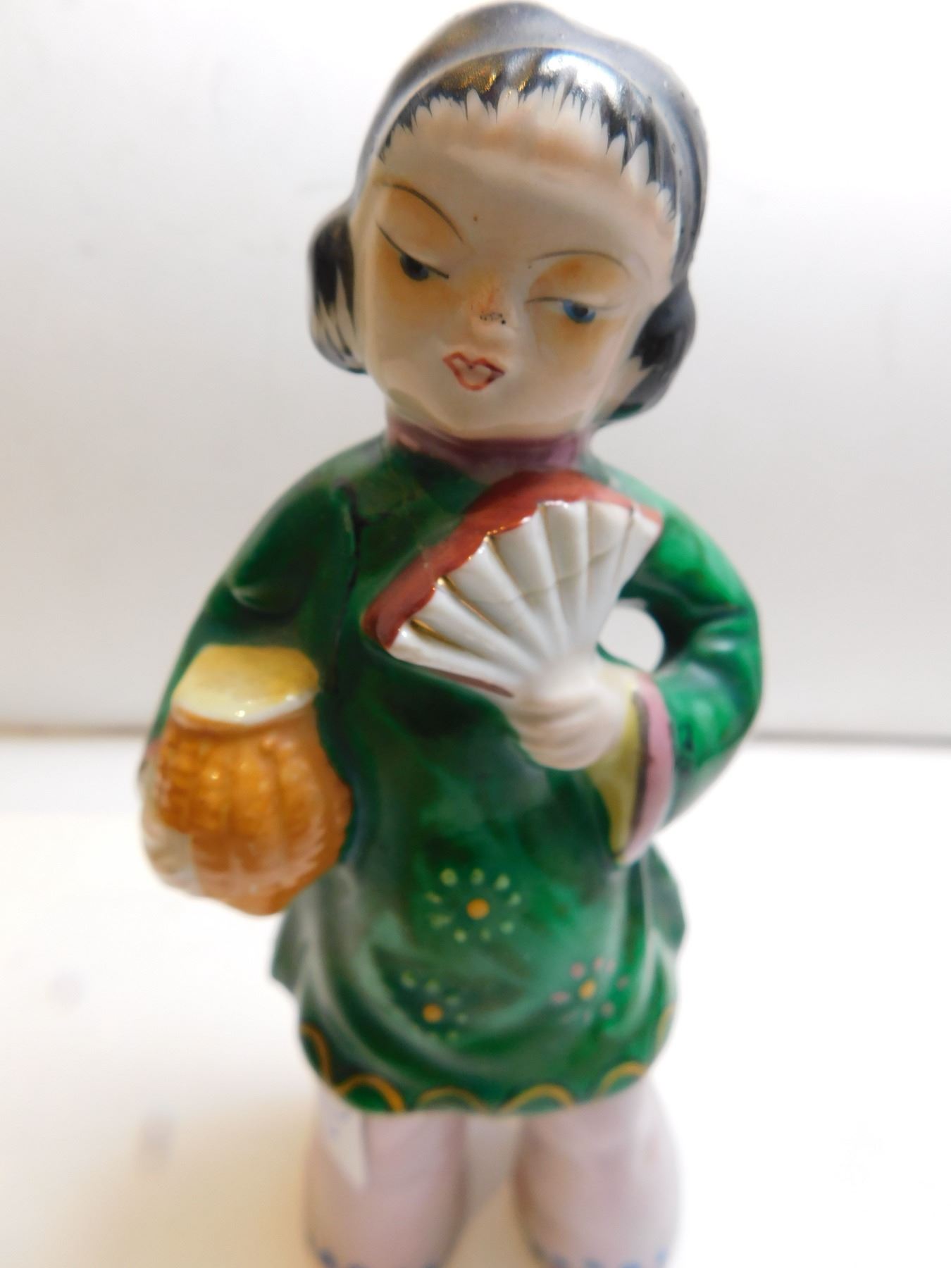 OCCUPIED JAPAN SALT AND PEPPER GIRL WITH FAN, FAN IS REPAIRED