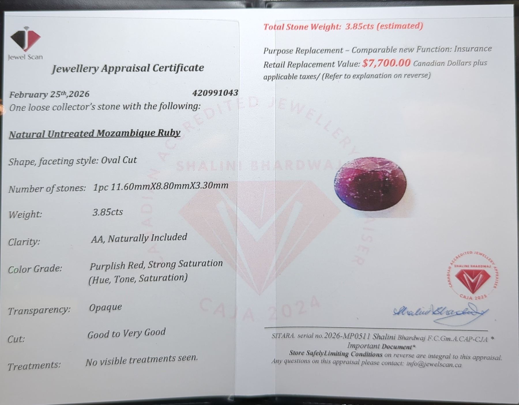 Lot 895 3.85 ct Certified Mozambique Ruby gemstone Unheated ($7,700 Appraisal)