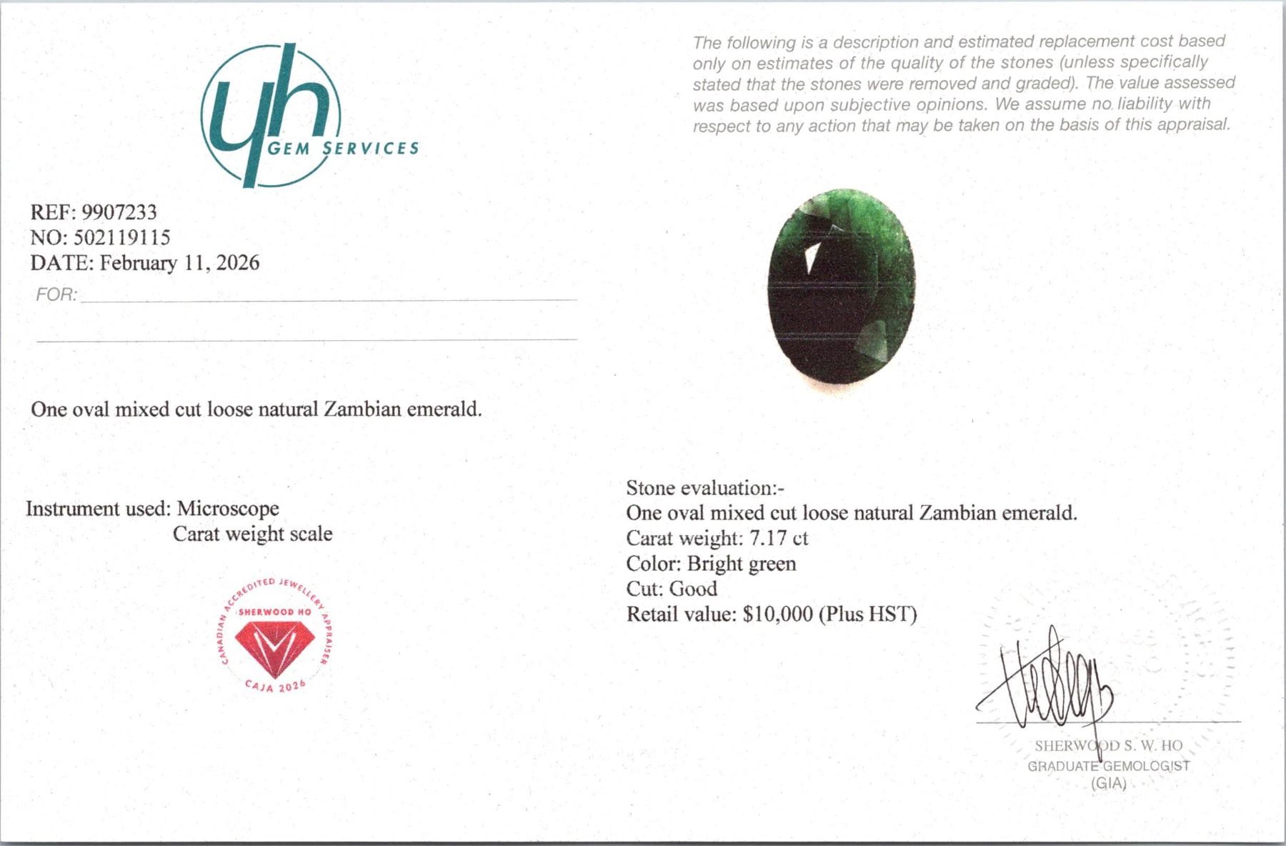 Lot 900 7.17 ct Certified Zambian Emerald gemstone ($10,000 Appraisal)
