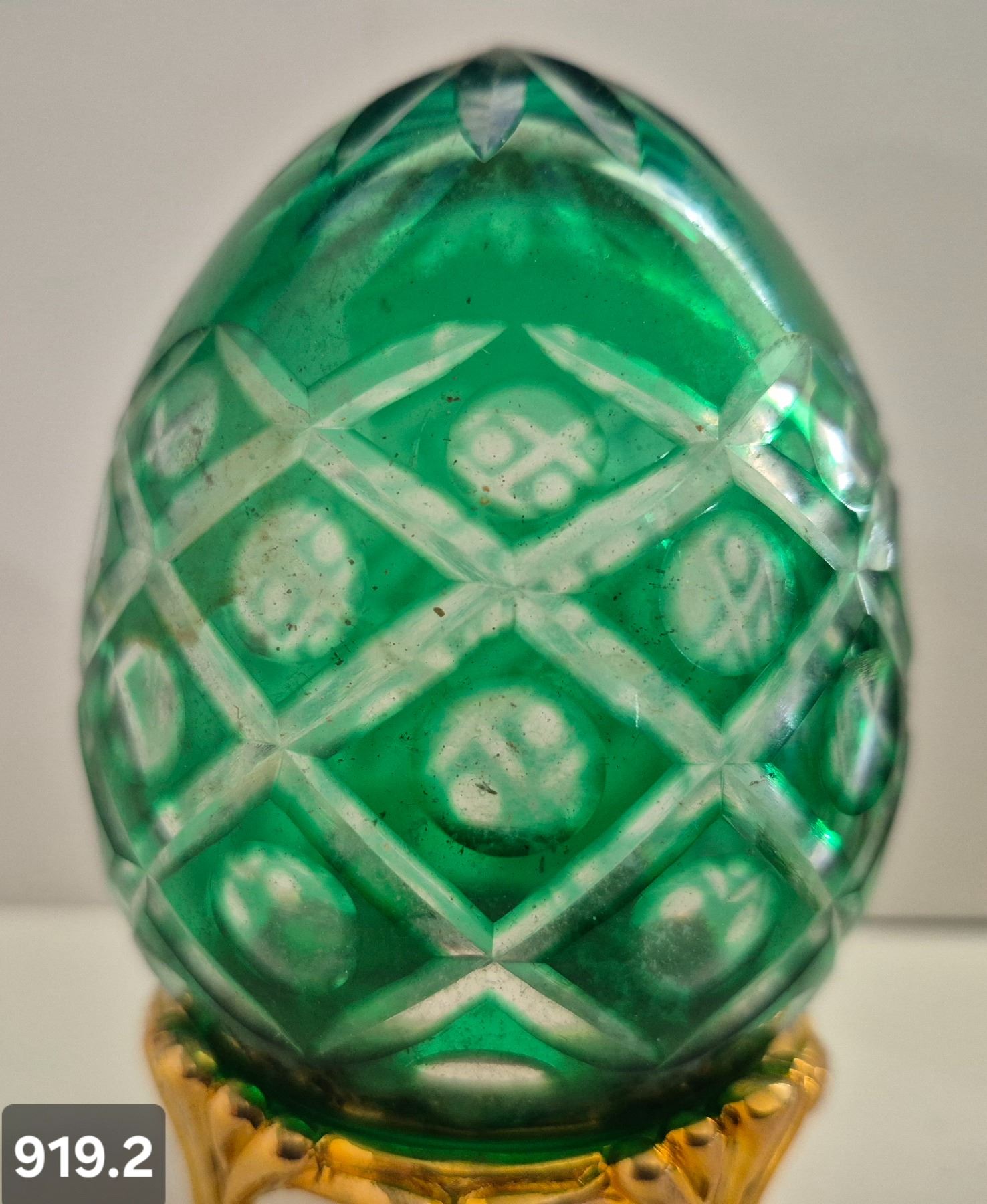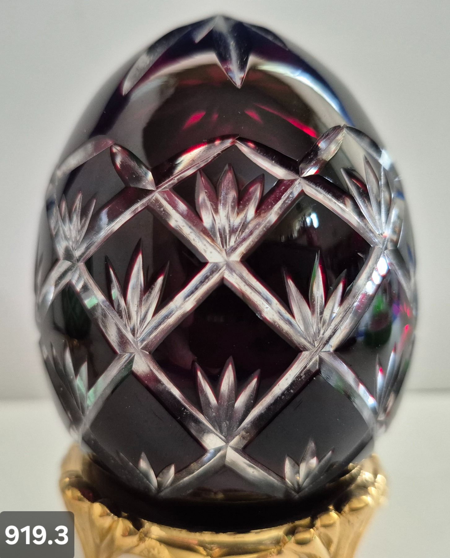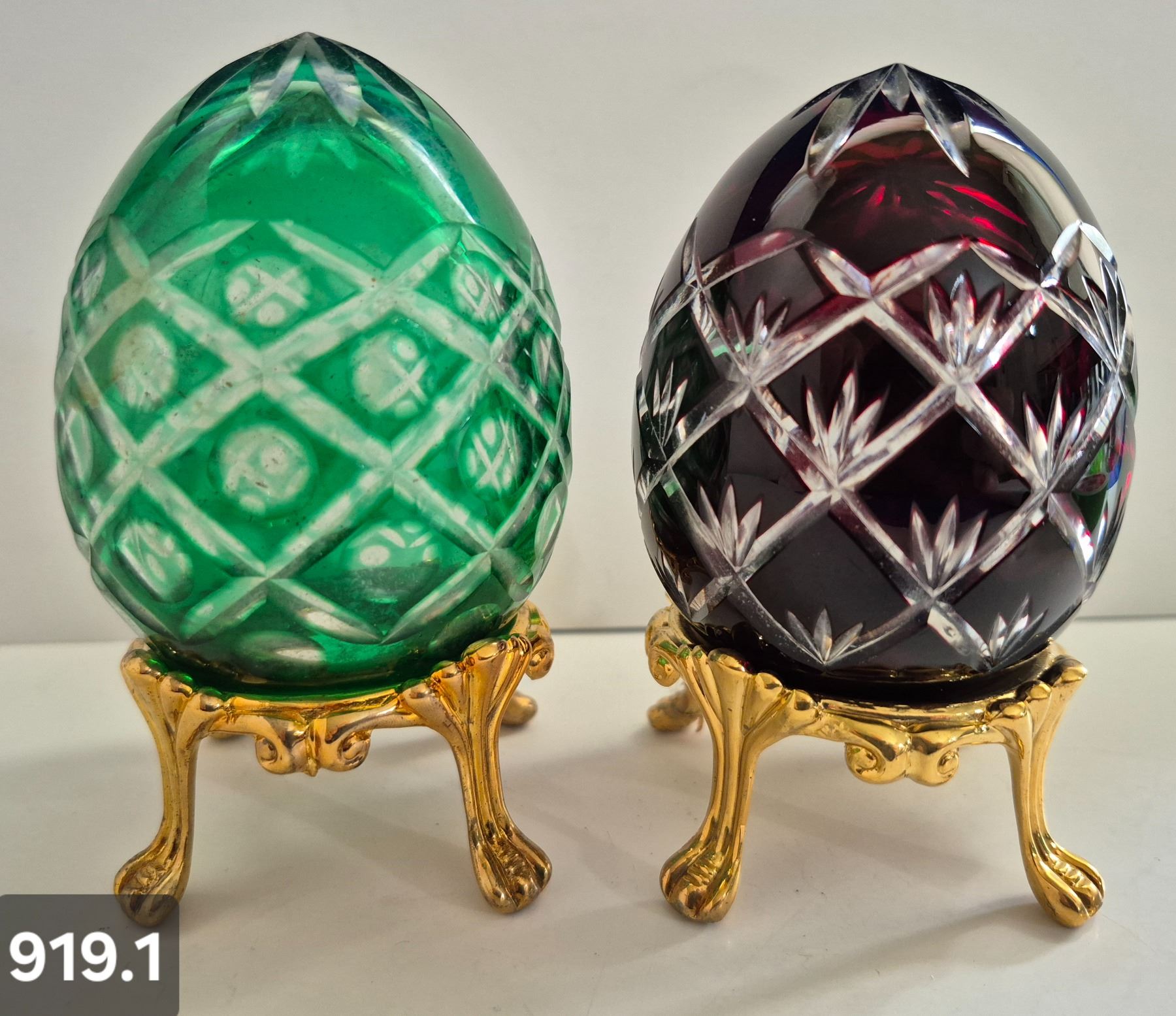 919. Pair of Bohemian cut glass MCM eggs - 24k gold-plated stand, from a large collection