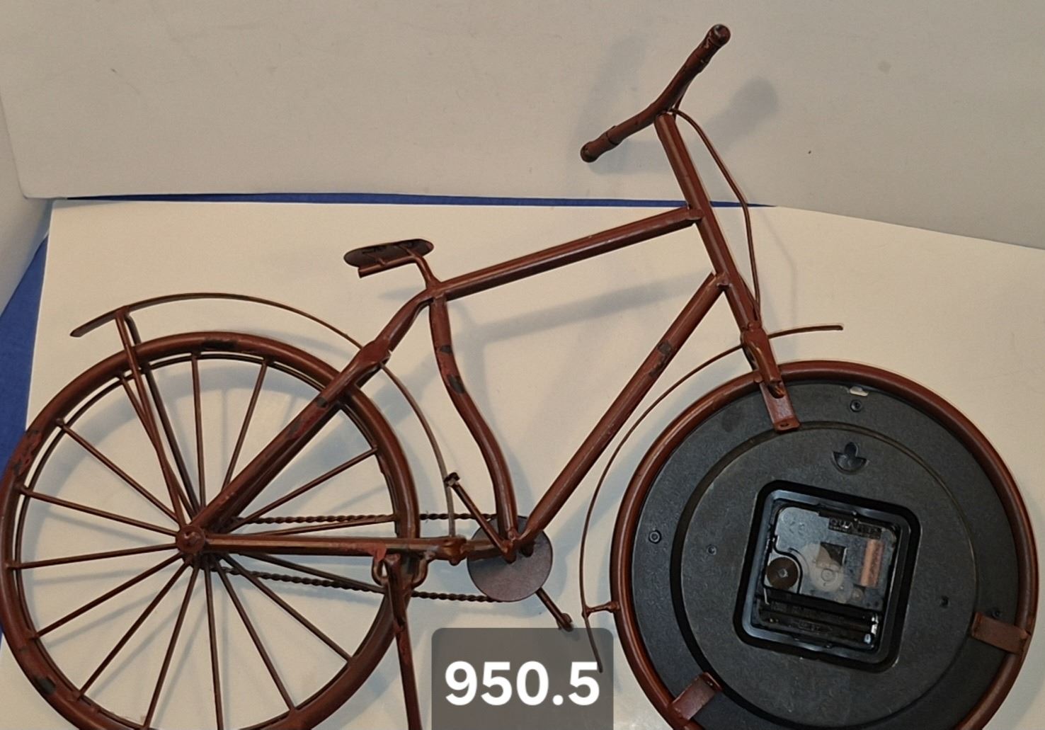 950. Vintage metal art bicycle with clock, with a working kick stand, 19 inches long