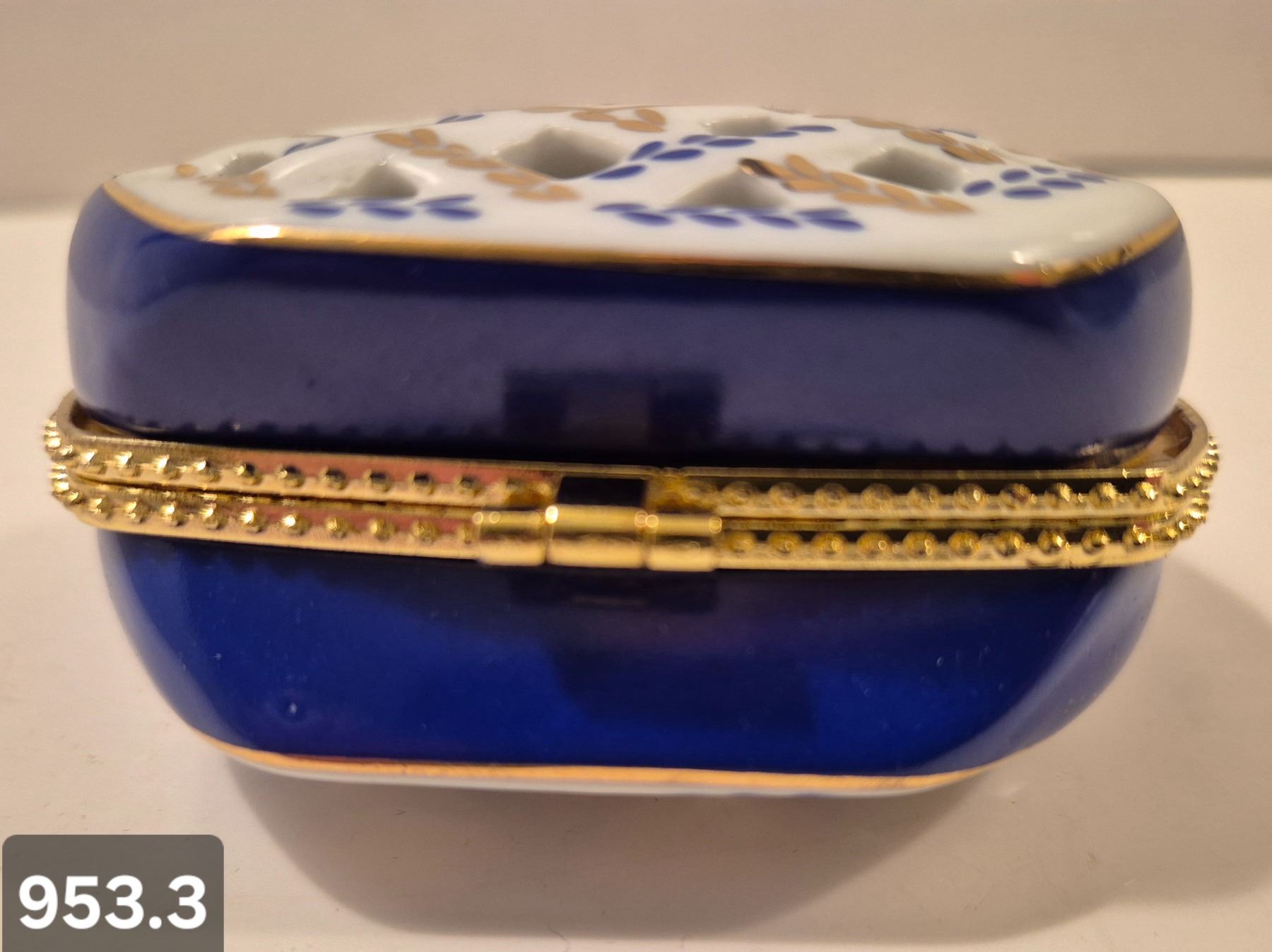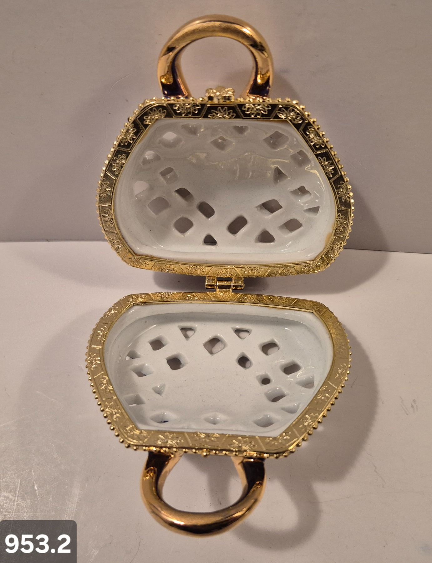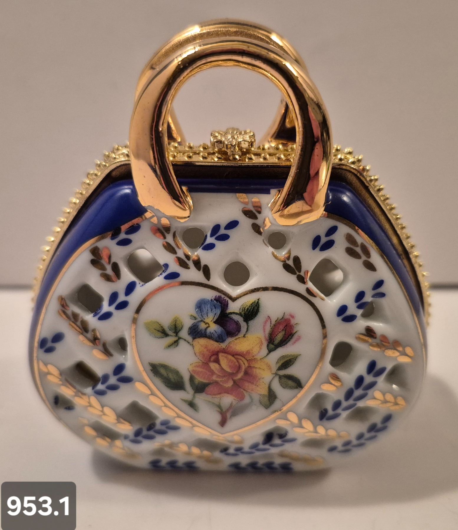 Lot 953 953. Vintage miniature porcelain purse (handbag), approx. 3 1/4 by 3 inches, 22k gold-plated trim