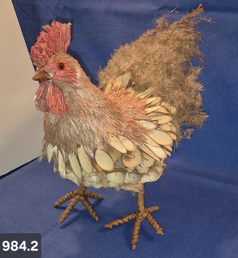984. Large folk art rooster, made mainly of natural materials, steel legs and feet, 12 1/2 inches tall