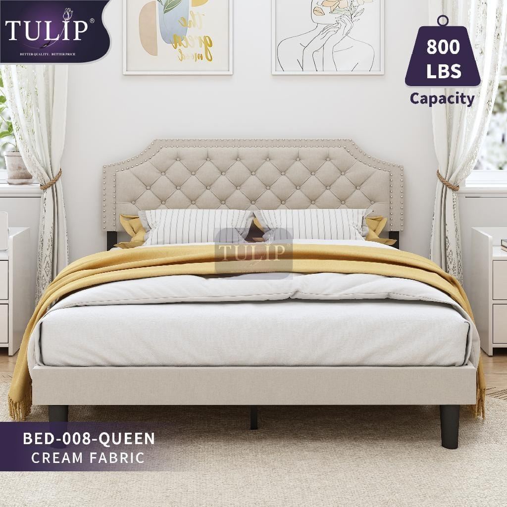 Brand new Tulip Bed frames- New in Box (Cream Fabric) Size- 008 Queen Retail Price- 450