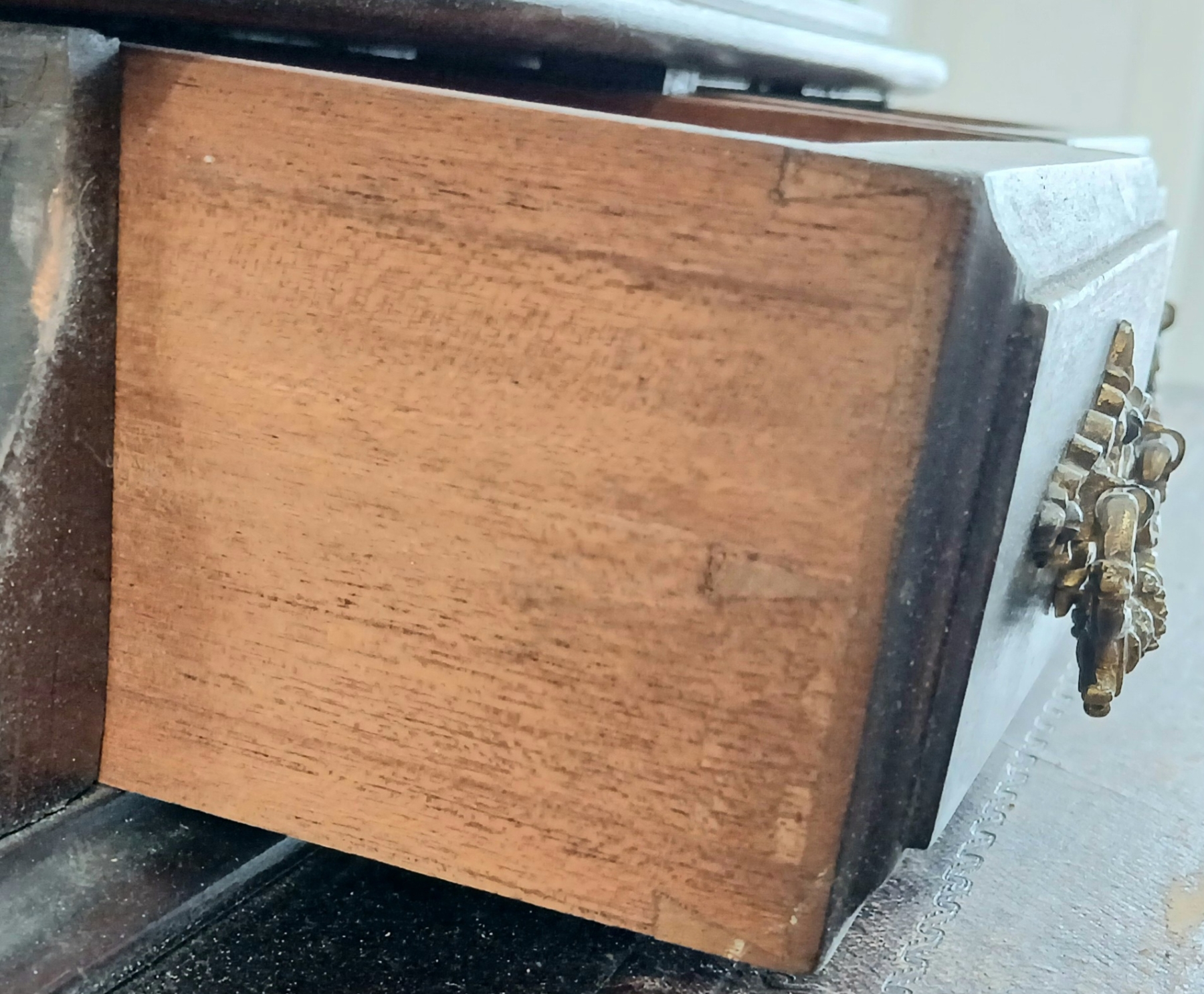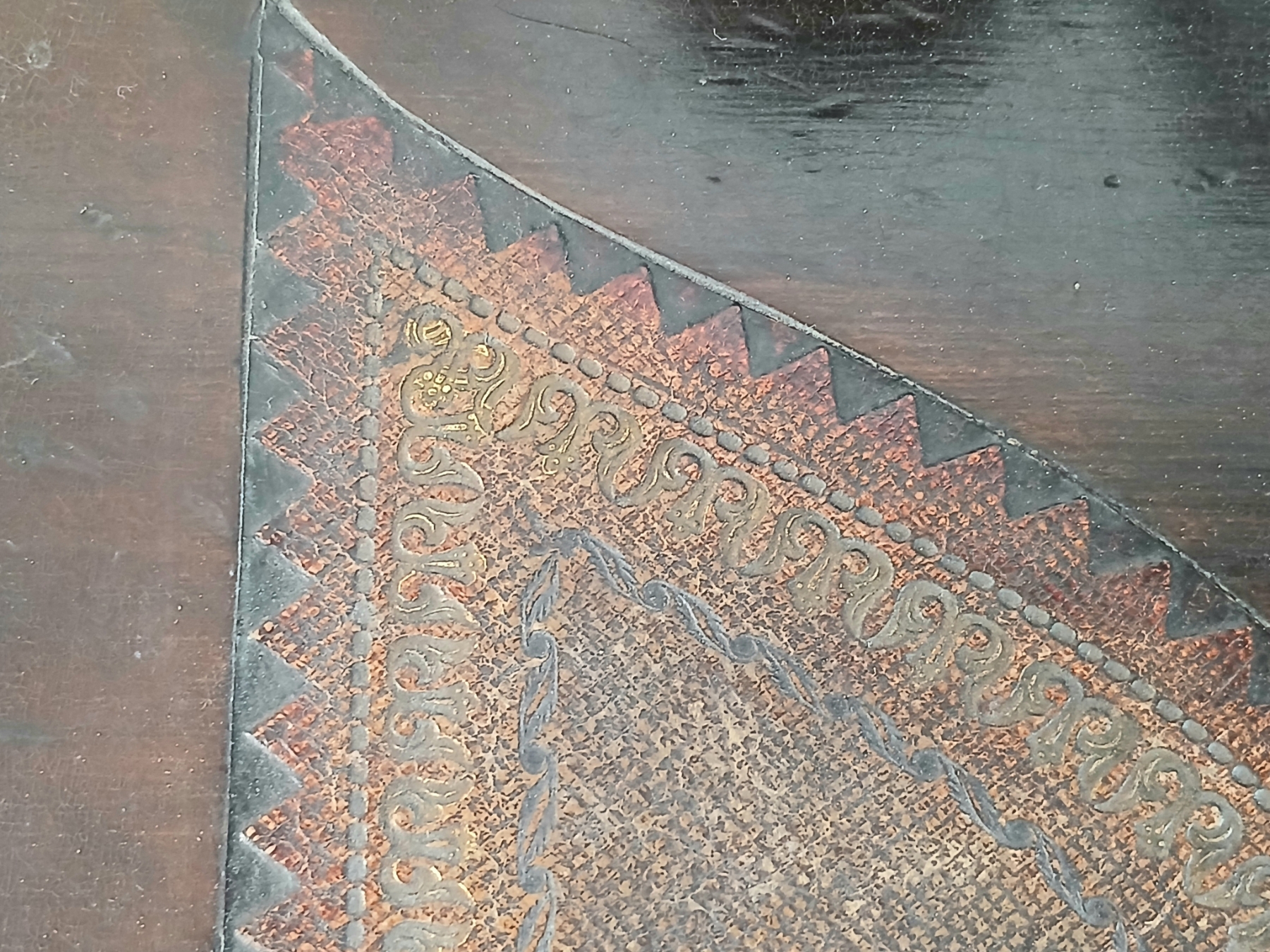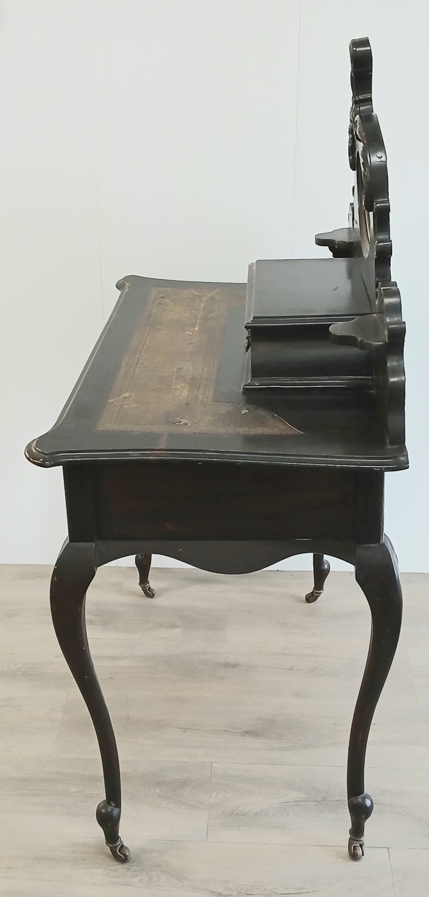 NOTE: 19 X 36 X 48IN - LEATHER & GOLDLEAF DESK OVERLAY - SIGNS OF WEAR - SEE ALL PICS - DOVE TAILED DRAWERS - ON WHEELS - SHIPPING TO BE ARRANGED BY BIDDER.
