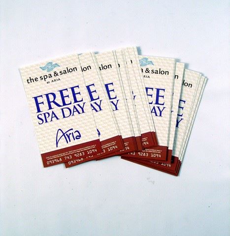 Screen used, stack of Aria Hotel "Free Spa Day" paper coupons. (approx. 6" x 3 1/2" each) This coupon is a prop and has no value at Aria.