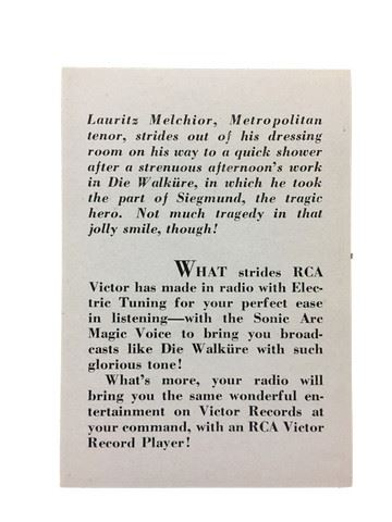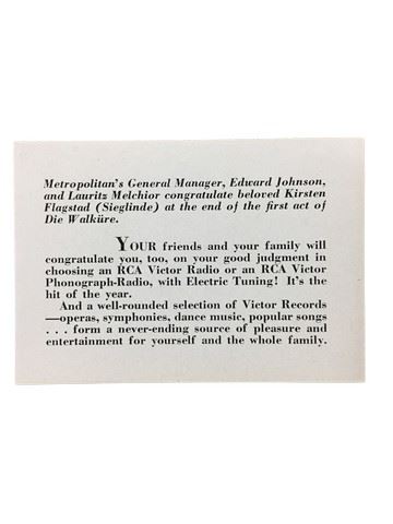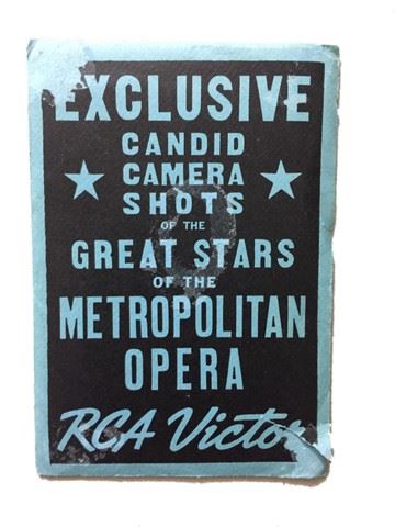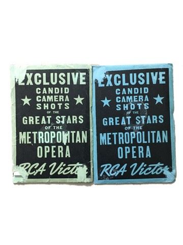 Two sets of rare and vintage promotional items (~24) from the Metropolitan Opera ca. 19th Century (approx. 4 x 3 in). These are exclusive candid camera shots of the Great Stars of the Metropolitan Opera, RCA Victor stars of the opera Die Walküre and La Traviata. These rare black and white photographs are printed on paper and verso is a caption about the image. There are images of famous stars as well as images of those connected with the productions such as: "Die Walkure" with Lucrezia Bori, Milton Cross, Kirsten Flagstad, Ludwig Hofmann, Lauritz Melchior, Friedrich Schorr, Jose Ituri (conductor). The stars and those connected with the production of "La Traviata" are Vina Bovy, Lucielle Browning, Nino Martini, Ettore Panizza (conductor), John Charles, Thomas, Thelma Votipka. All camera shots are in very good condition and come in the original blue and green envelopes. There is water damage, holes and tears to the envelopes. Flaps are missing. Printed on the envelope of La Traviata is “Form 2697 and Printed in the U.S.A. “ Printed on the information card and the envelope of Die Walküre is “Form 2698 and Printed in the U.S.A.“
