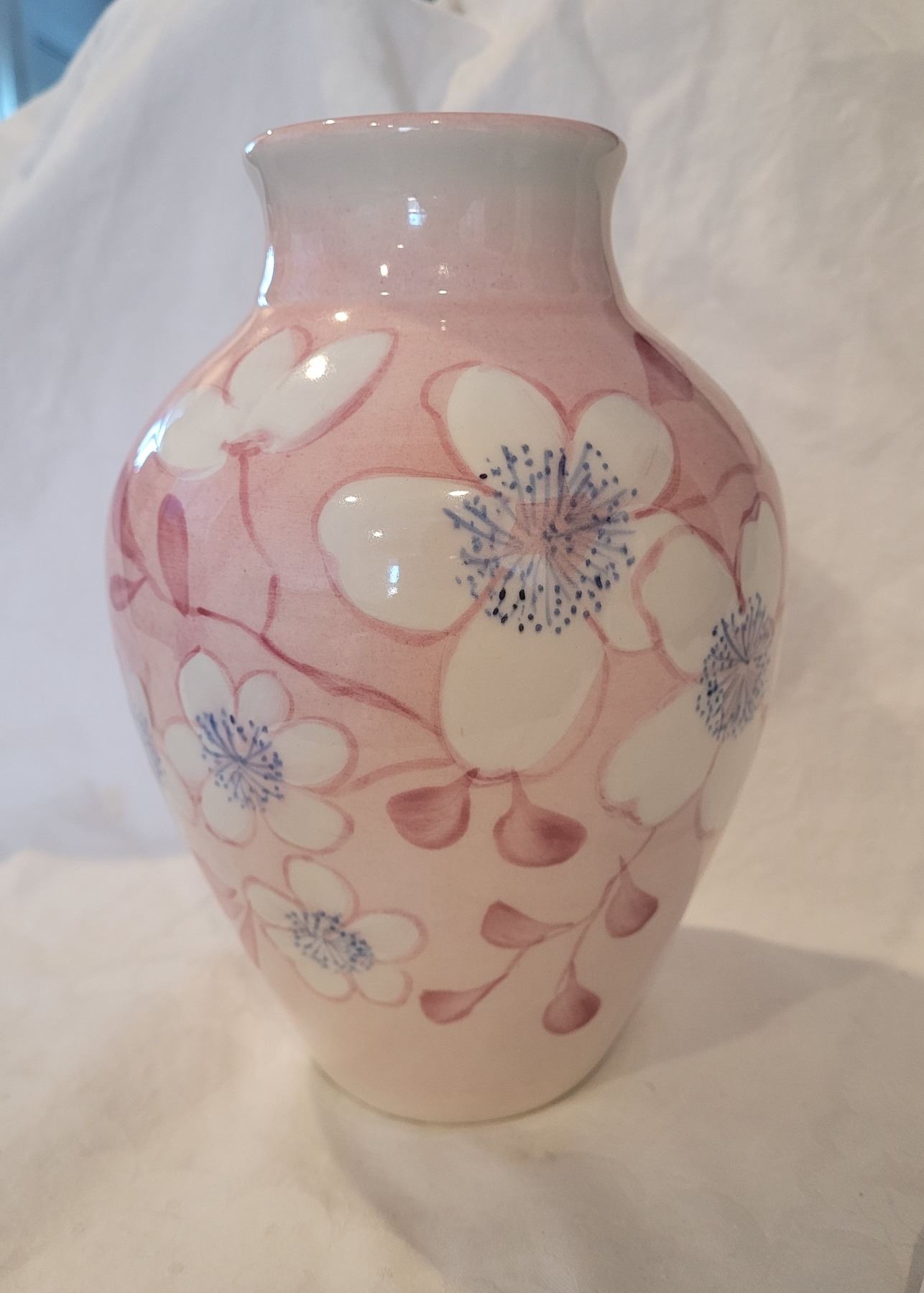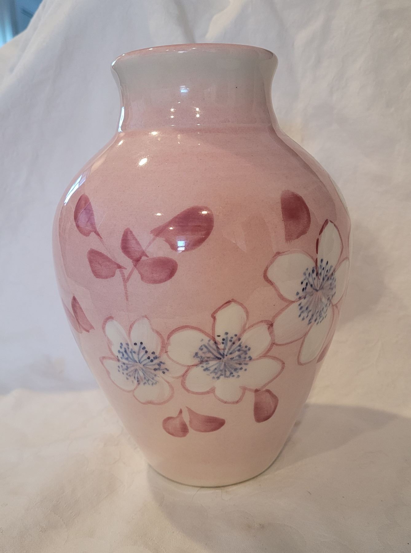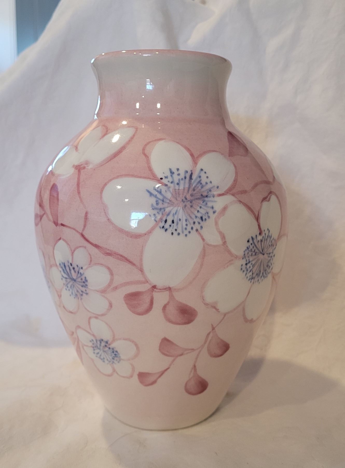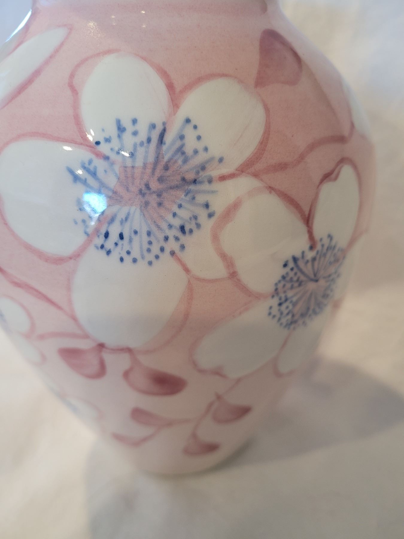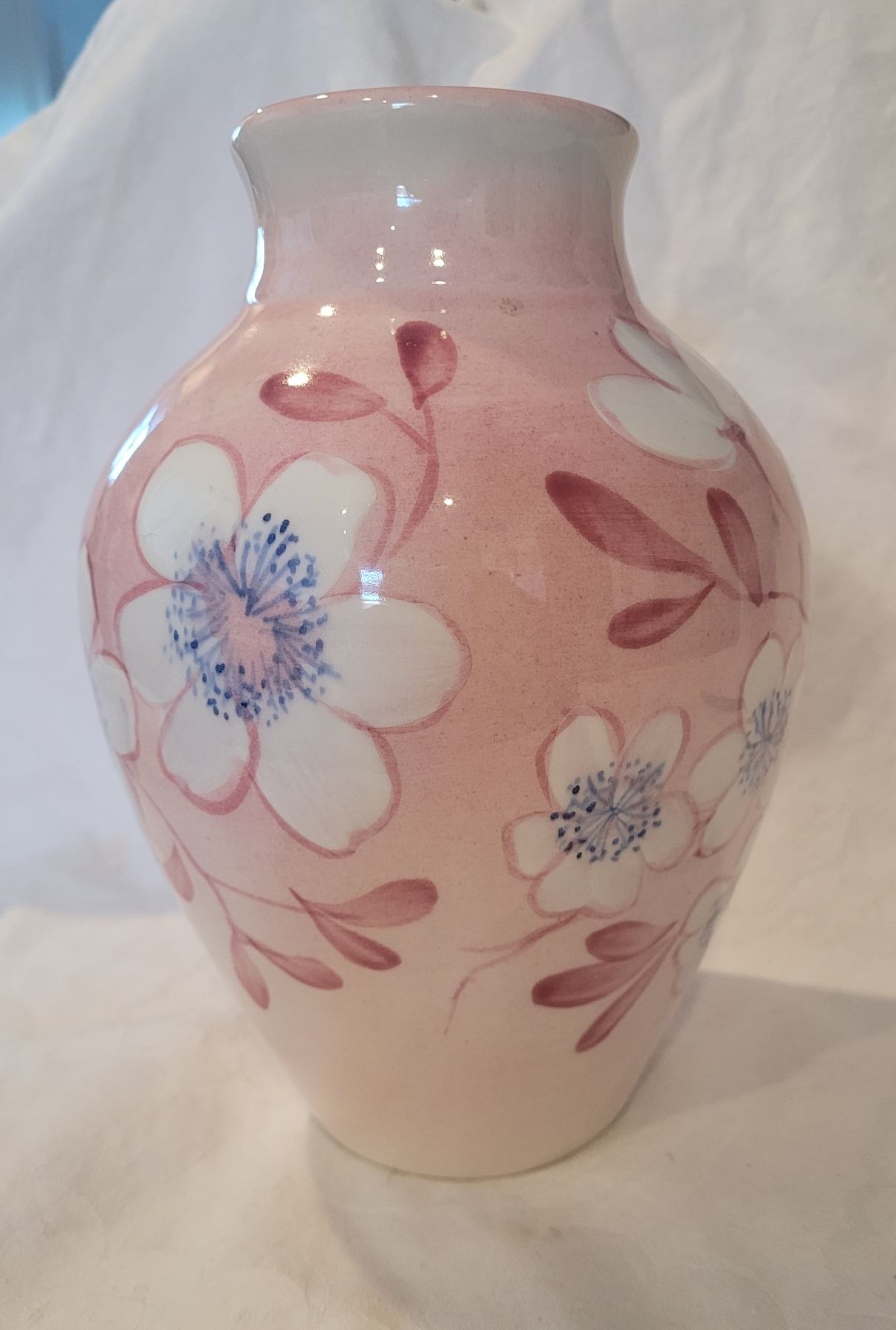 Pink ceramic vase with flowers - 8" tall - beautifully hand painted and glazed