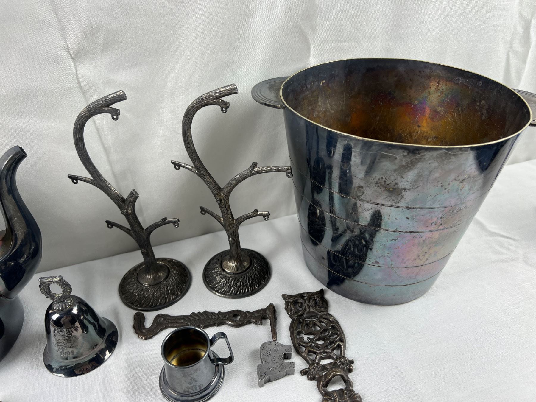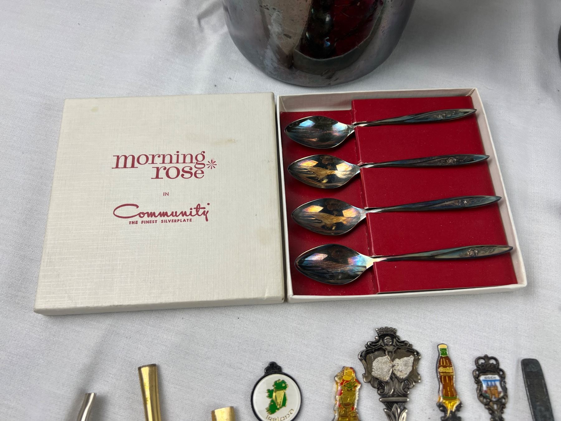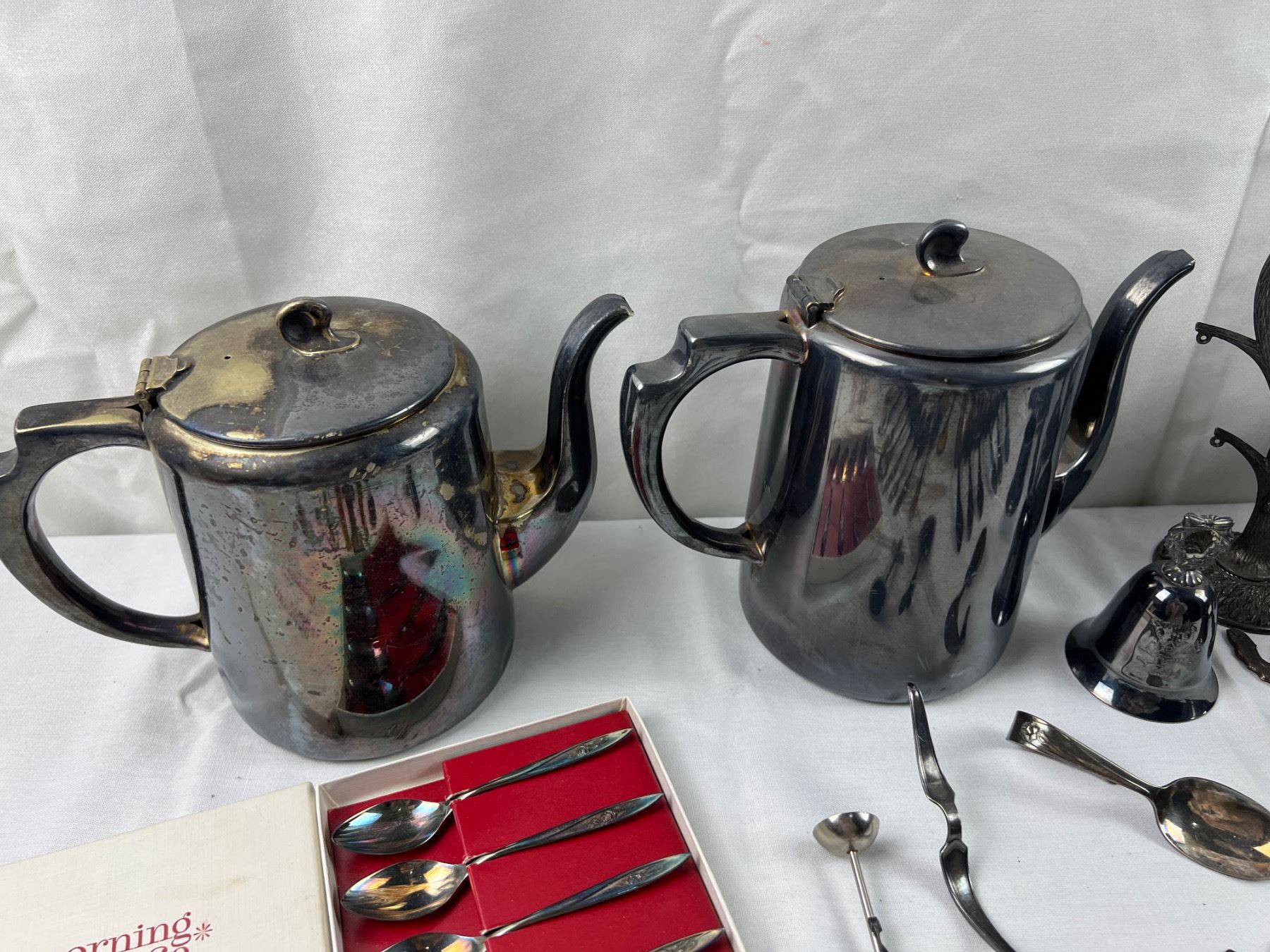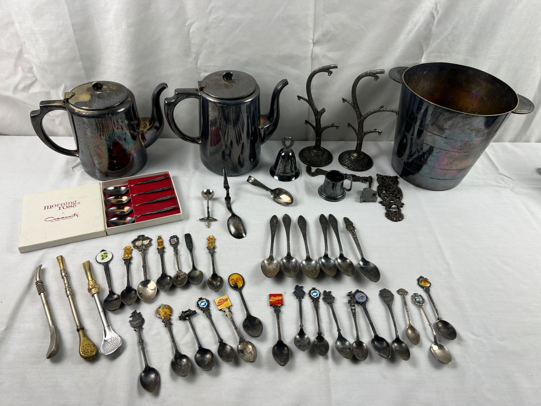 Includes two Marlboro Plate teapots By Morton Parker as well as an ice bucket (7"H), Morning Rose by Community spoons, Five "Pat 1912 Sterling" spoons, and more
