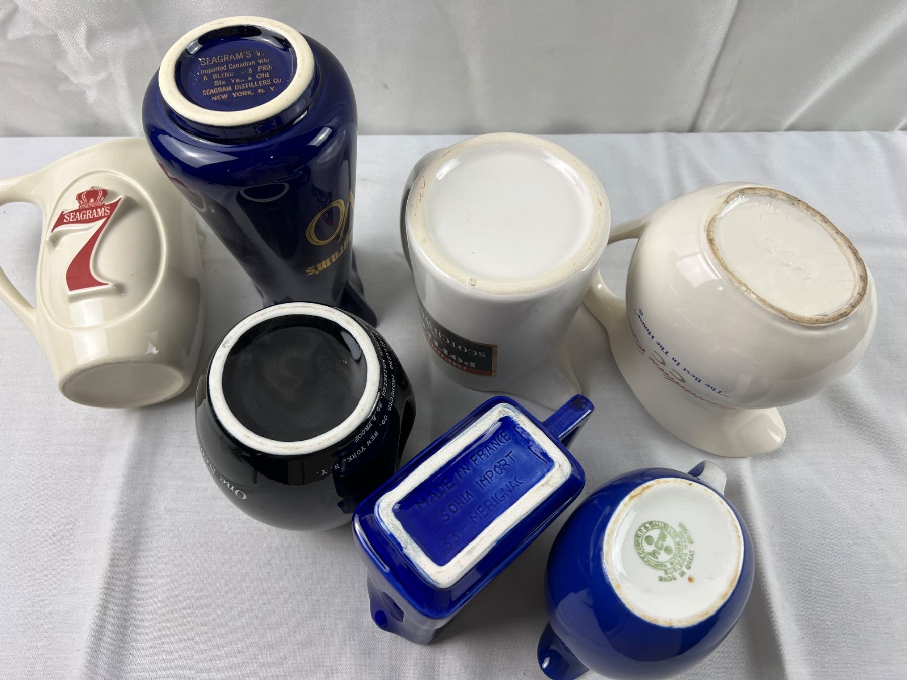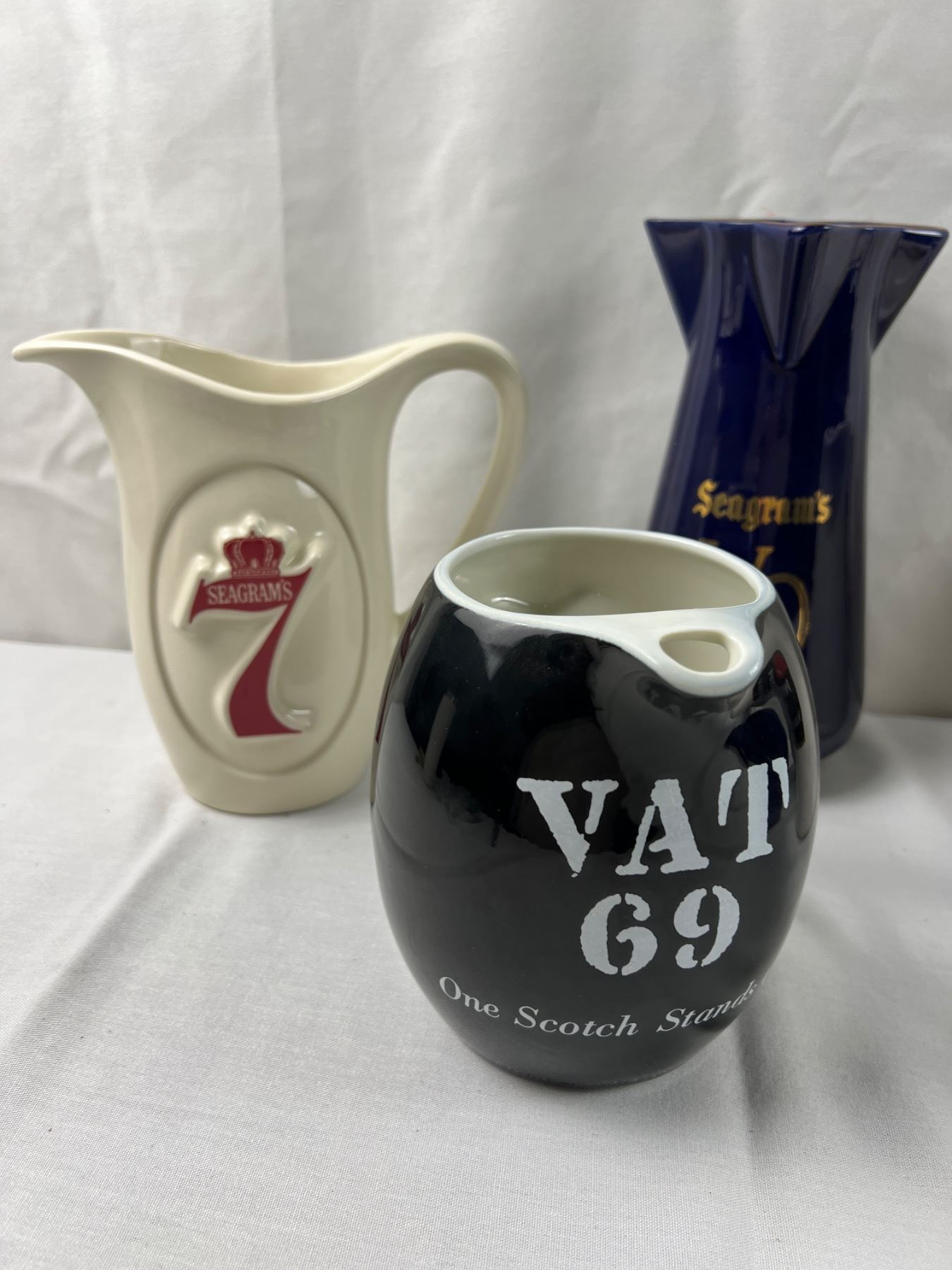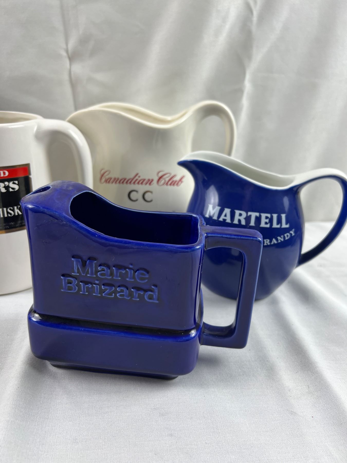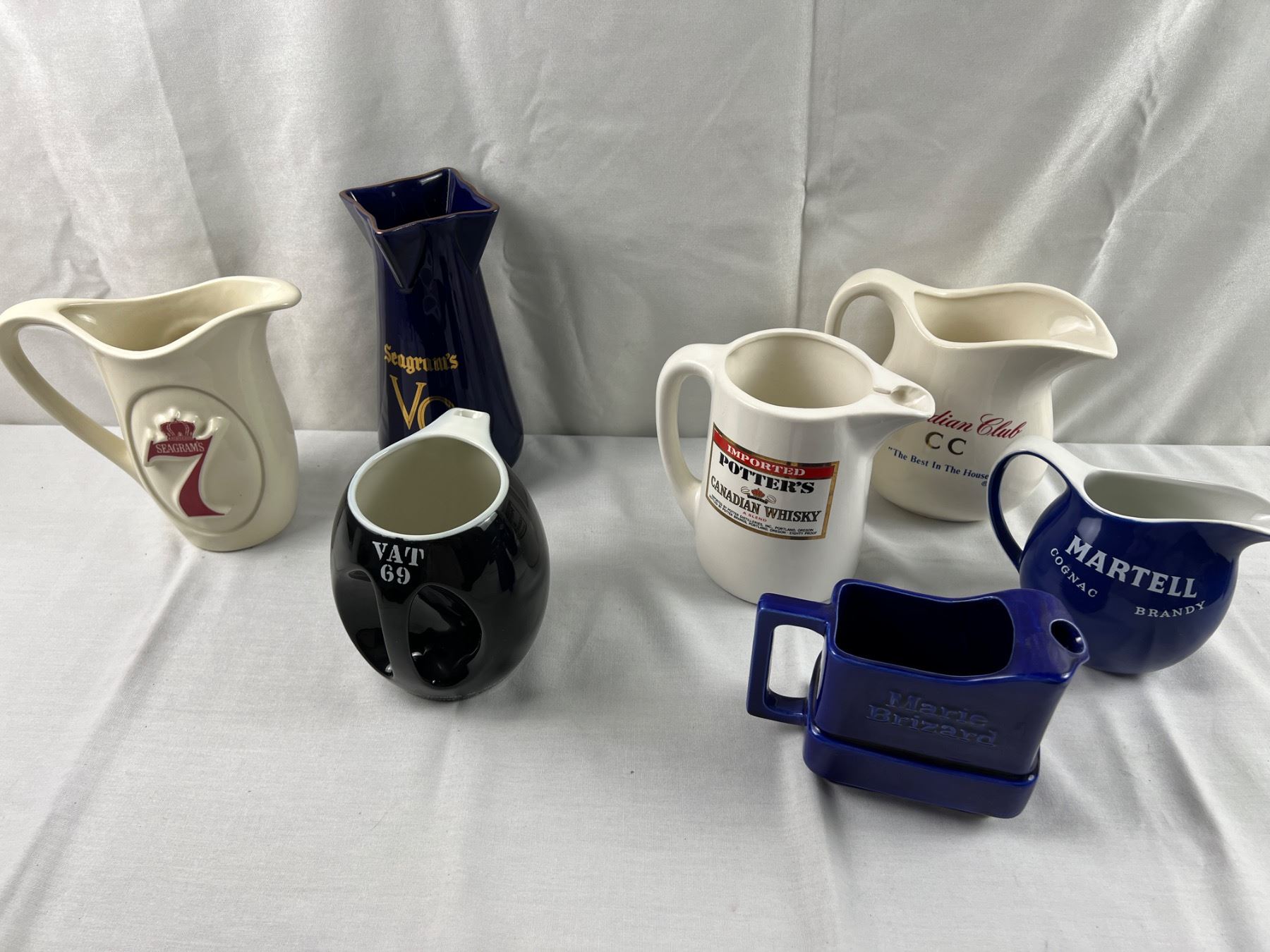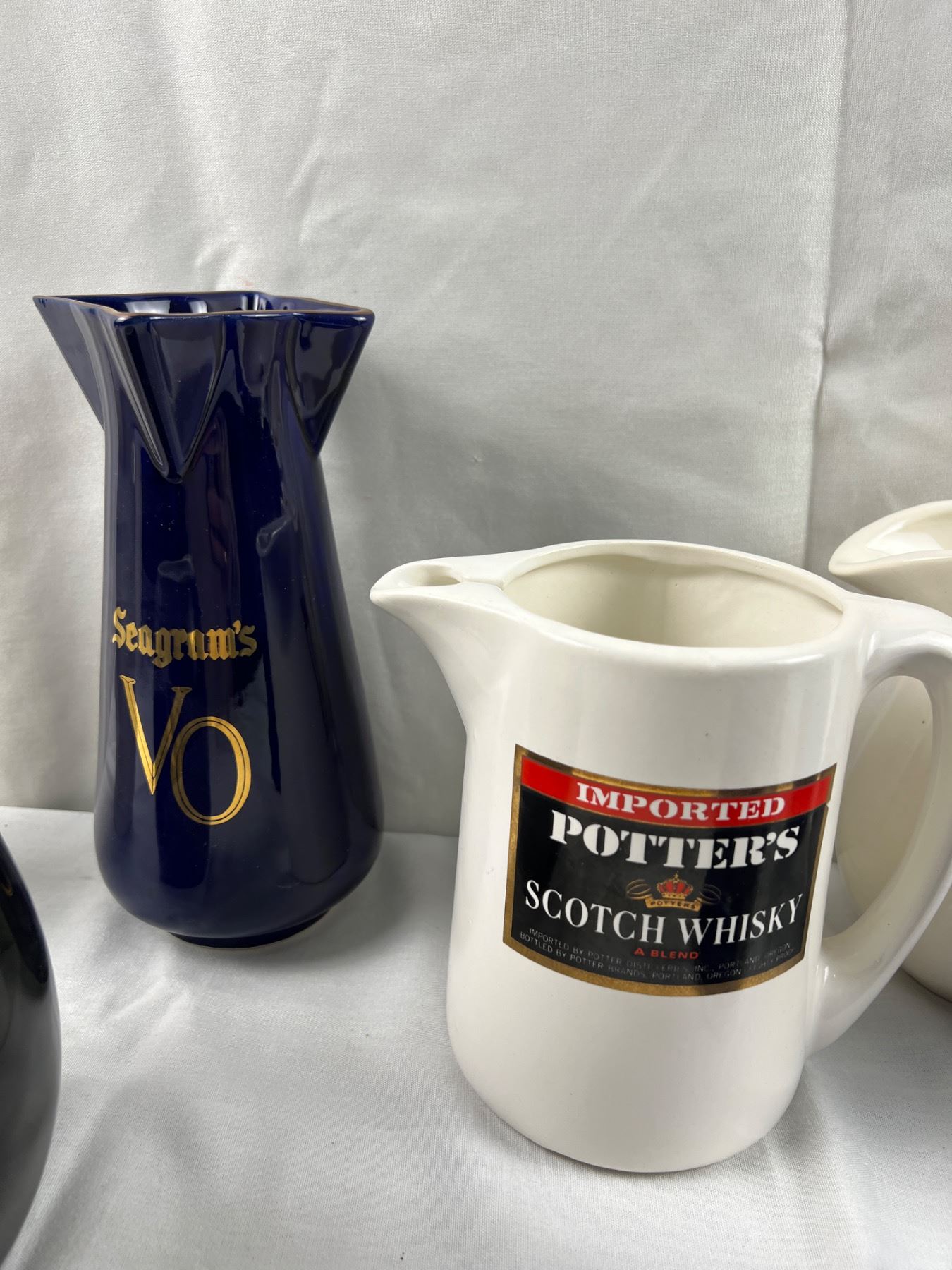 Includes Canadian Club, Seagrams, Vat 69, and more, The blue Seagrams pitcher is 9"H
