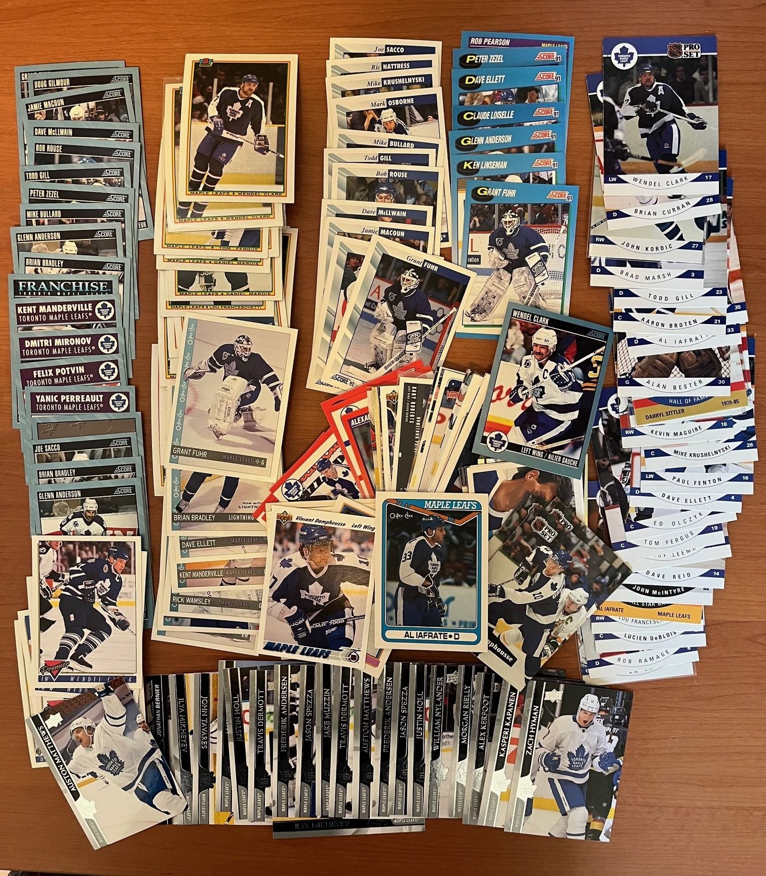 Toronto Maple Leafs lot of 175ish hockey cards. Clark. Fuhr. 2020 UD with Austin Mathews card. Mixed Brands. Mixed Years. Some duplicates.