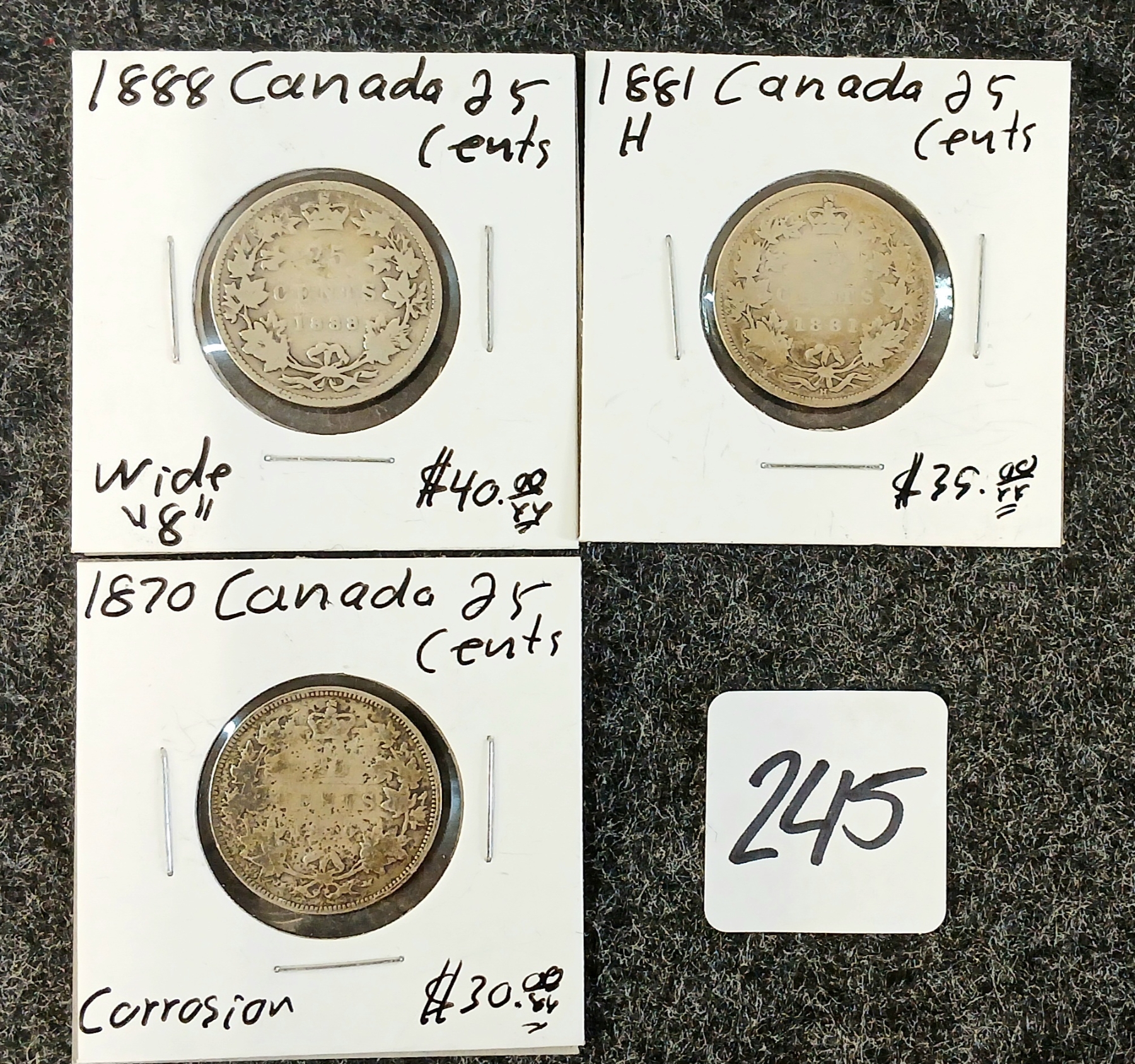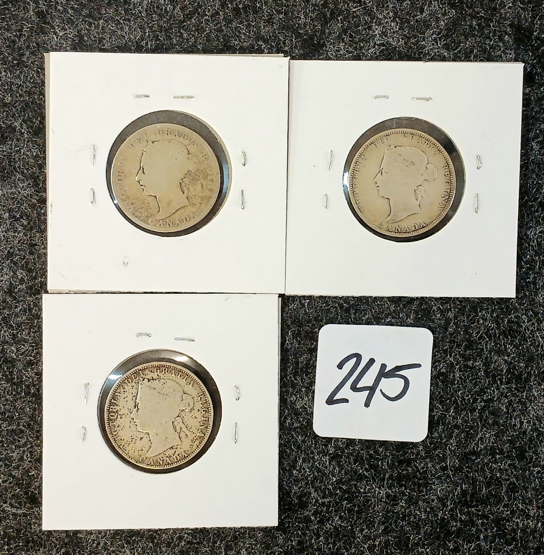 Lot 245 LOT OF 3 - 1870, 1881 & 1888 CDN 25 CENT SILVER COINS