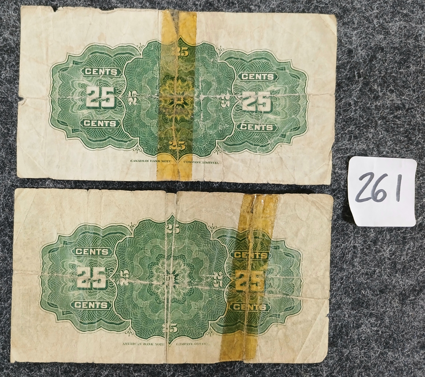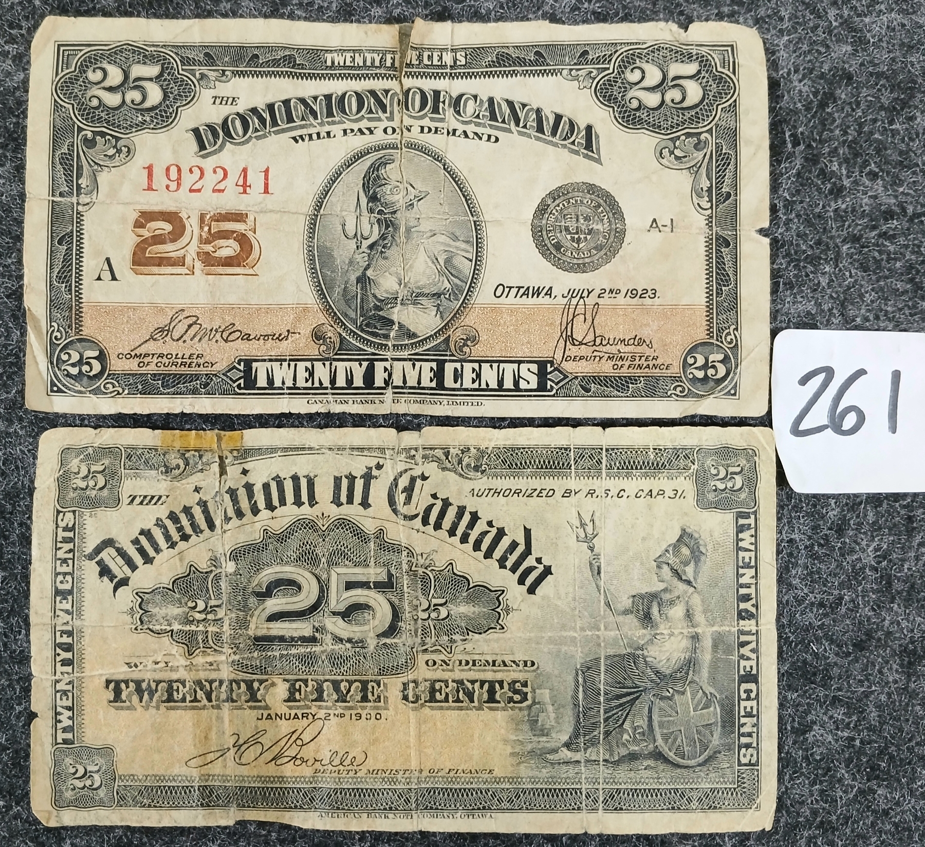 Lot 261 LOT OF 2 - 1900 & 1923 DOMINION OF CANADA 25 CENT SHINPLASTER BANKNOTES